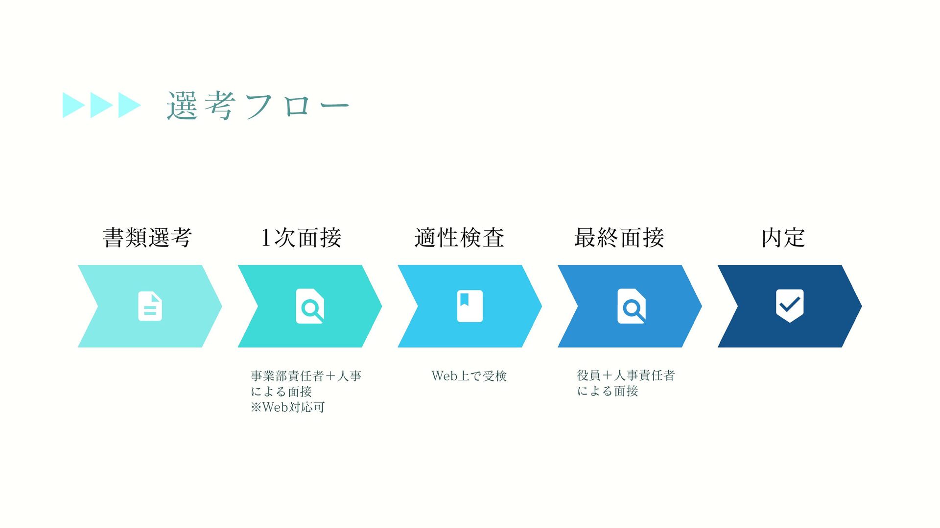 書類選考 1次面接 適性検査 事業部責任者+人事 による面接 ※Web対応可 最終面接 Web上で受検 役員+人事責任者 による面接