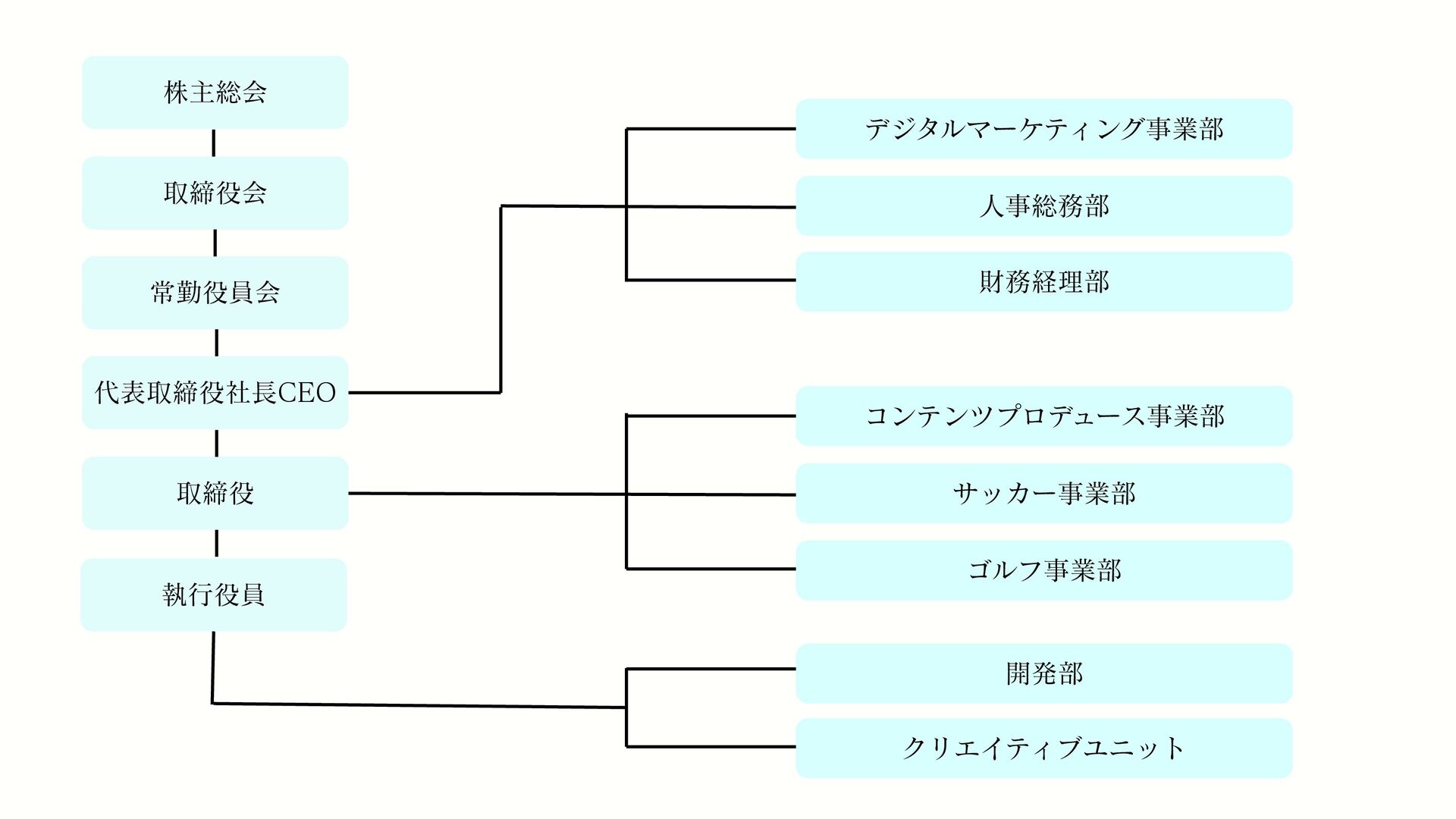 株主総会 取締役会 常勤役員会 代表取締役社長CEO 取締役 執行役員 デジタルマーケティング事業部 人事総務部 財務経理部 コンテンツプロデュース事業部