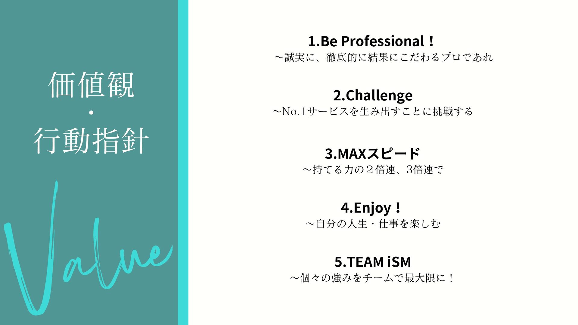 〜持てる力の2倍速、3倍速で 4.Enjoy! 〜自分の人生・仕事を楽しむ 5.TEAM iSM 〜個々の強みをチームで最大限に!