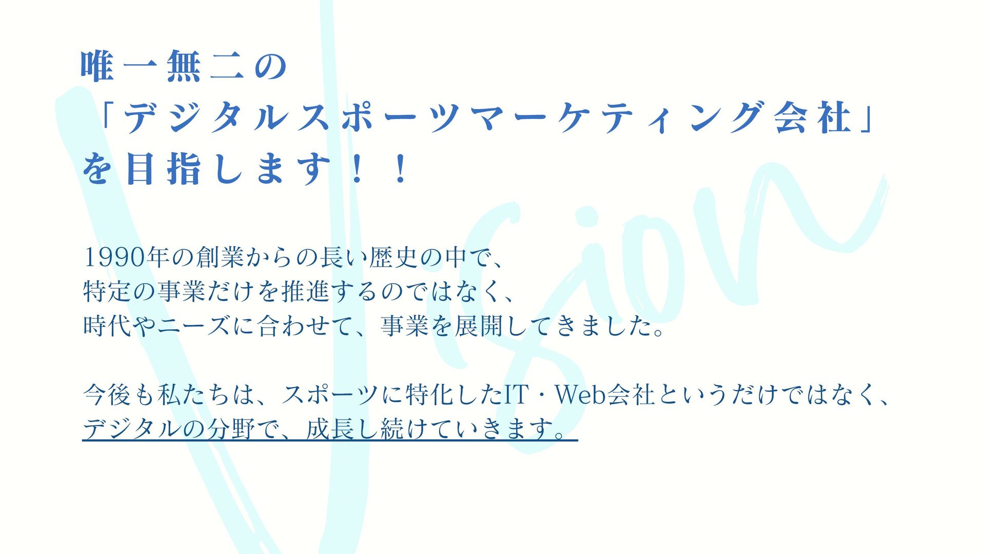 ル ス ポ ー ツ マ ー ケ テ ィ ン グ 会 社 」 を 目 指 し ま す ! ! 1990年の創業からの長い歴史の中で、 特定の事業だけを推進するのではなく、 時代やニーズに合わせて、事業を展開してきました。 今後も私たちは、スポーツに特化したIT・Web会社というだけではなく、 デジタルの分野で、成長し続けていきます。