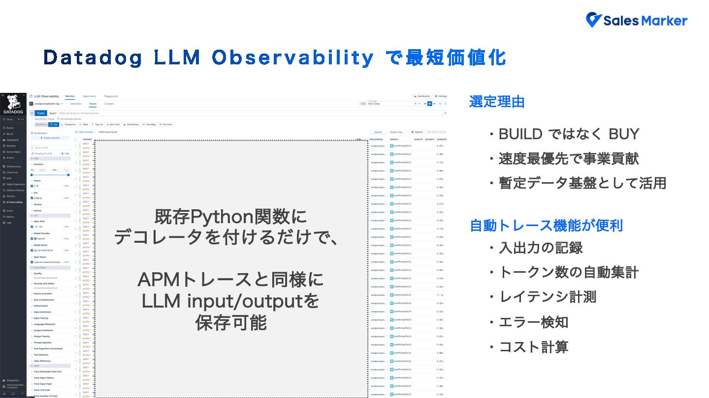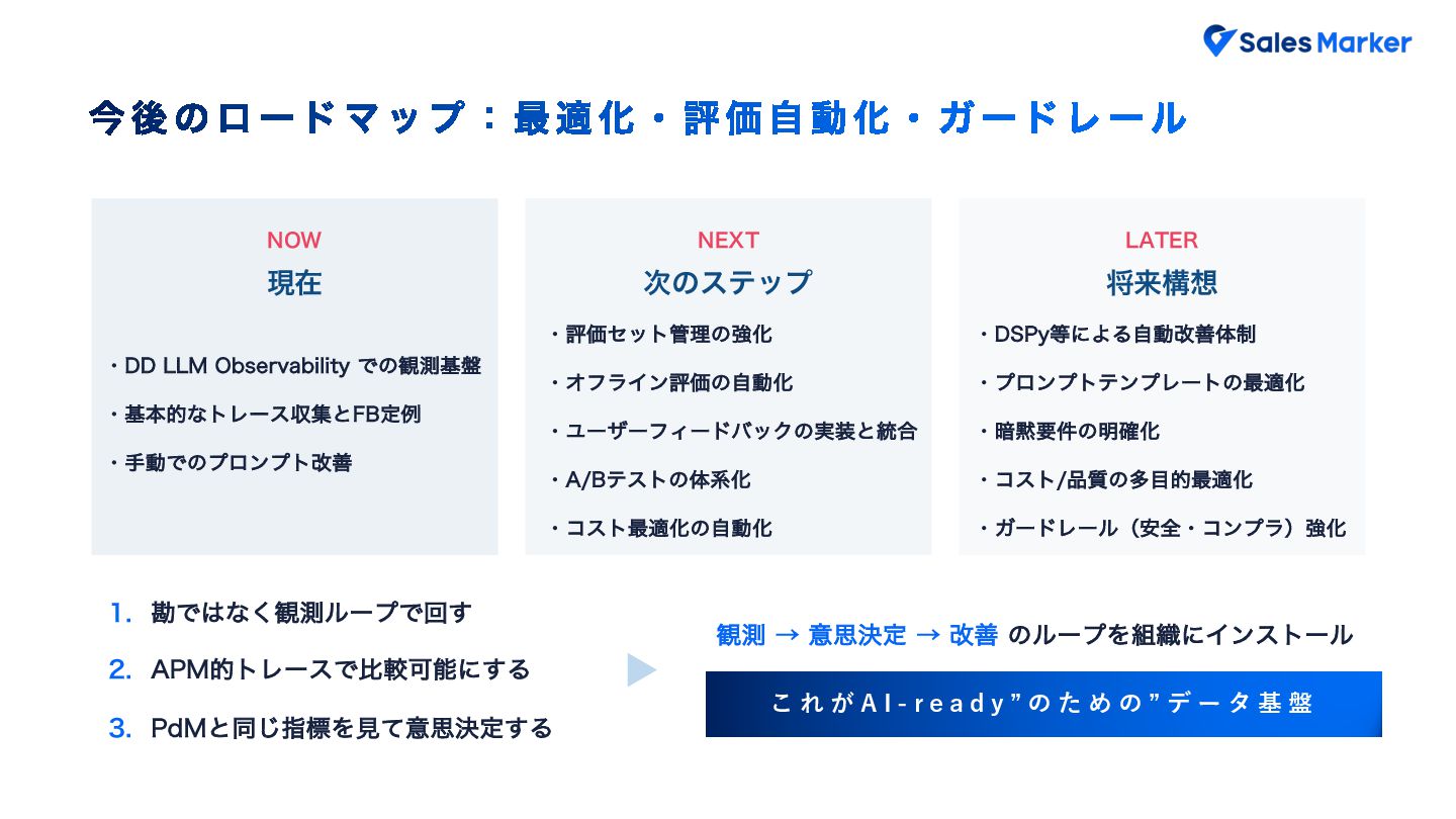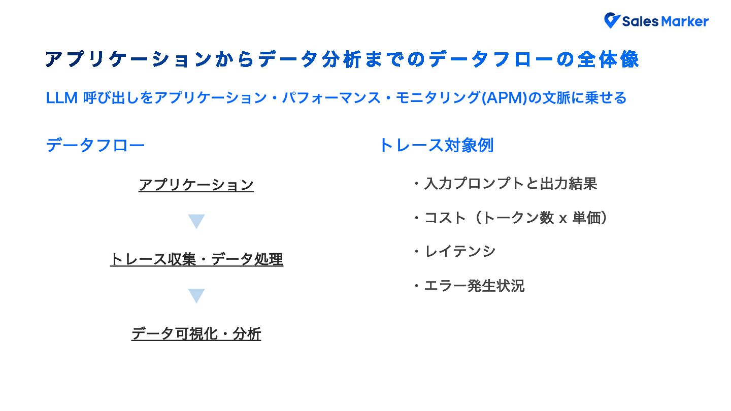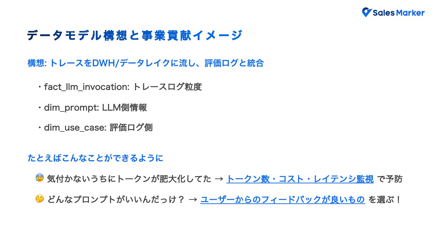 このソリューションはデータ・AIエンジニア主導でLLMの適切なログを取り、現状を計測可能にすることでBizとの架け橋を作りOpsを安定させることである。弊社の取り組み事例(一部計画中)を紹介する。