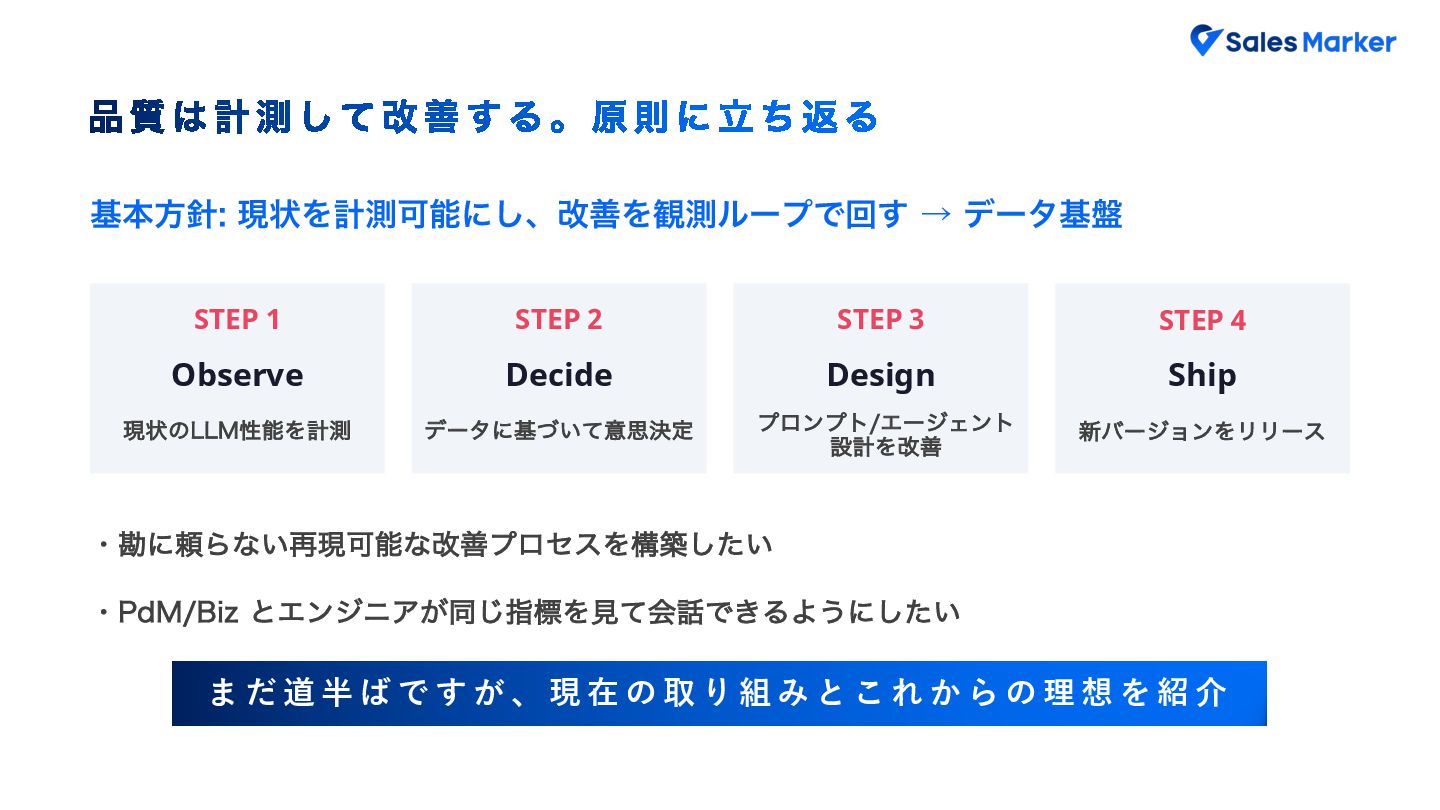 STEP 3 Design ϓϩϯϓτΤʔδΣϯτ ઃܭΛվળ STEP 4 Ship ৽όʔδϣϯΛϦϦʔε ɾצʹཔΒͳ͍࠶ݱՄೳͳվળϓϩηεΛߏங͍ͨ͠ ɾ1E.#J[ ͱΤϯδχΞ͕ಉ͡ࢦඪΛݟͯձ࿩Ͱ͖ΔΑ͏ʹ͍ͨ͠ ま だ 道 半 ば で す が 、 現 在 の 取 り 組 み と こ れ か ら の 理 想 を 紹 介