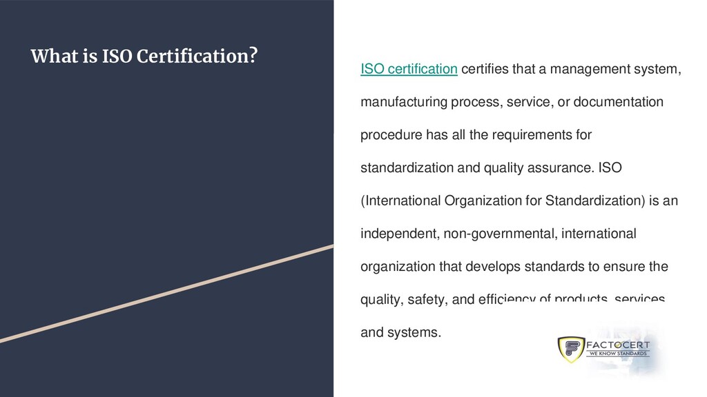 system, manufacturing process, service, or documentation procedure has all the requirements for standardization and quality assurance. ISO (International Organization for Standardization) is an independent, non-governmental, international organization that develops standards to ensure the quality, safety, and efficiency of products, services, and systems.