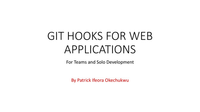 are prepared and controlled on the local version of a GIT repository for intercepting and modifying the behavior of events (i.e. push, commit, merge, rebase) for the benefit of adding more functionality to how GIT processes the codebase. These hooks are used for linting, spellchecking, copying and replacing files, running task runners, sending emails for patch review, style sta dard adhere e, ru i g lo al u it tests a d uild (if you do ’t a t to use paid CI (Continuous Integration) engines for testing and build). WEB HOOKS These are hooks that are prepared and controlled on remote GIT (GitHub). These hooks are used for auto ati uploads to a li e e ser er, ssh-ing i to a re ote ser er e.t.c. They are also referred to as HTTP callbacks.