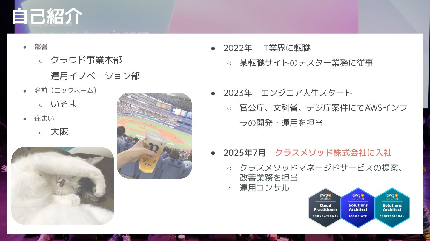 • 住まい ◦ 大阪 • 2022年 IT業界に転職 ◦ 某転職サイトのテスター業務に従事 • 2023年 エンジニア人生スタート ◦ 官公庁、文科省、デジ庁案件にてAWSインフ ラの開発・運用を担当 • 2025年7月 クラスメソッド株式会社に入社 ◦ クラスメソッドマネージドサービスの提案、 改善業務を担当 ◦ 運用コンサル