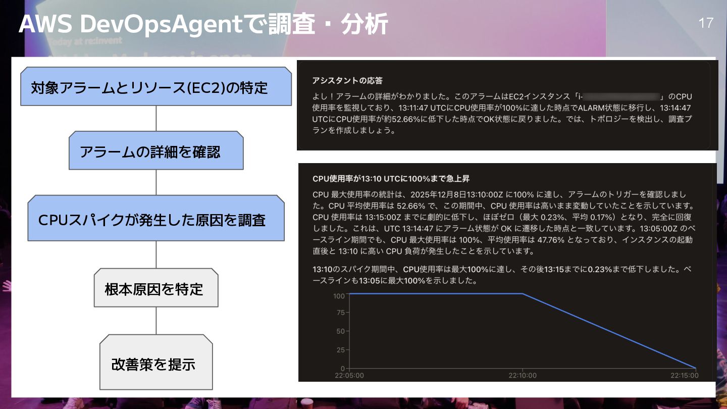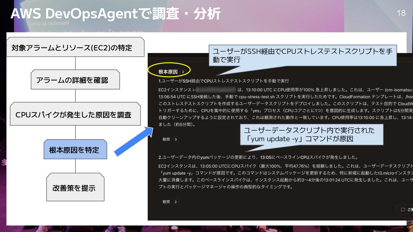 17 AWS DevOpsAgentで調査・分析 対象アラームとリソース(EC2)の特定 アラームの詳細を確認 CPUスパイクが発生した原因を調査 根本原因を特定 改善策を提示