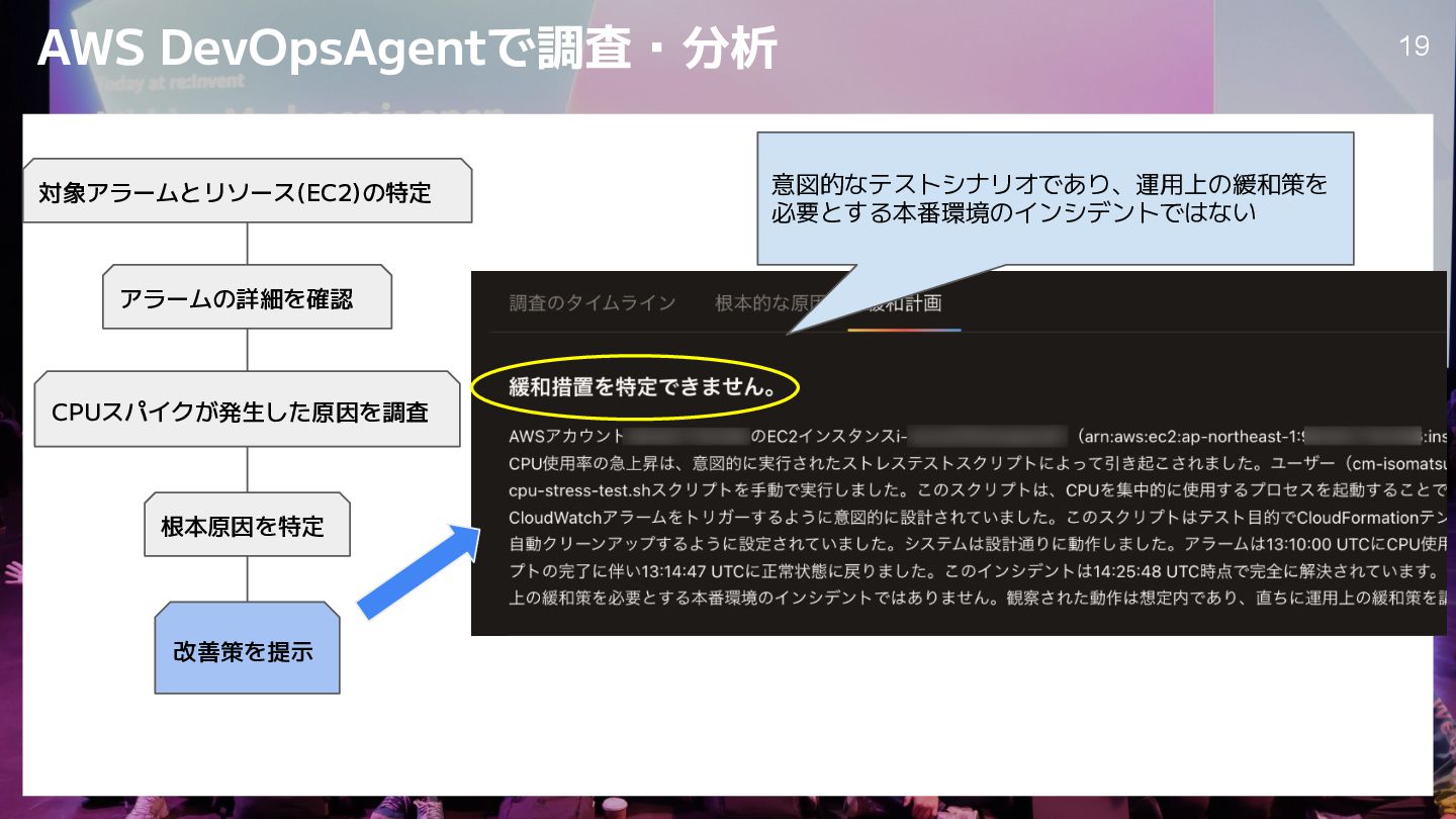 18 AWS DevOpsAgentで調査・分析 対象アラームとリソース(EC2)の特定 アラームの詳細を確認 CPUスパイクが発生した原因を調査 根本原因を特定 改善策を提示 ユーザーがSSH経由でCPUストレステストスクリプトを手 動で実行
