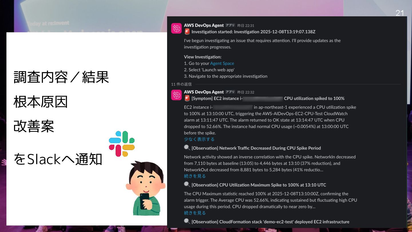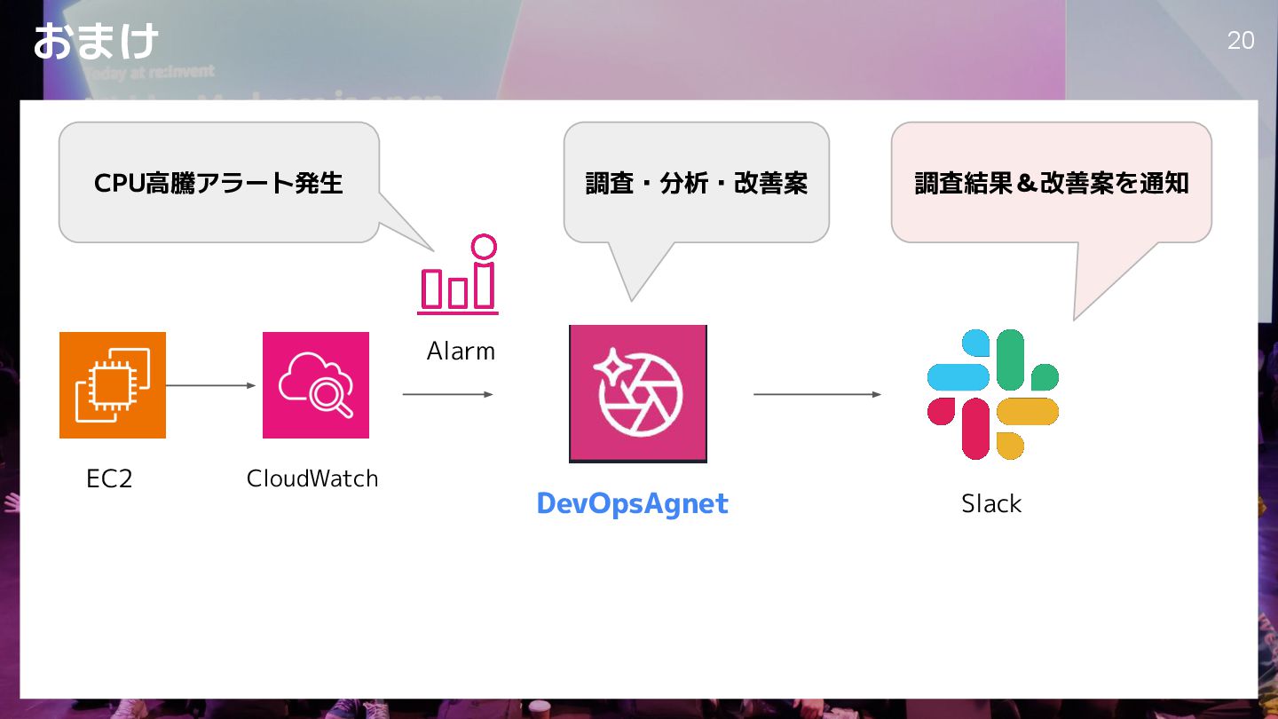20 EC2 CloudWatch Alarm Slack CPU高騰アラート発生 調査・分析・改善案 調査結果&改善案を通知 おまけ DevOpsAgnet