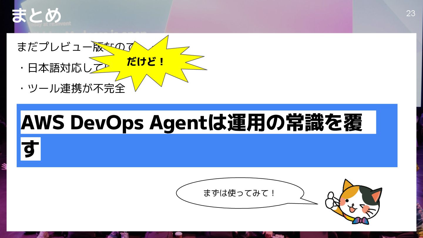 23 まだプレビュー版なので・・・ ・日本語対応していない ・ツール連携が不完全 まとめ AWS DevOps Agentは運用の常識を覆 す だけど!