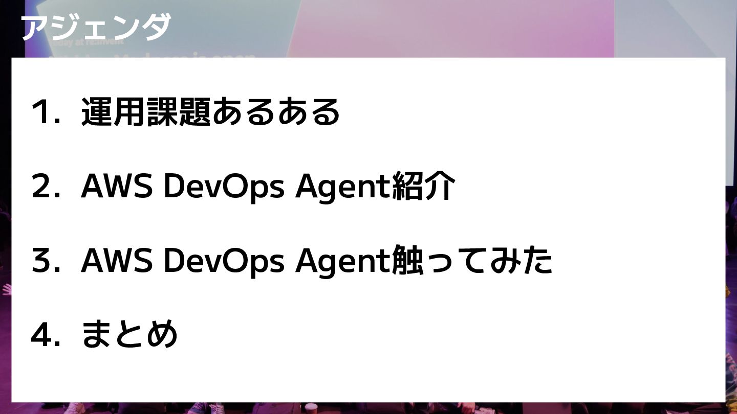 アジェンダ 1. 運用課題あるある 2. AWS DevOps Agent紹介 3. AWS DevOps