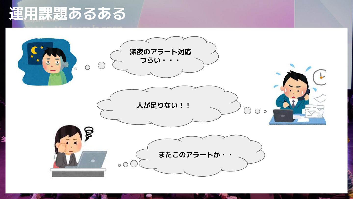 運用課題あるある 深夜のアラート対応 つらい・・・ またこのアラートか・・ 人が足りない!!