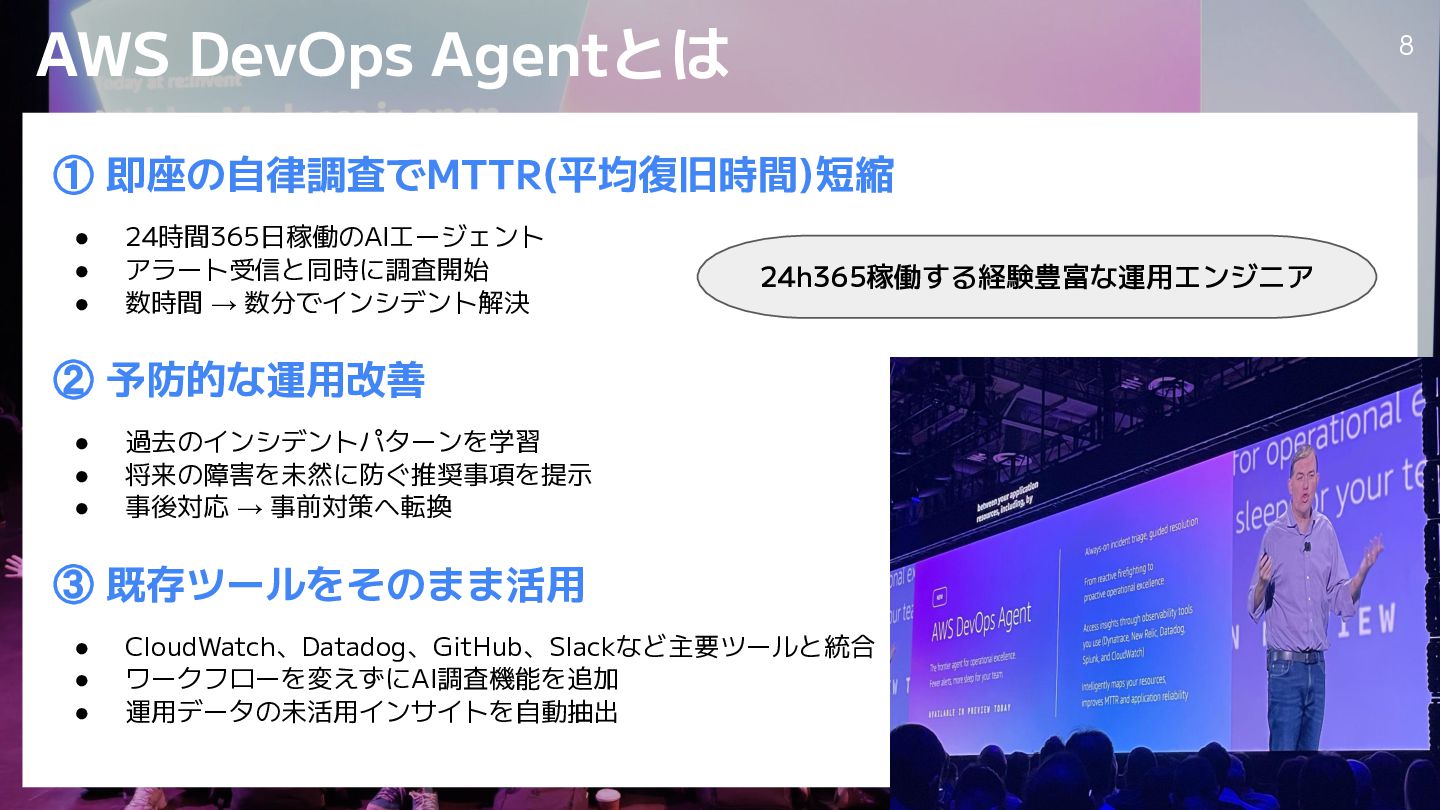 数分でインシデント解決 ② 予防的な運用改善 • 過去のインシデントパターンを学習 • 将来の障害を未然に防ぐ推奨事項を提示 • 事後対応 → 事前対策へ転換 ③ 既存ツールをそのまま活用 • CloudWatch、Datadog、GitHub、Slackなど主要ツールと統合 • ワークフローを変えずにAI調査機能を追加 • 運用データの未活用インサイトを自動抽出 AWS DevOps Agentとは 24h365稼働する経験豊富な運用エンジニア