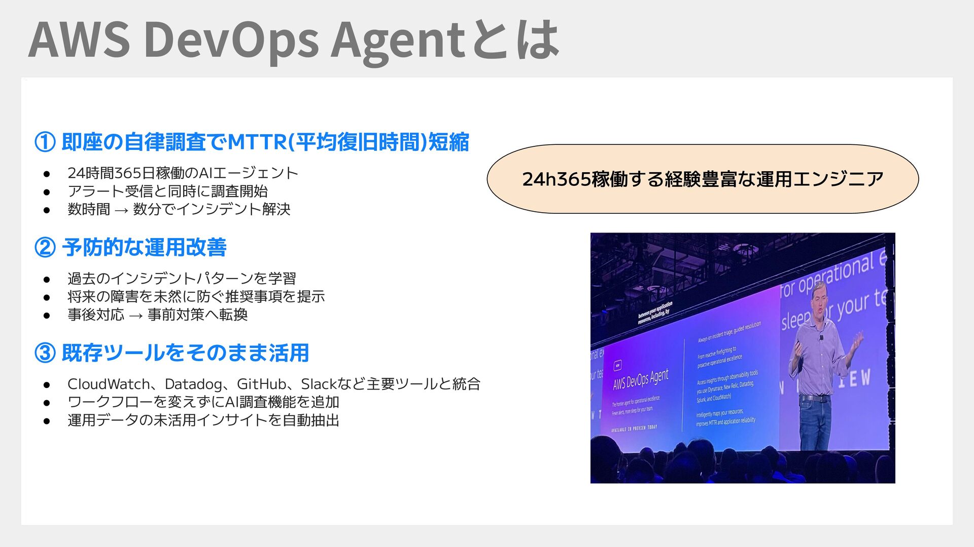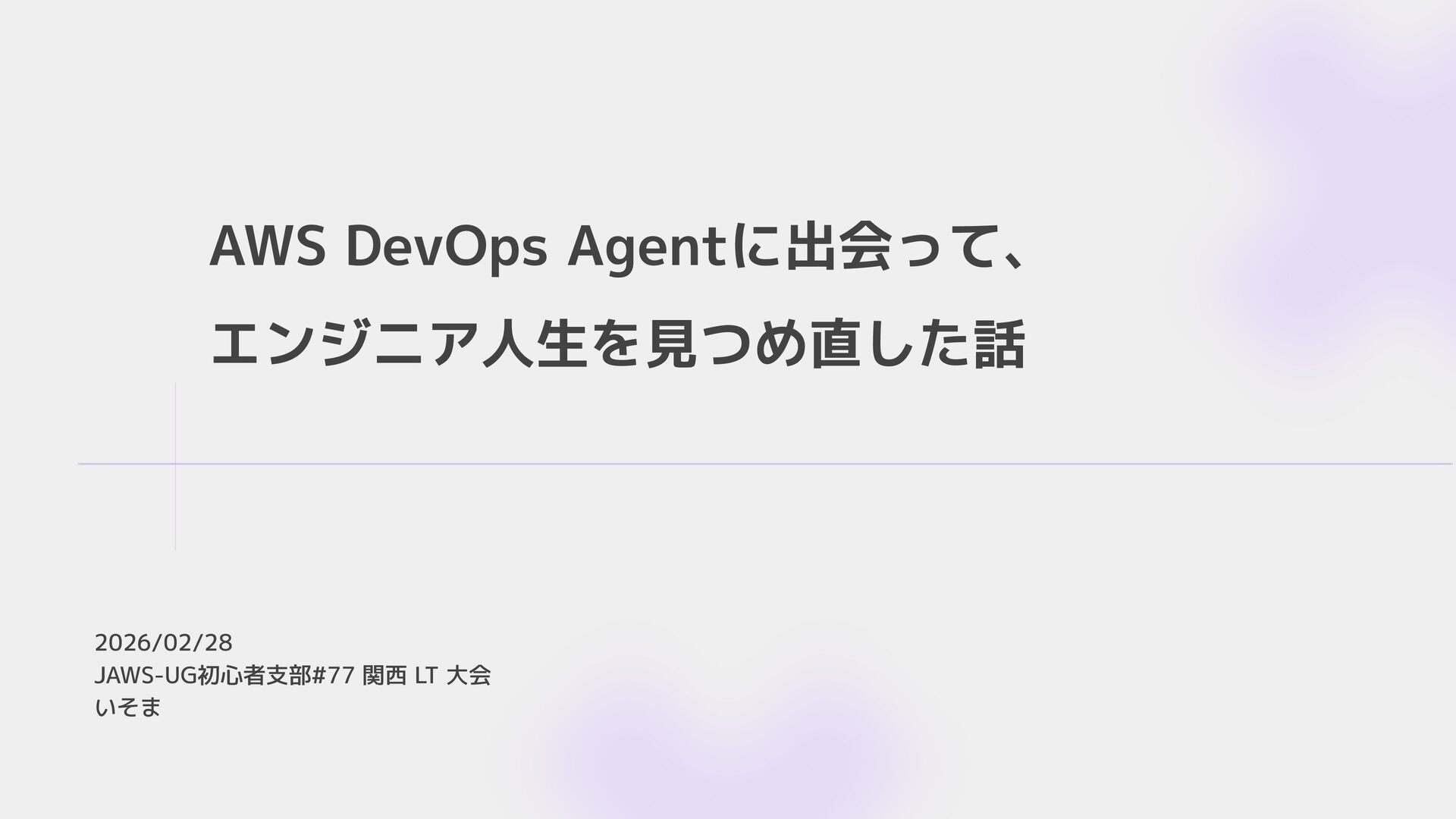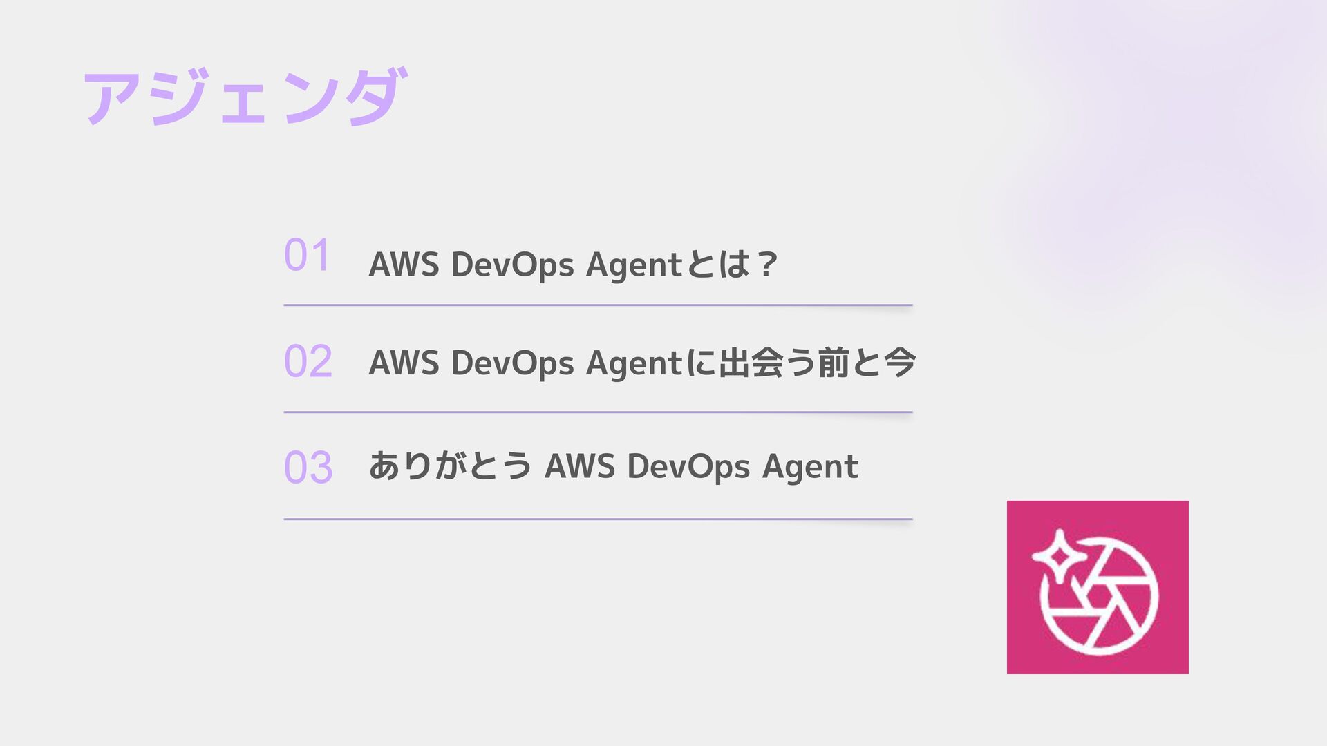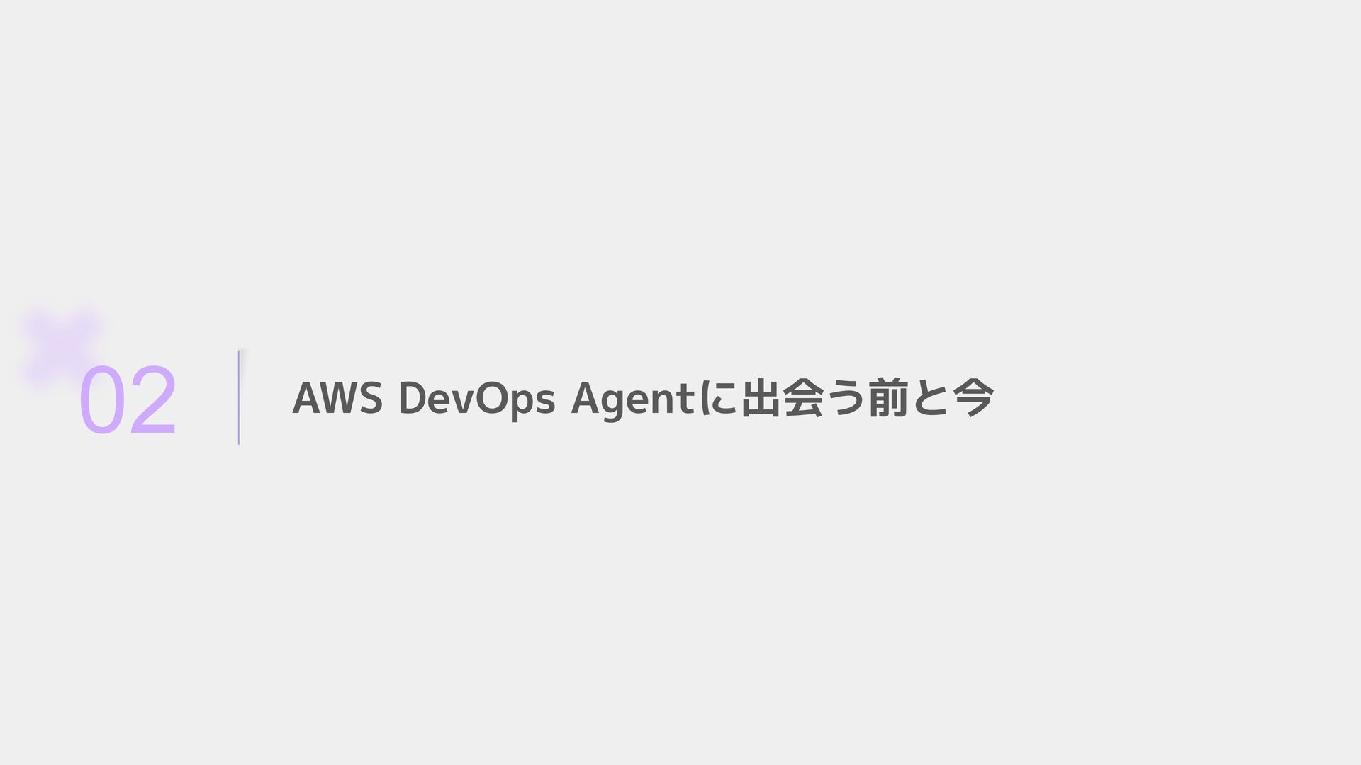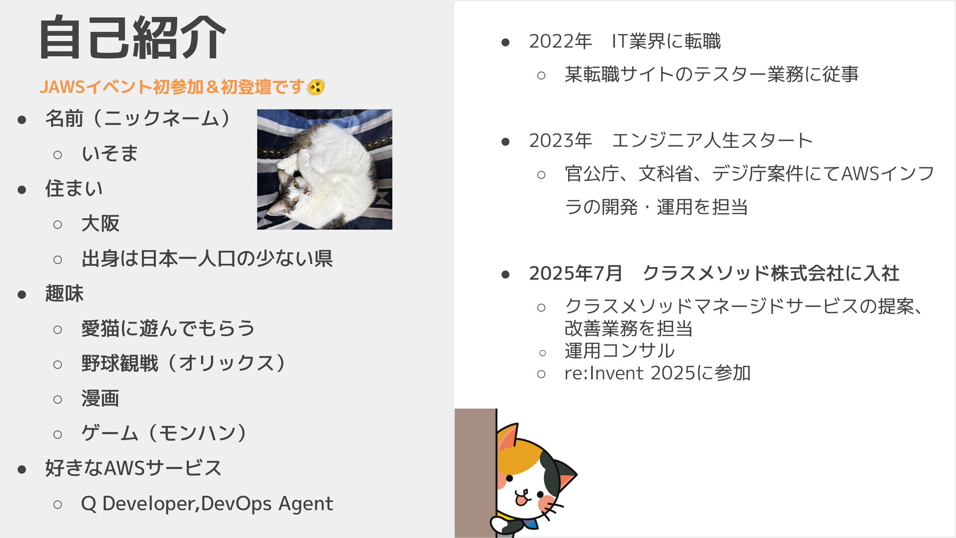 出身は日本一人口の少ない県 • 趣味 ◦ 愛猫に遊んでもらう ◦ 野球観戦(オリックス) ◦ 漫画 ◦ ゲーム(モンハン) • 好きなAWSサービス ◦ Q Developer,DevOps Agent • 2022年 IT業界に転職 ◦ 某転職サイトのテスター業務に従事 • 2023年 エンジニア人生スタート ◦ 官公庁、文科省、デジ庁案件にてAWSインフ ラの開発・運用を担当 • 2025年7月 クラスメソッド株式会社に入社 ◦ クラスメソッドマネージドサービスの提案、 改善業務を担当 ◦ 運用コンサル ◦ re:Invent 2025に参加 JAWSイベント初参加&初登壇です🫨