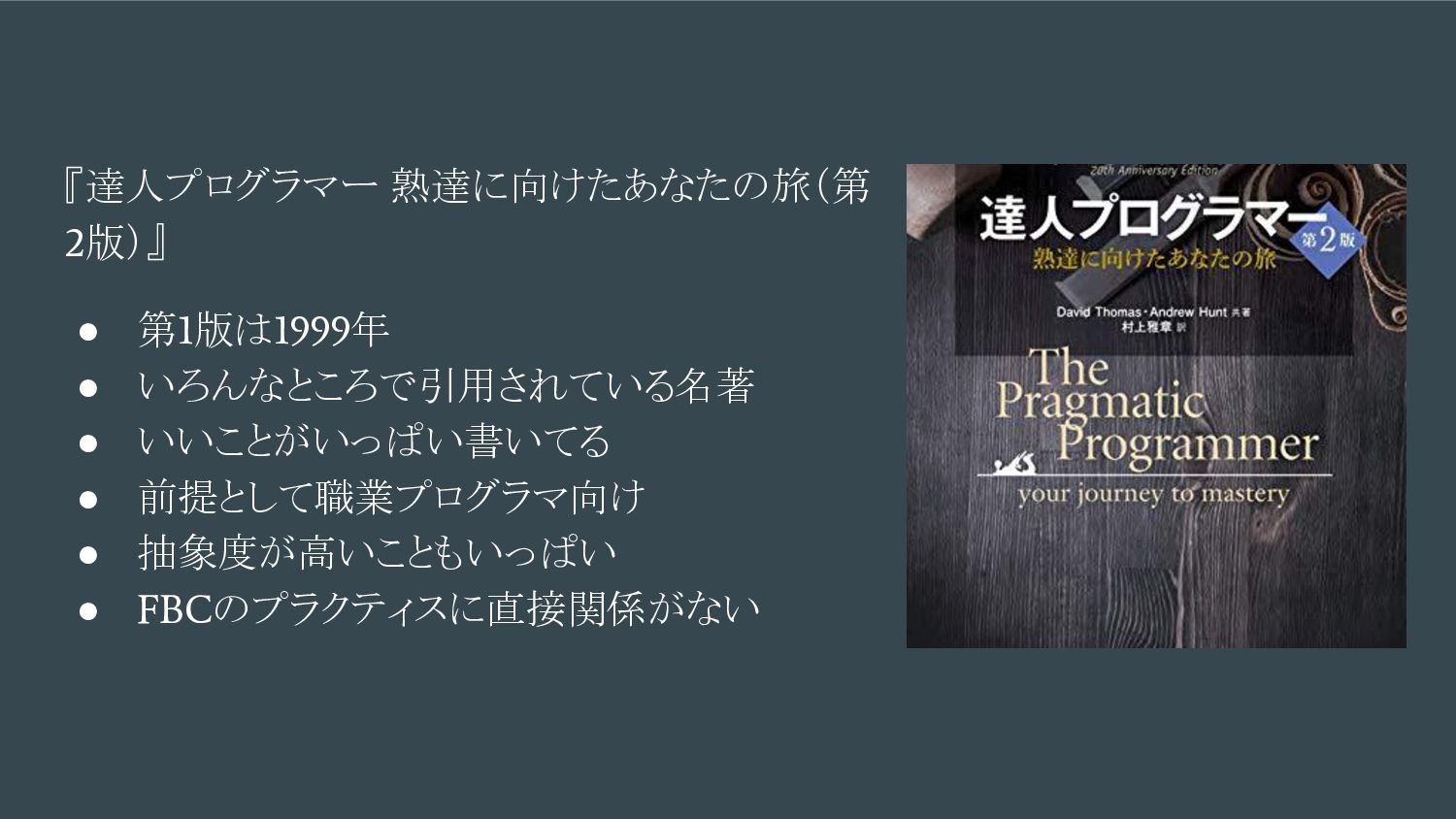 • いろんなところで引用されている名著 • いいことがいっぱい書いてる • 前提として職業プログラマ向け • 抽象度が高いこともいっぱい • FBC のプラクティスに直接関係がない