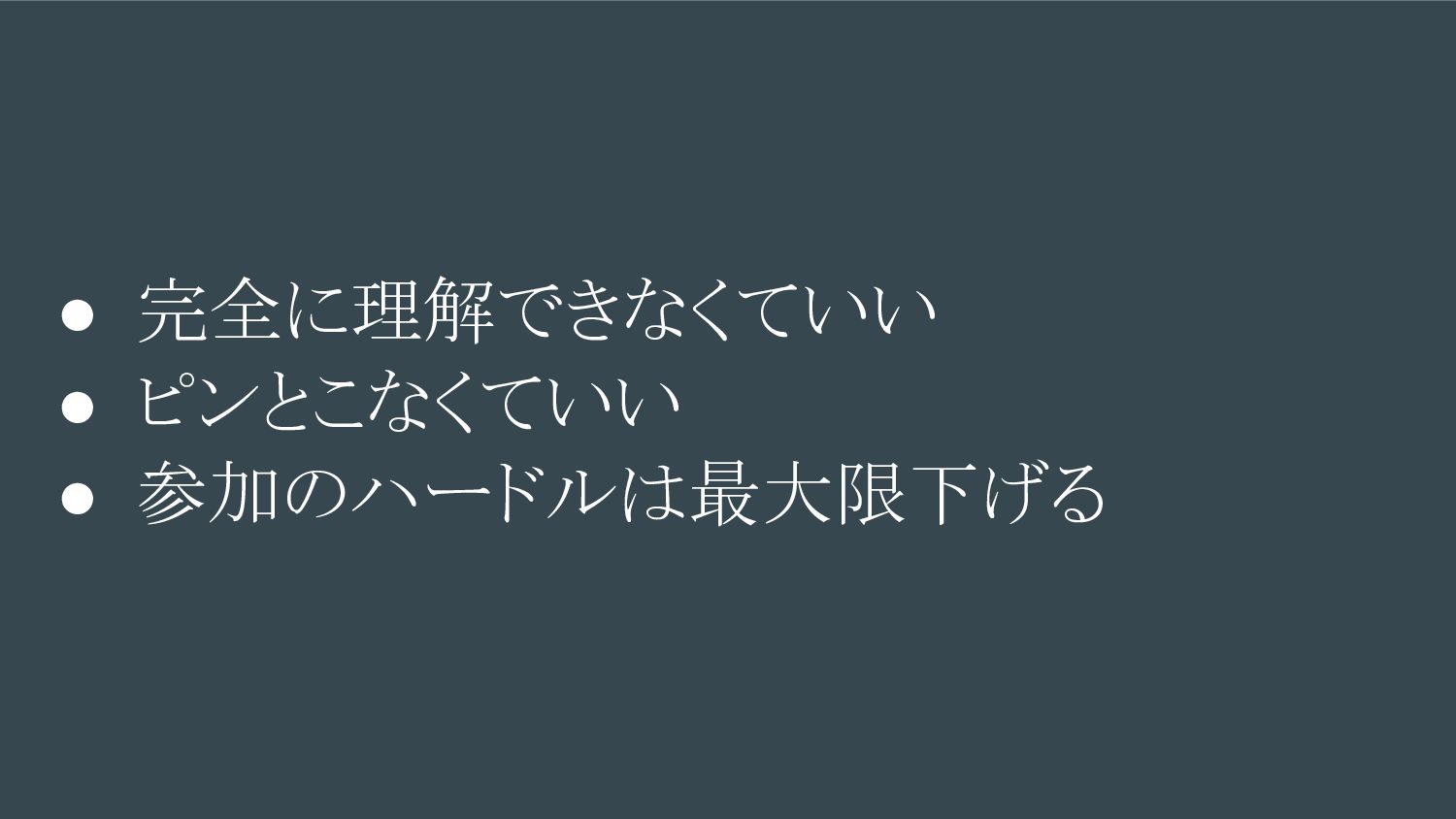 • 完全に理解できなくていい • ピンとこなくていい • 参加のハードルは最大限下げる