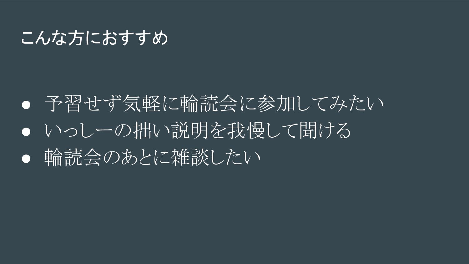 こんな方におすすめ • 予習せず気軽に輪読会に参加してみたい • いっしーの拙い説明を我慢して聞ける • 輪読会のあとに雑談したい