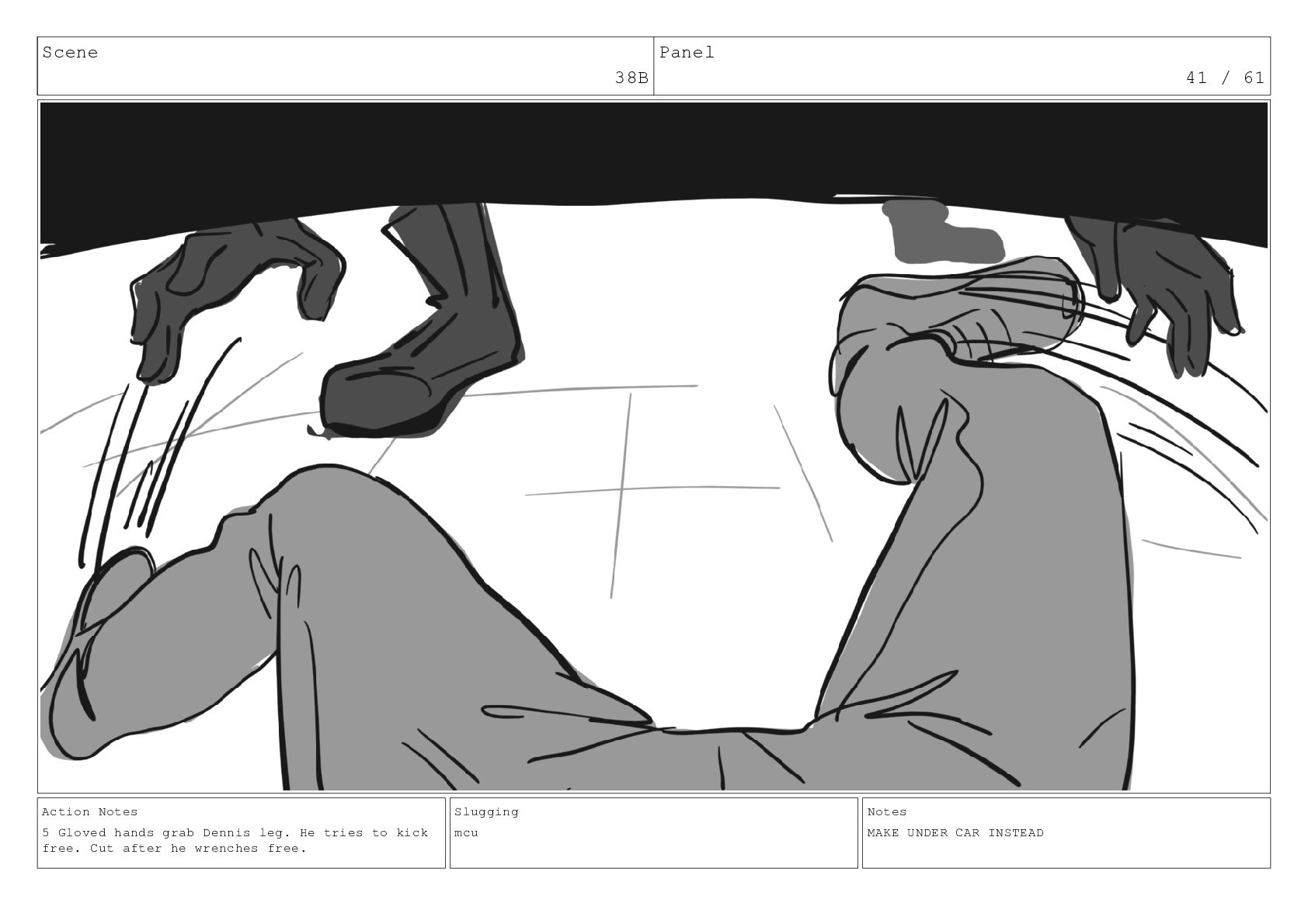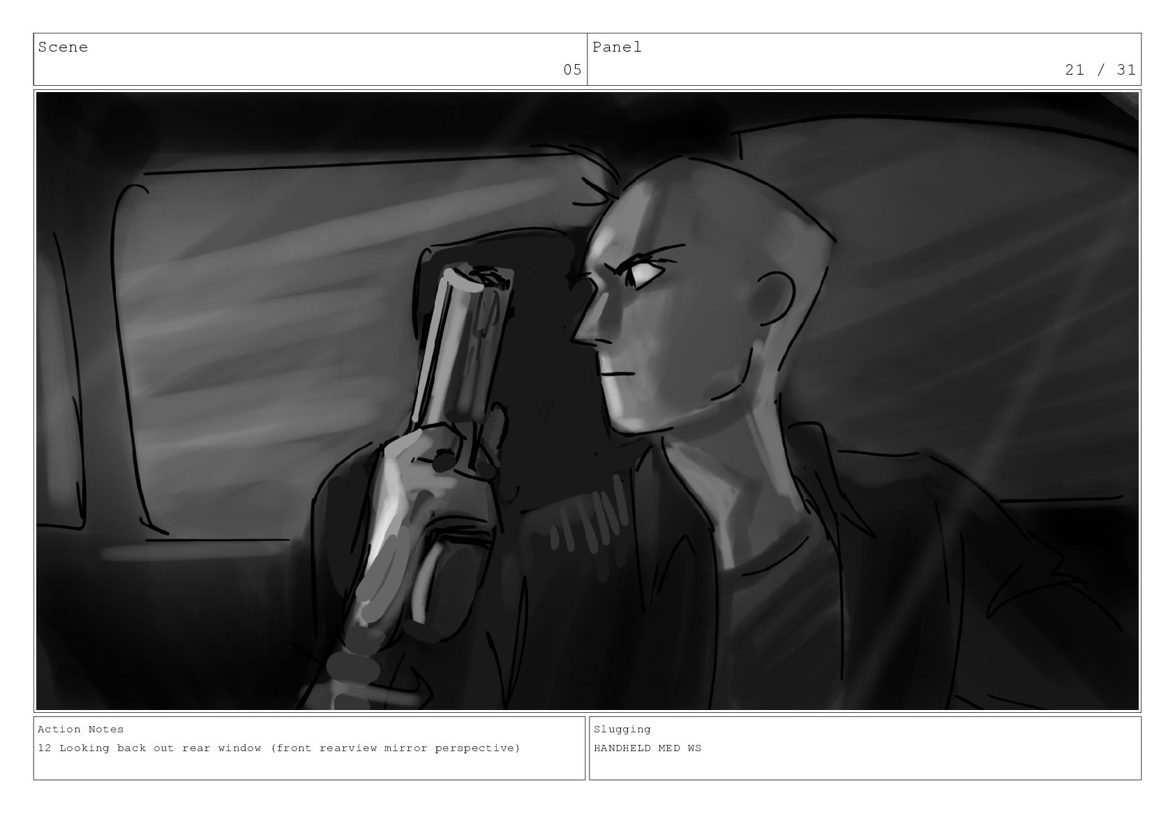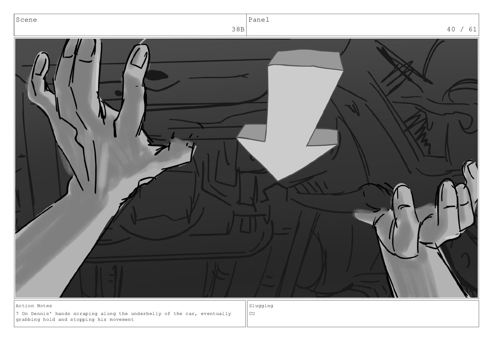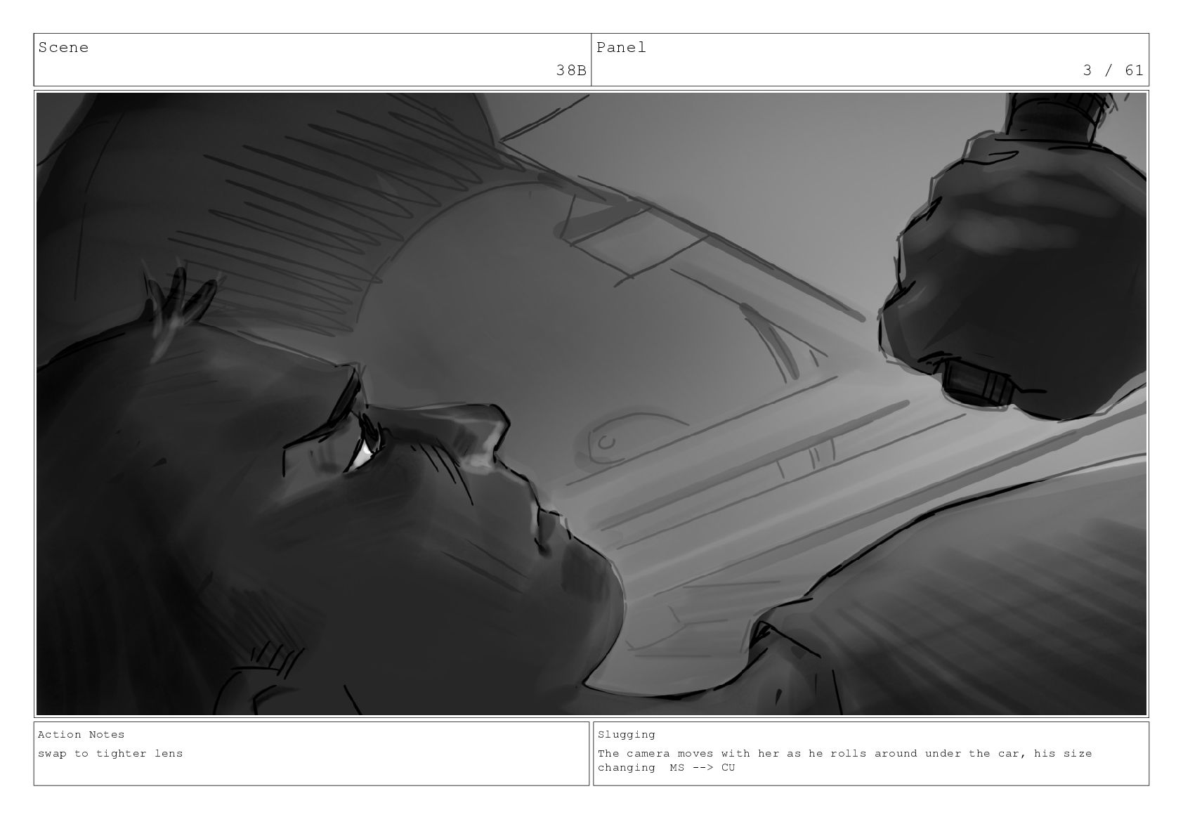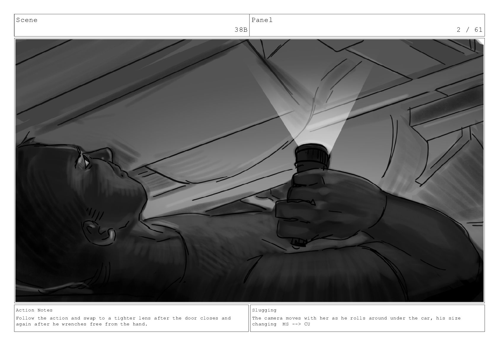 action and swap to a tighter lens after the door closes and again after he wrenches free from the hand. Slugging The camera moves with her as he rolls around under the car, his size changing MS --> CU