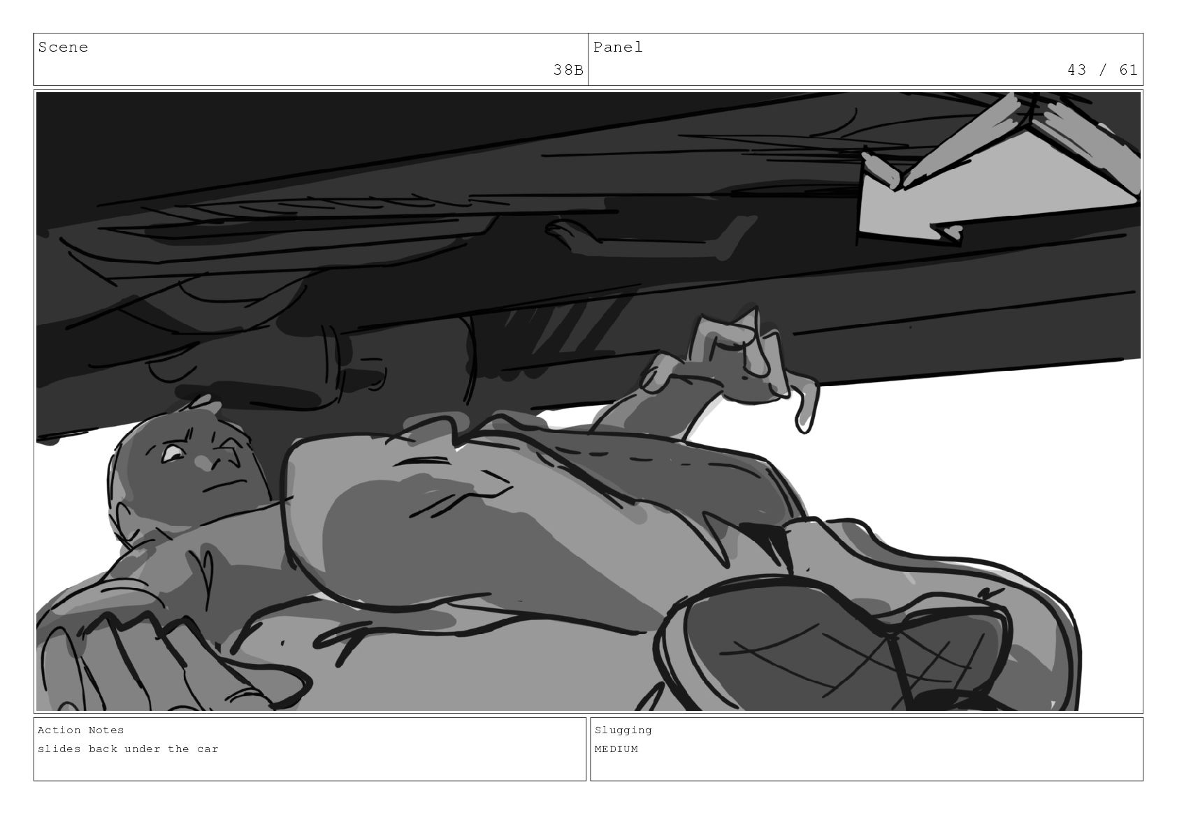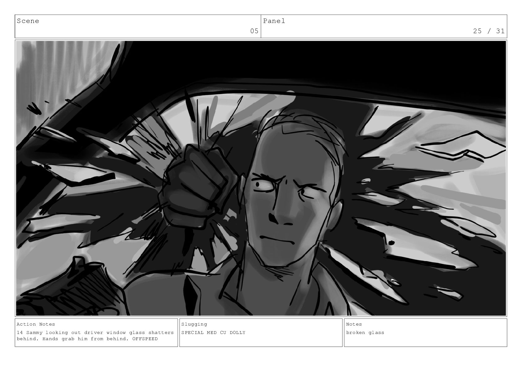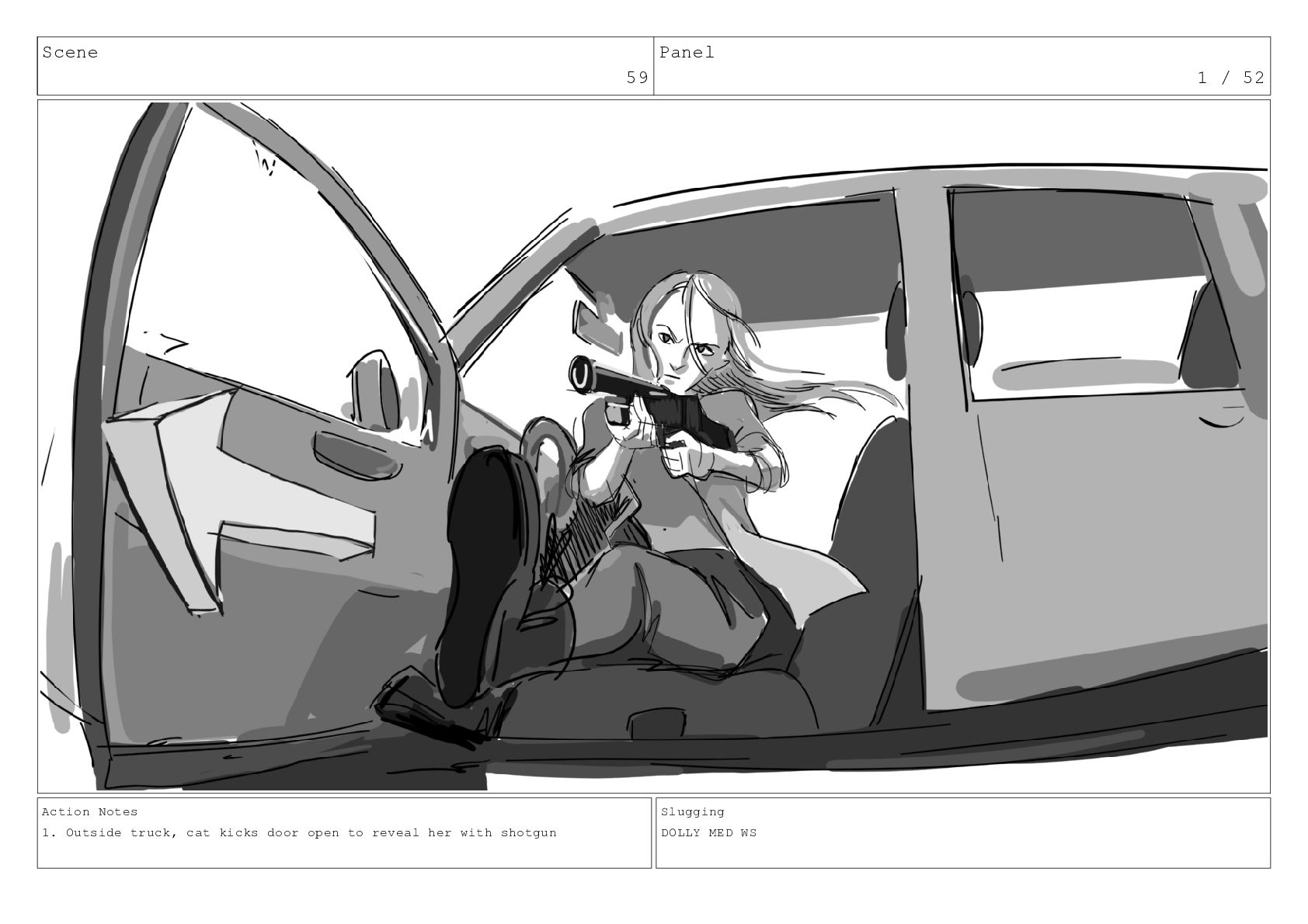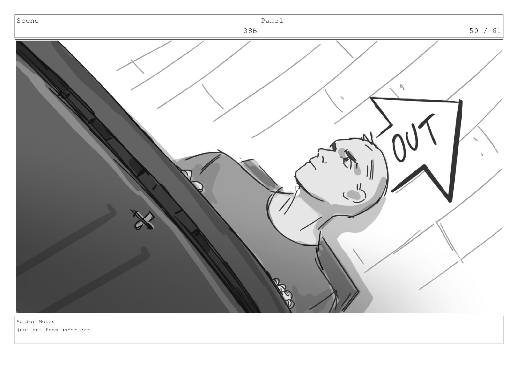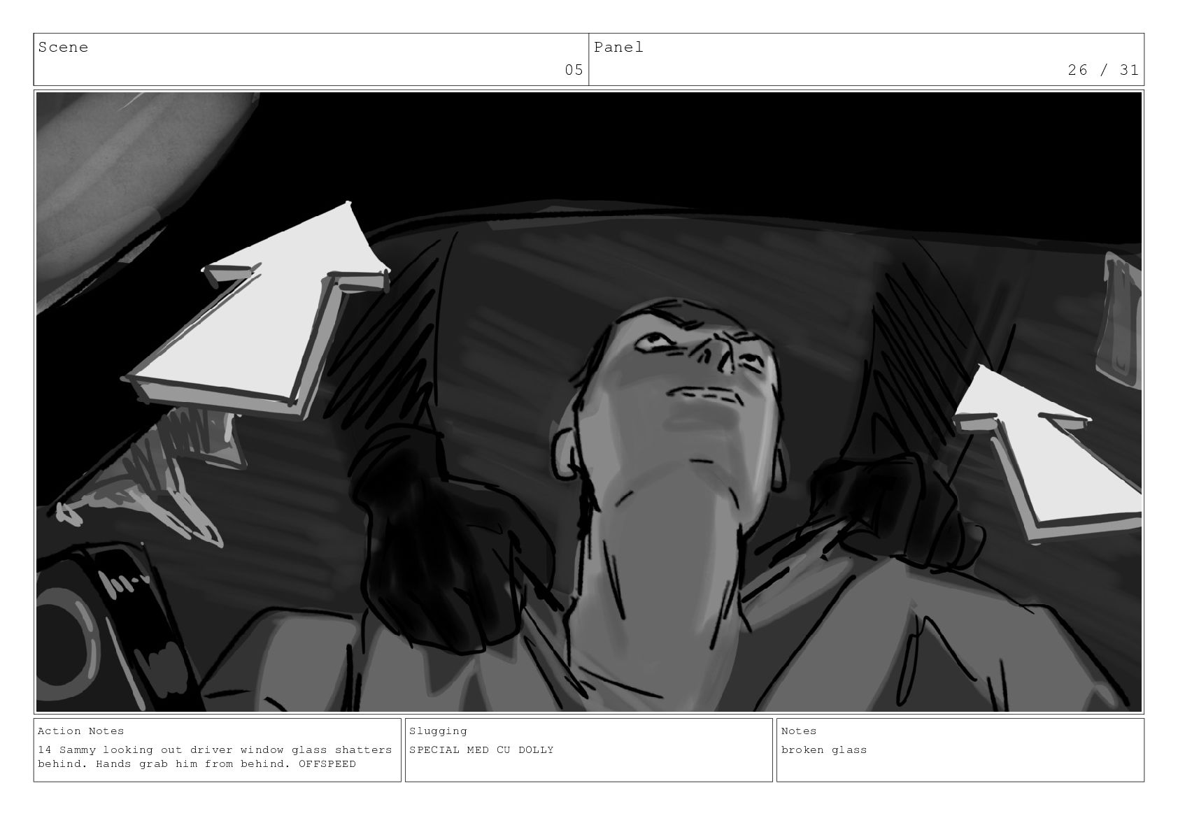 action and swap to a tighter lens after the door closes and again after he wrenches free from the hand. Slugging The camera moves with her as he rolls around under the car, his size changing MS --> CU