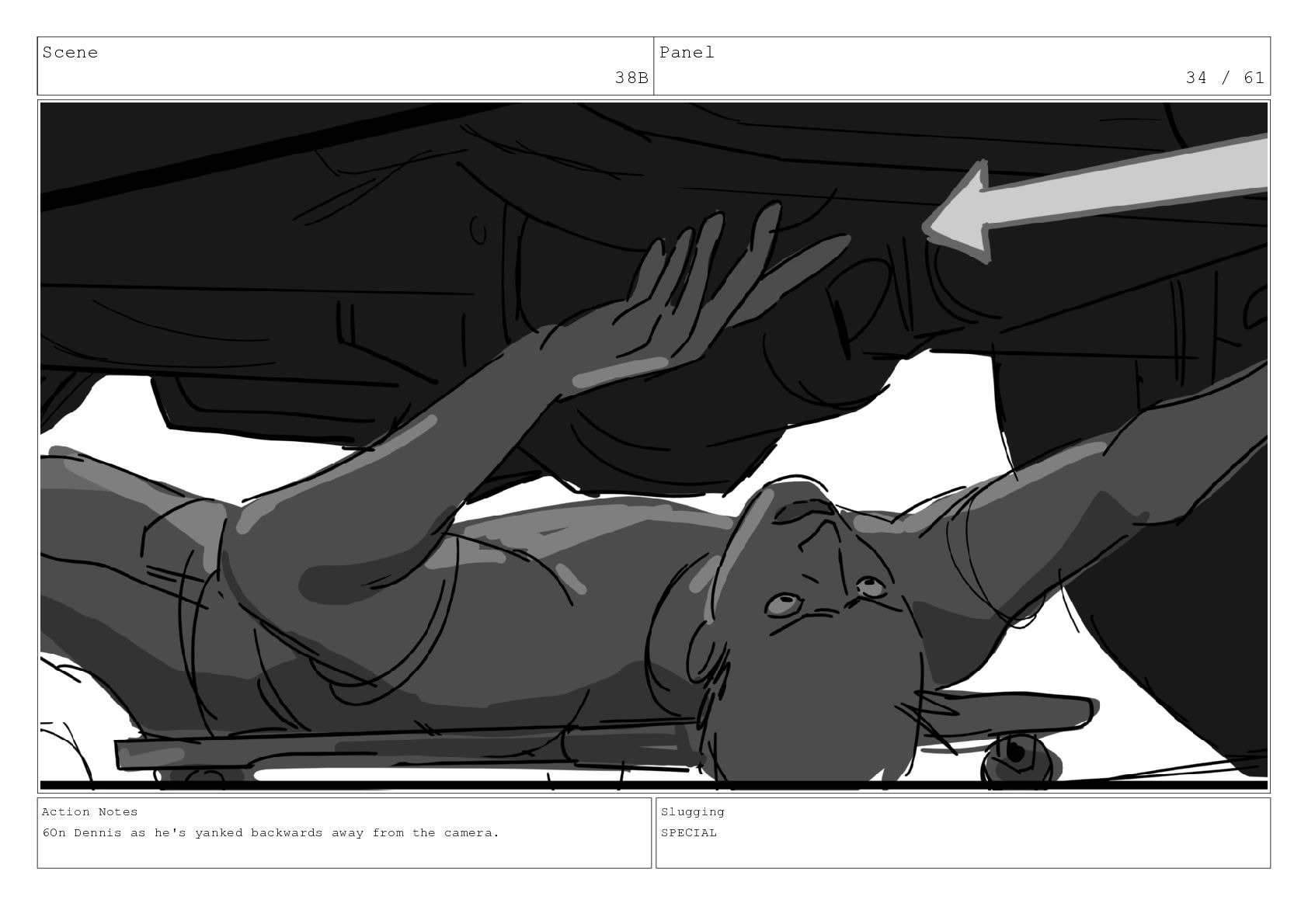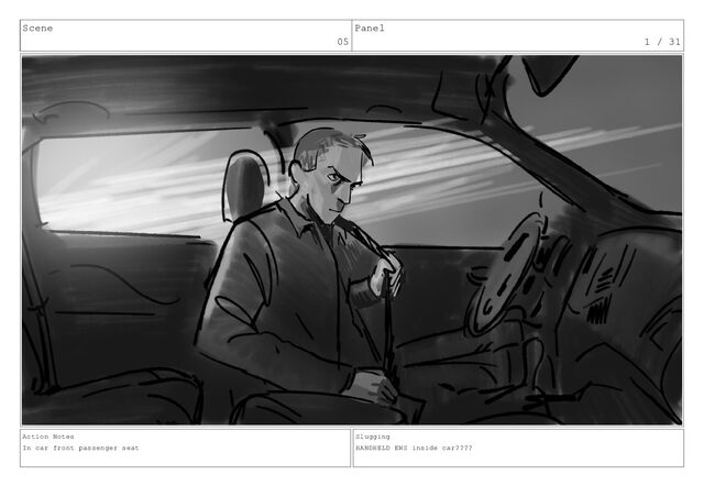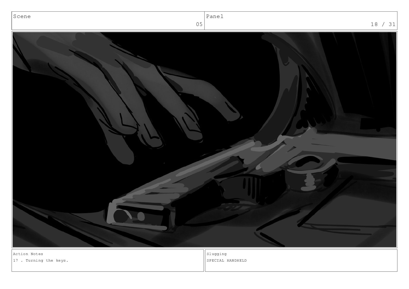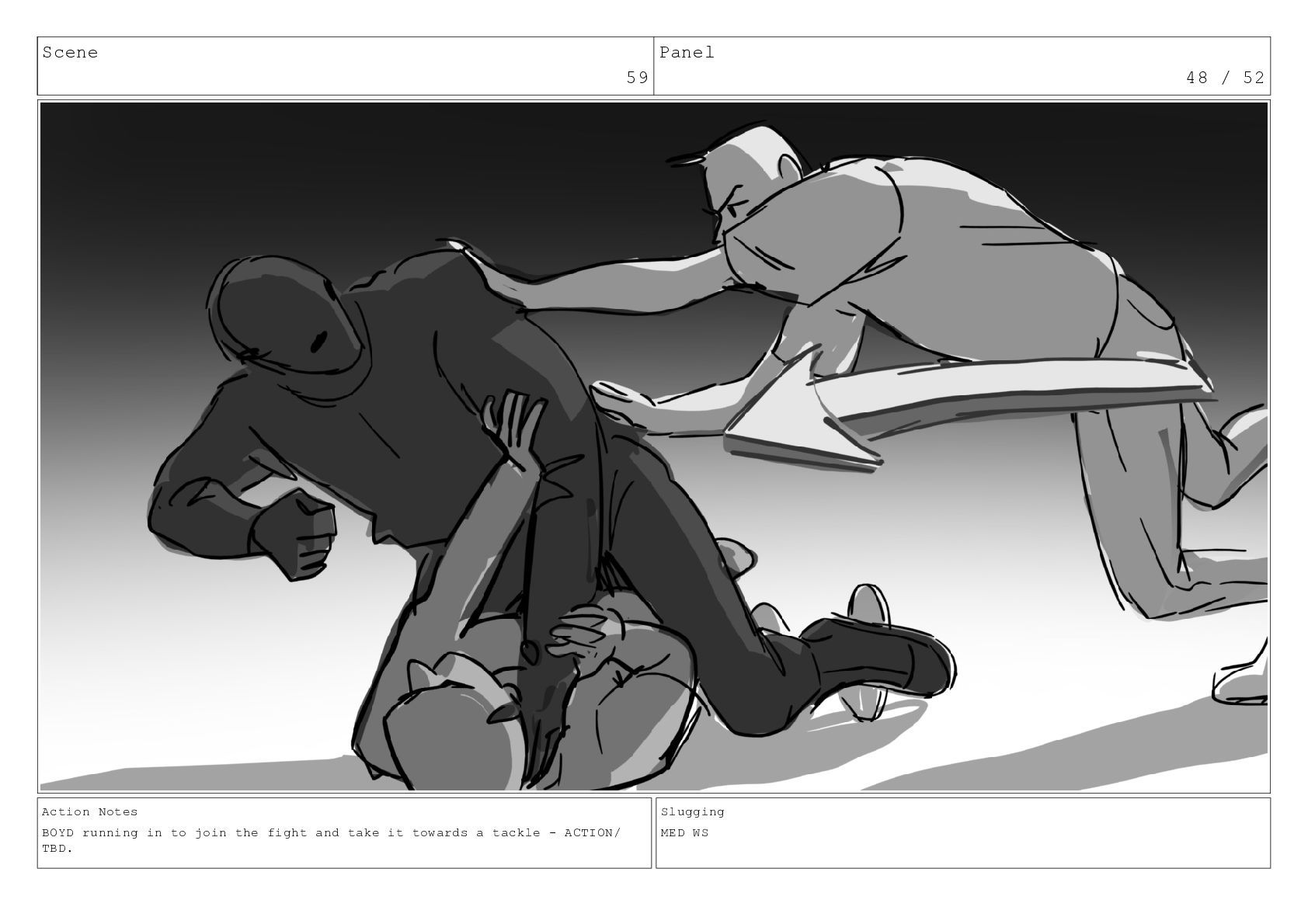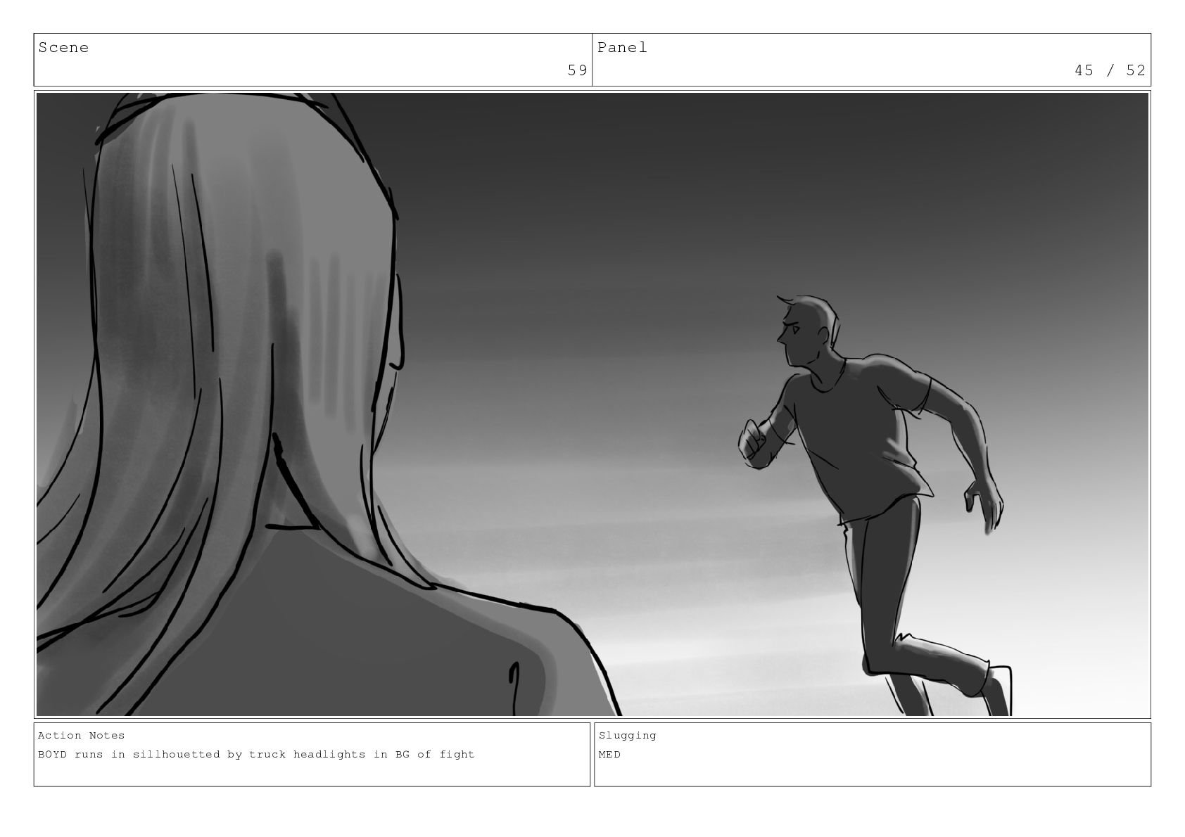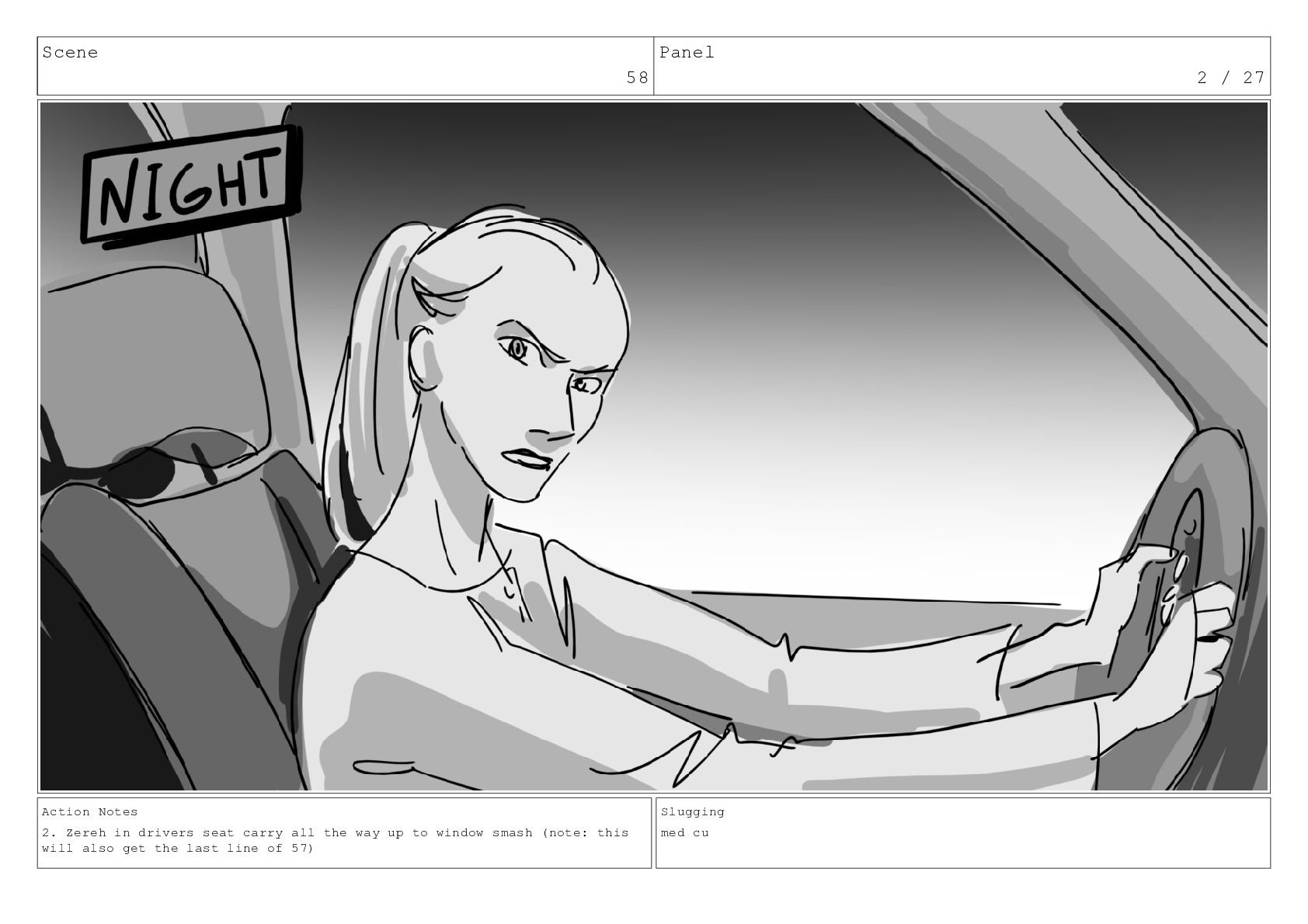 action and swap to a tighter lens after the door closes and again after he wrenches free from the hand. Slugging The camera moves with her as he rolls around under the car, his size changing MS --> CU