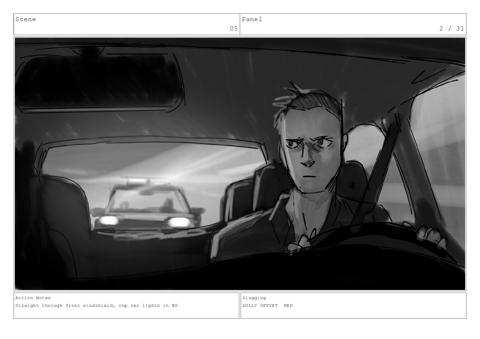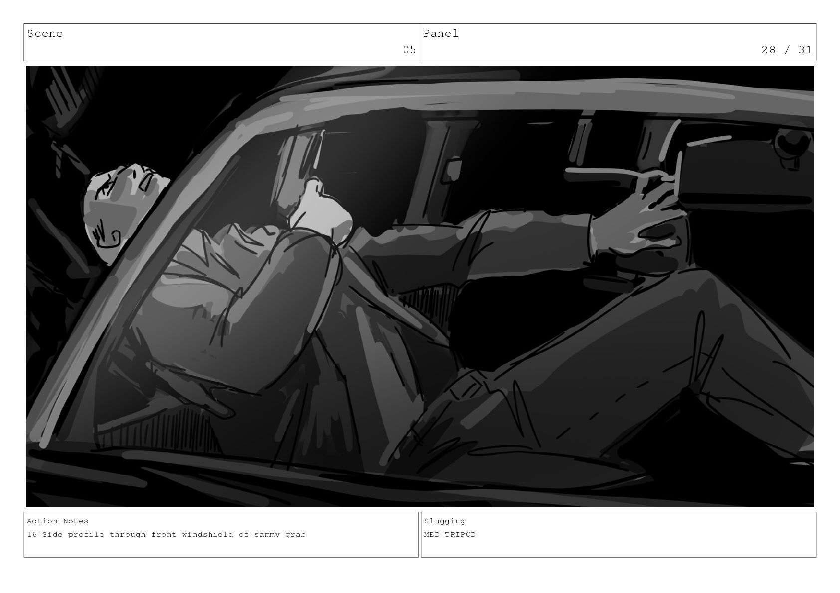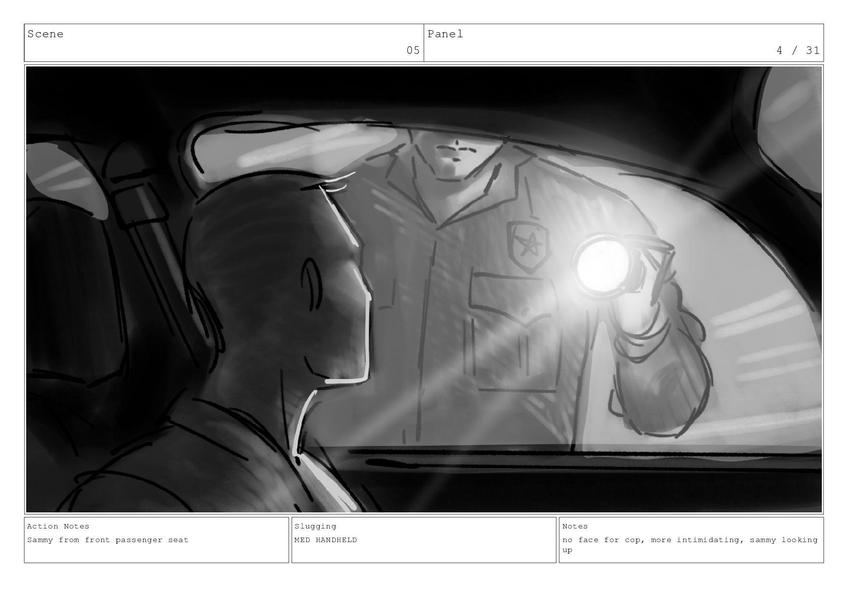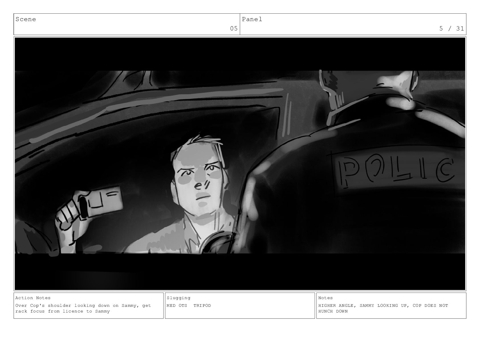 shoulder looking down on Sammy, get rack focus from licence to Sammy Slugging MED OTS TRIPOD Notes HIGHER ANGLE, SAMMY LOOKING UP, COP DOES NOT HUNCH DOWN