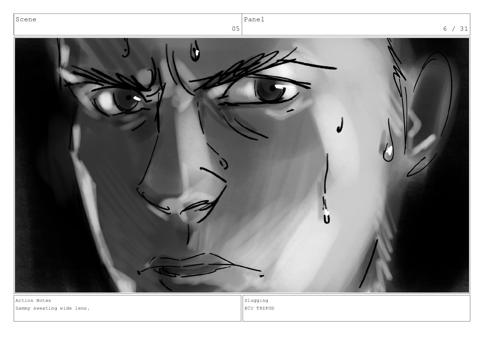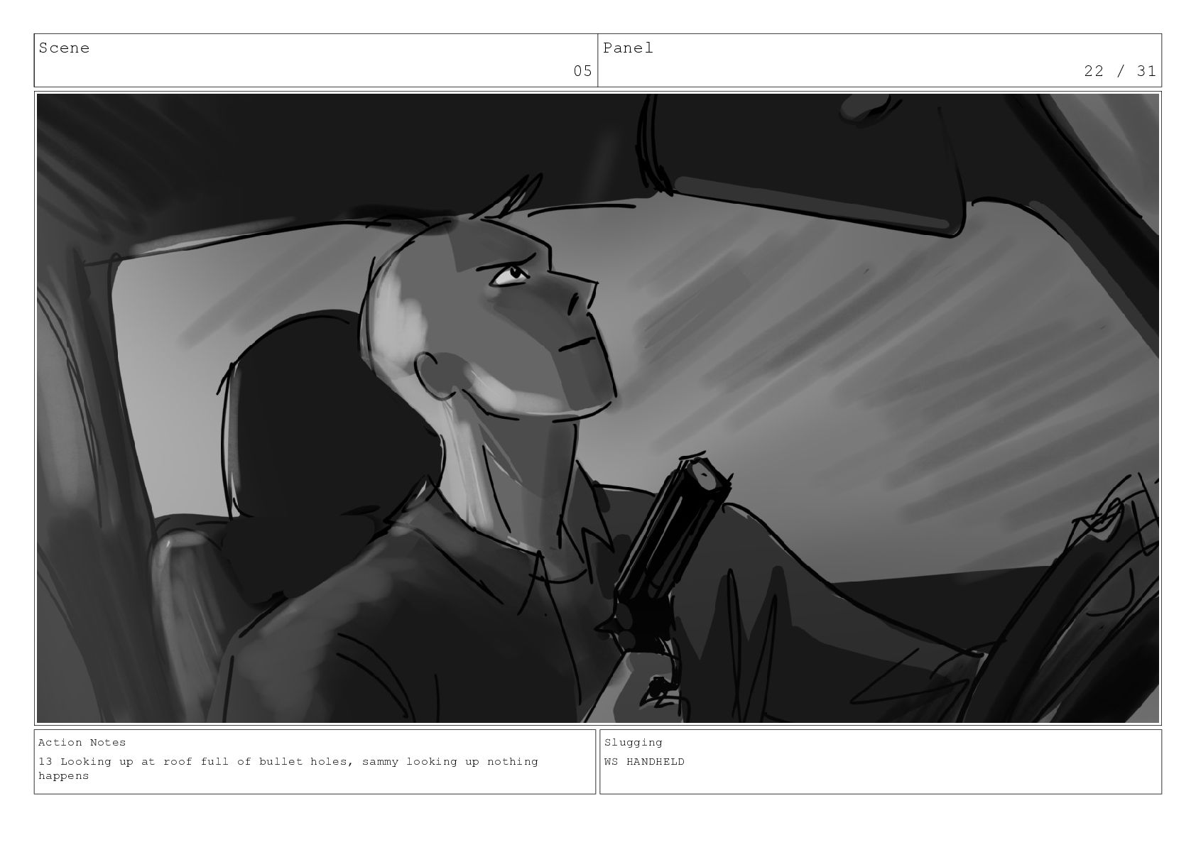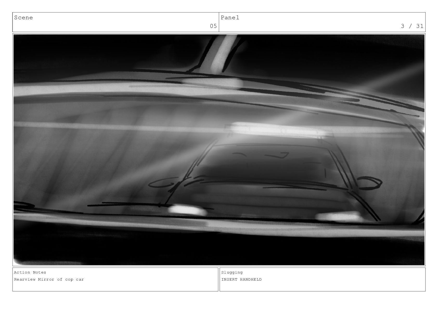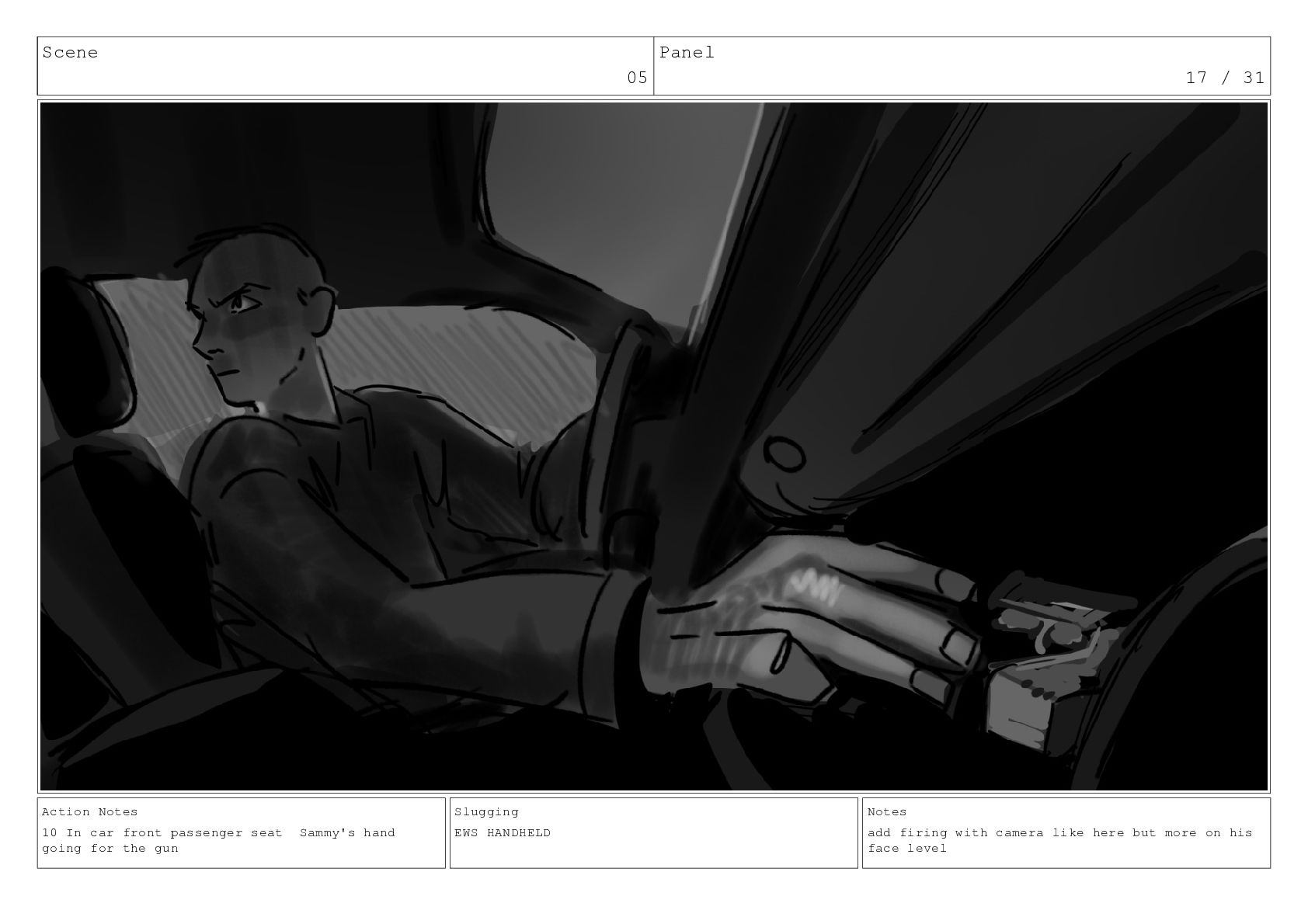 shoulder looking down on Sammy, get rack focus from licence to Sammy Slugging MED OTS TRIPOD Notes HIGHER ANGLE, SAMMY LOOKING UP, COP DOES NOT HUNCH DOWN