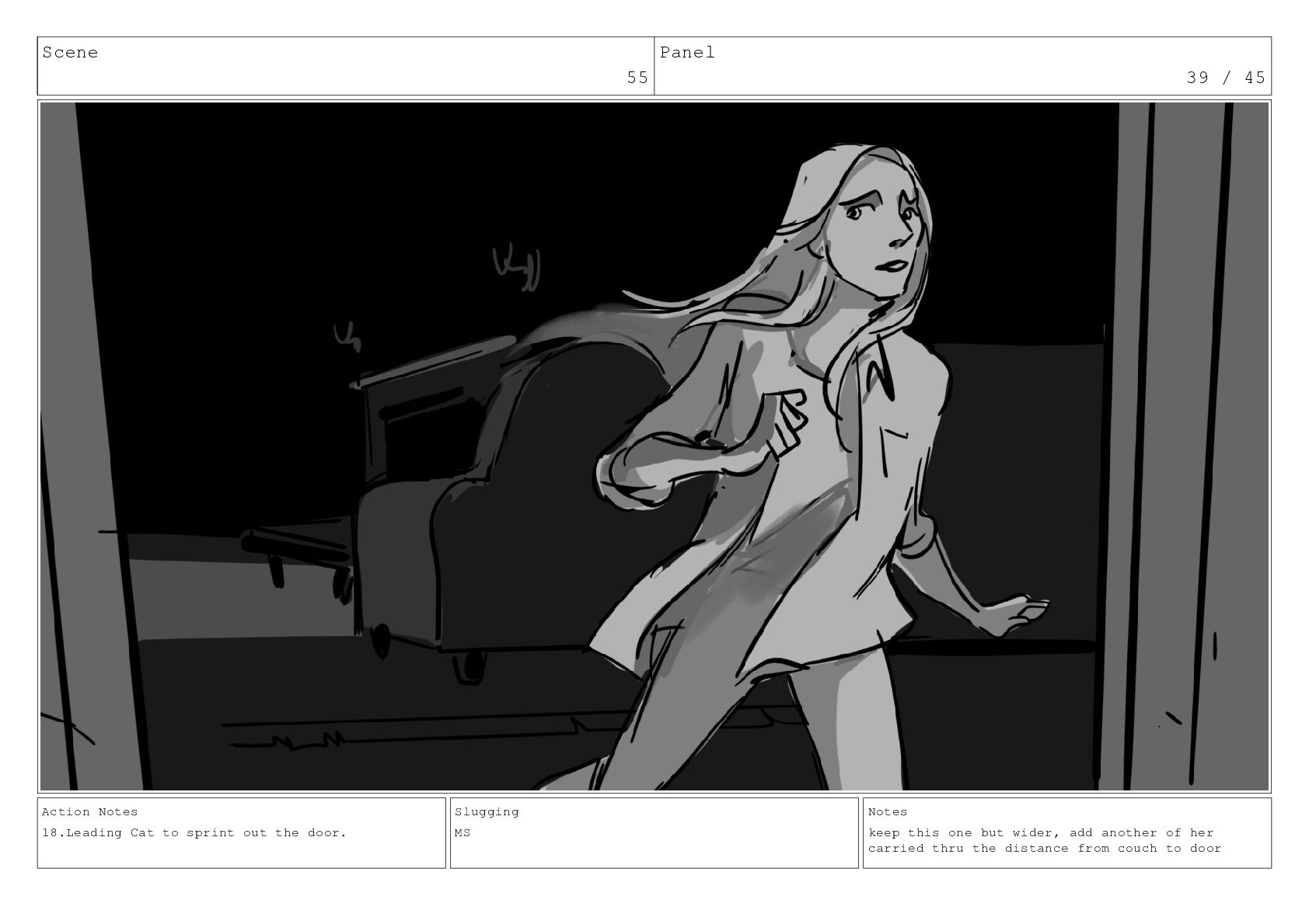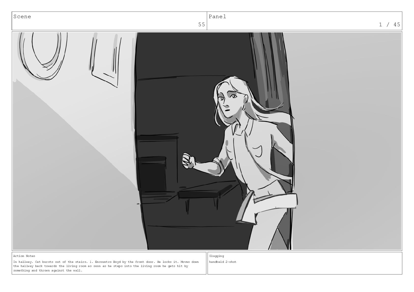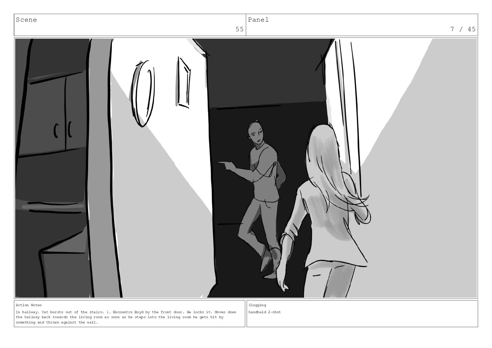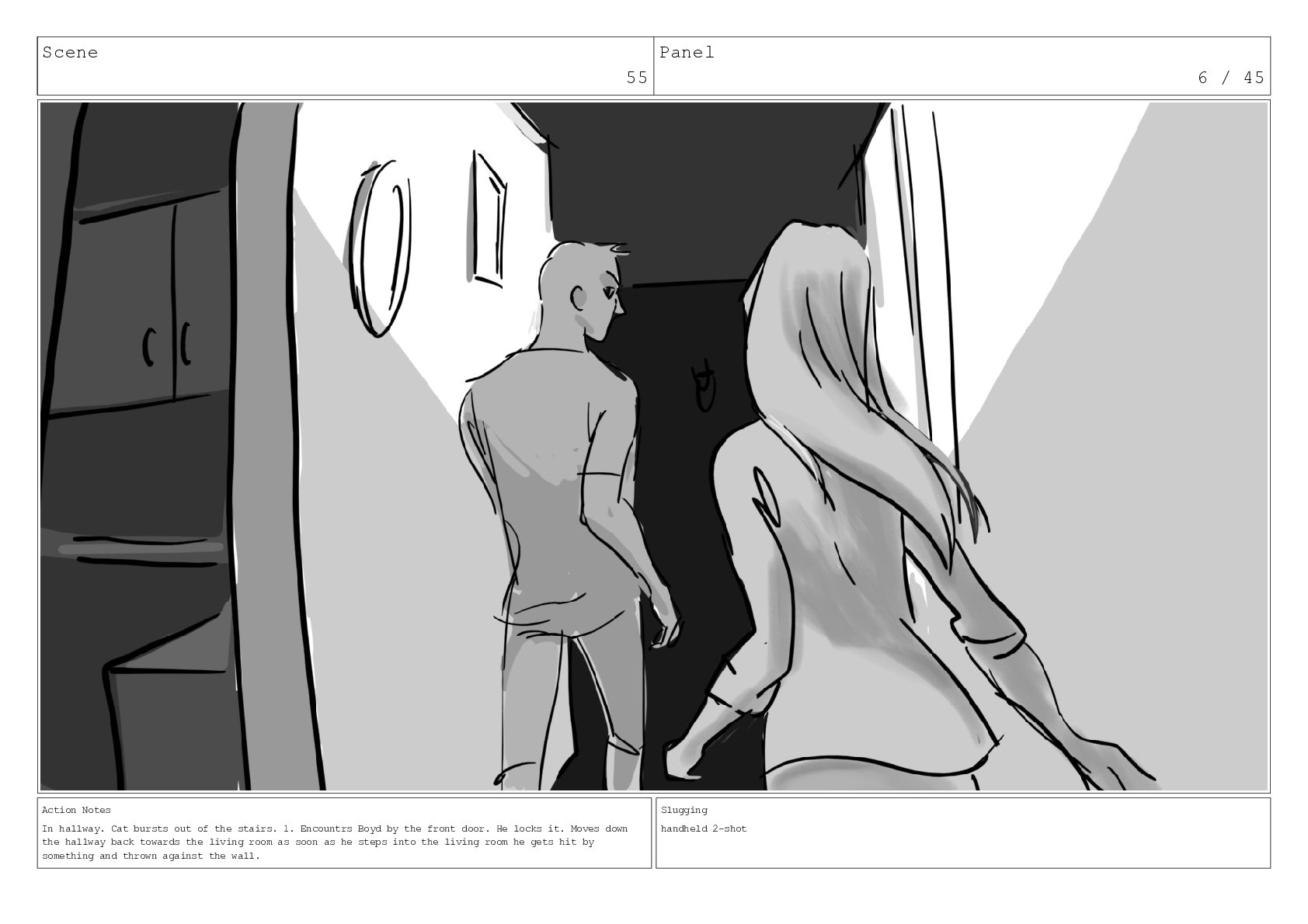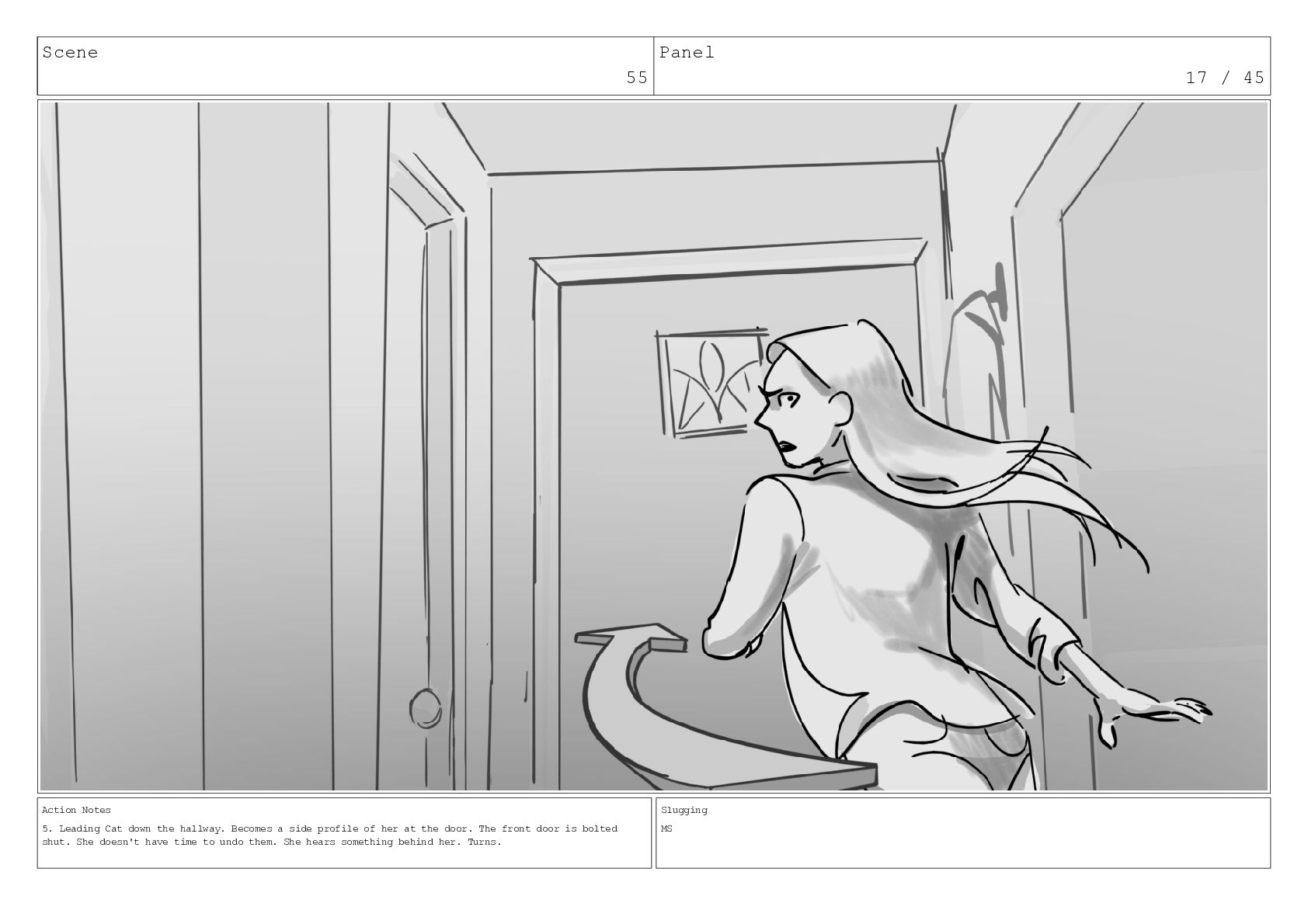 Cat down the hallway. Becomes a side profile of her at the door. The front door is bolted shut. She doesn't have time to undo them. She hears something behind her. Turns. Slugging MS
