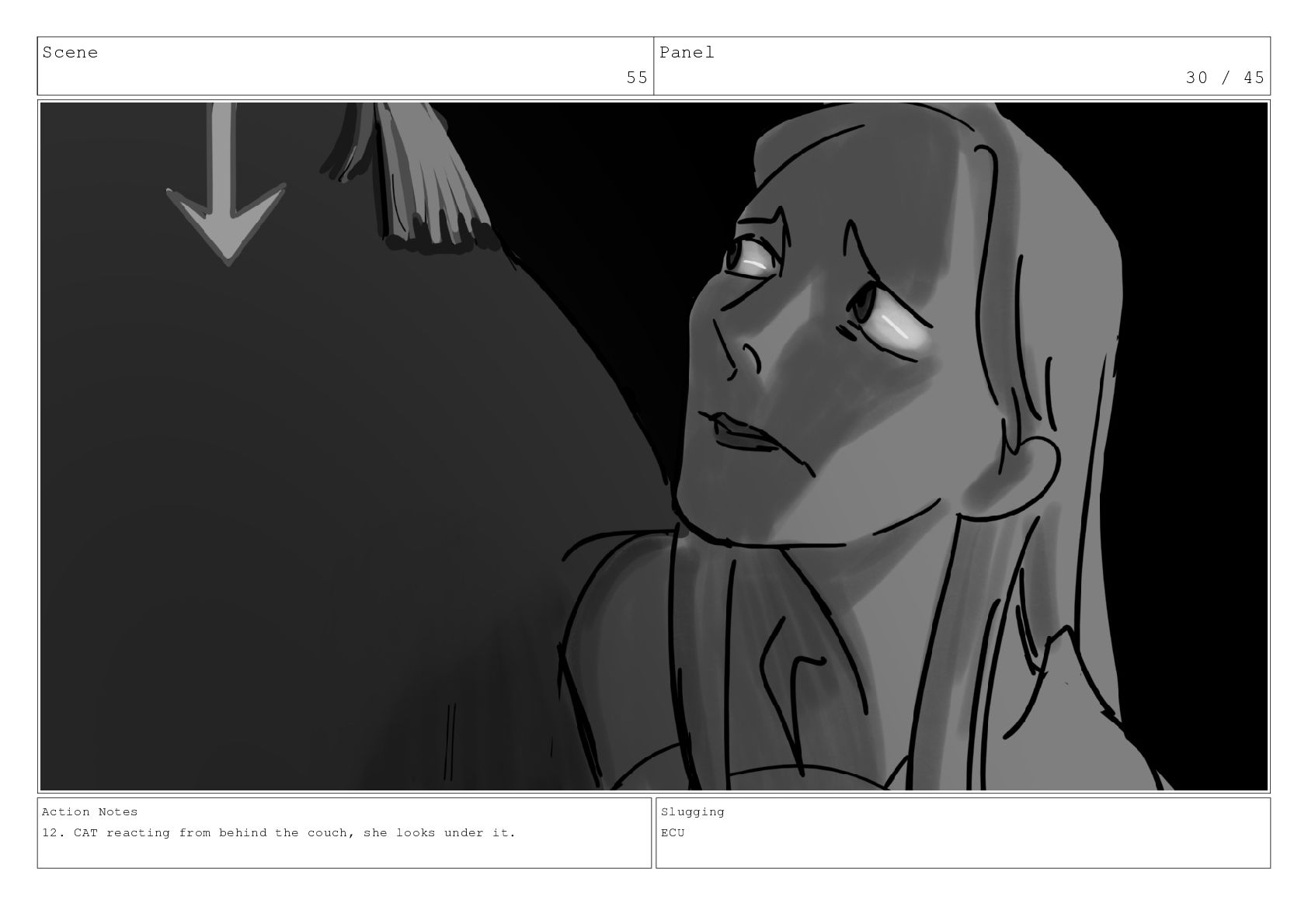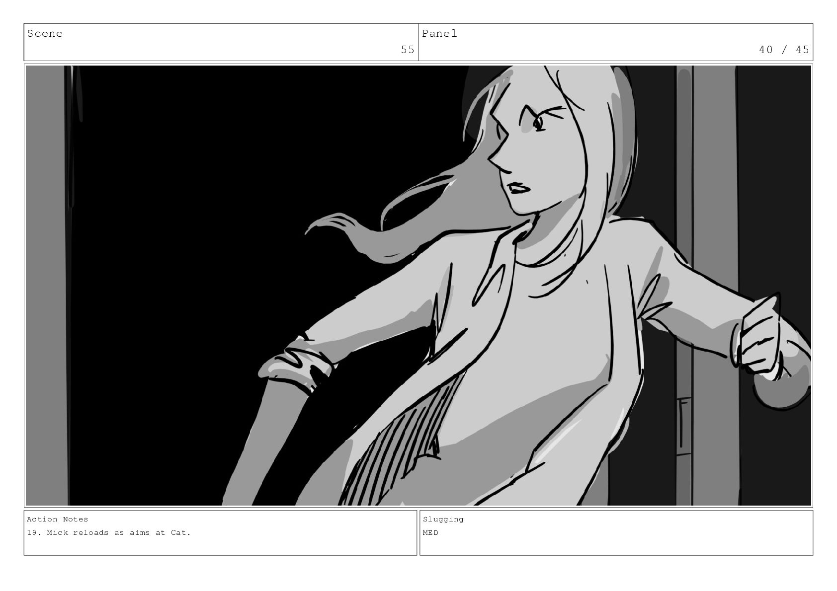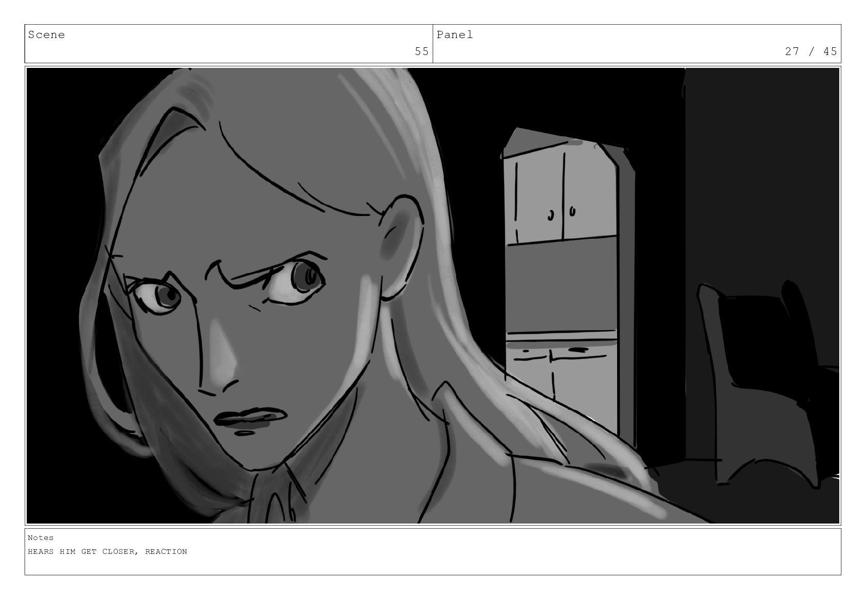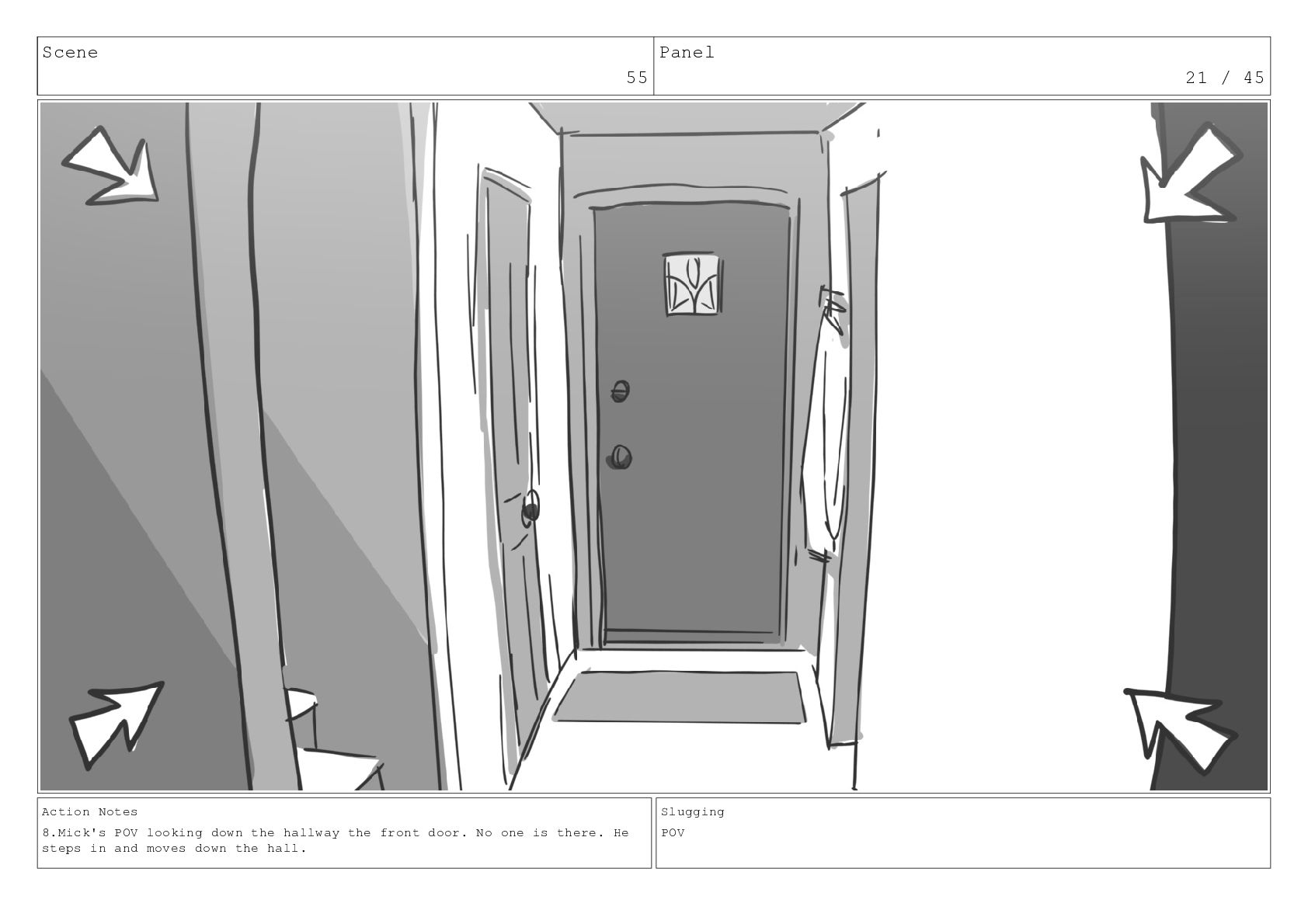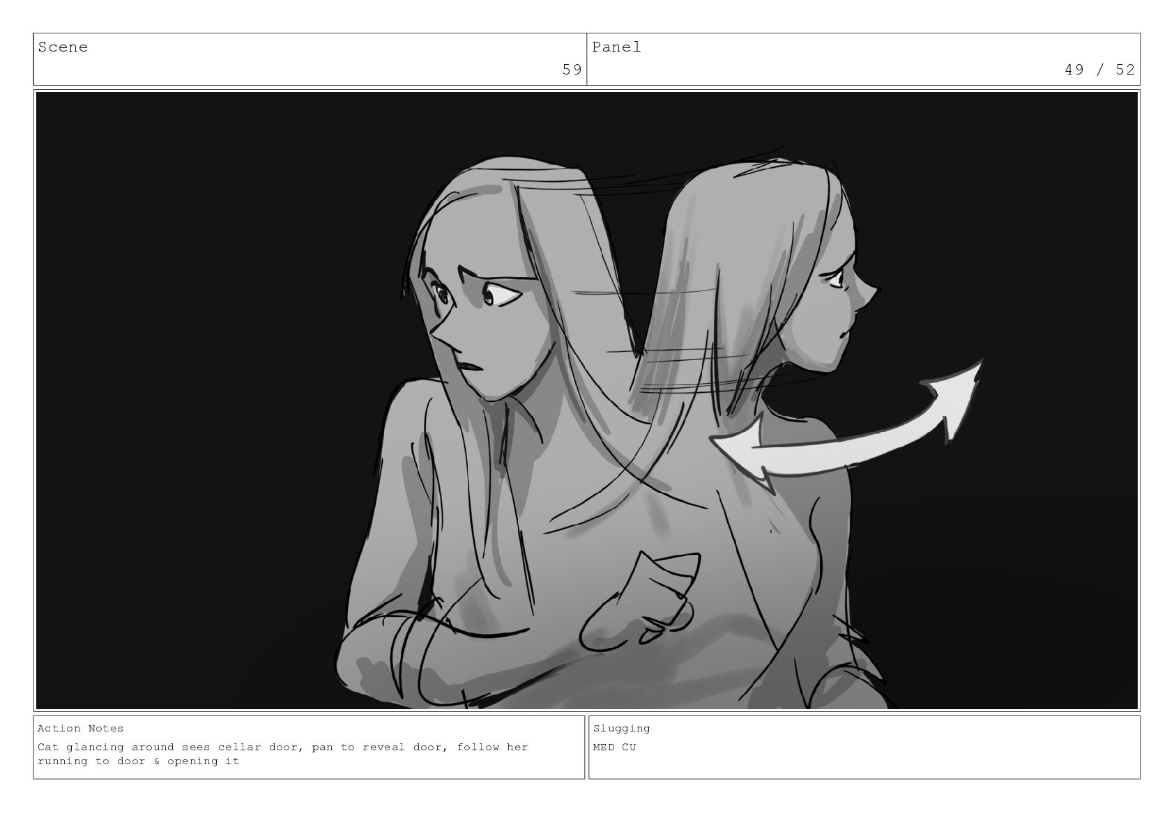 Cat down the hallway. Becomes a side profile of her at the door. The front door is bolted shut. She doesn't have time to undo them. She hears something behind her. Turns. Slugging MS