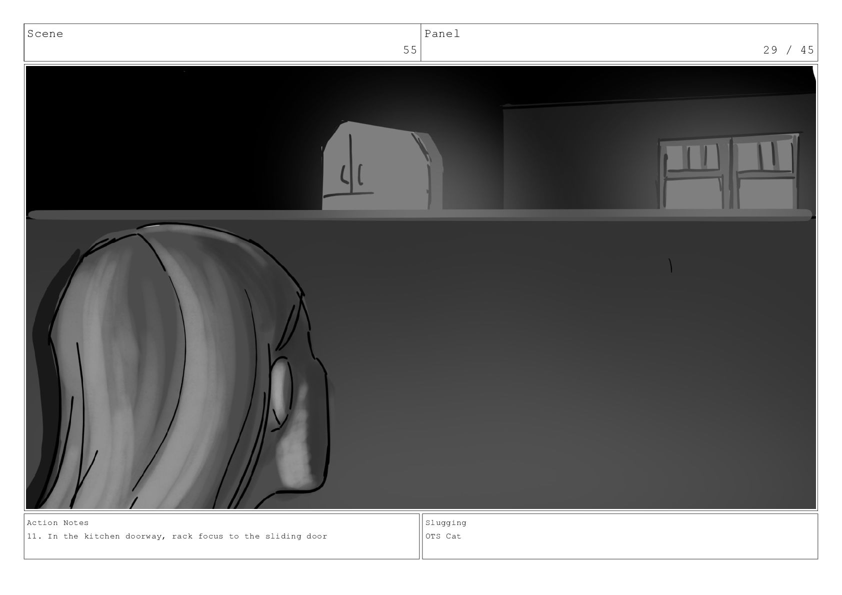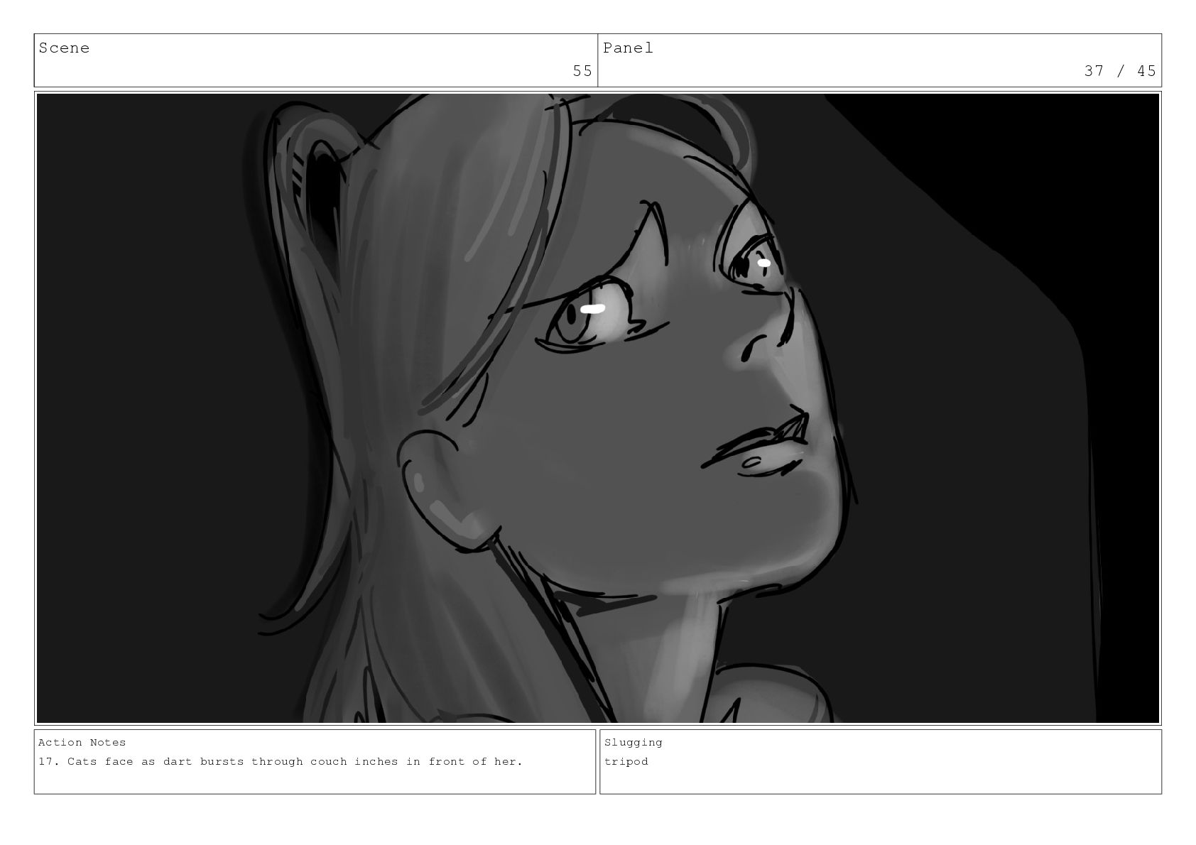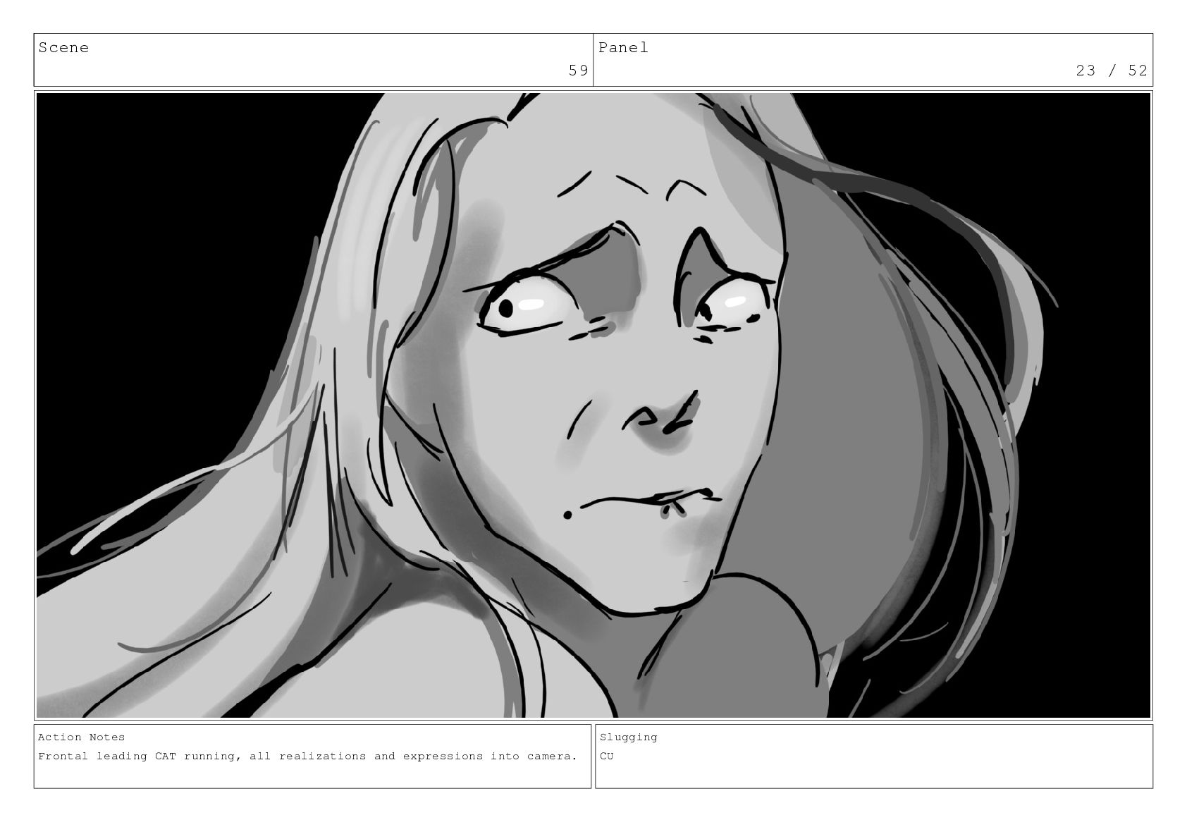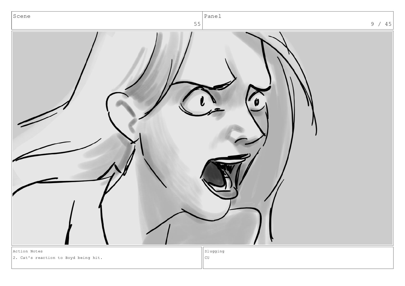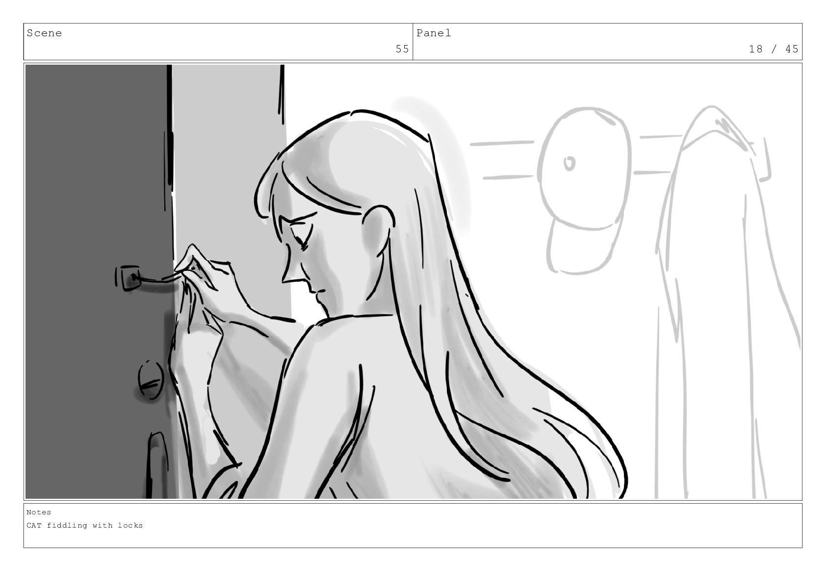 Cat down the hallway. Becomes a side profile of her at the door. The front door is bolted shut. She doesn't have time to undo them. She hears something behind her. Turns. Slugging MS