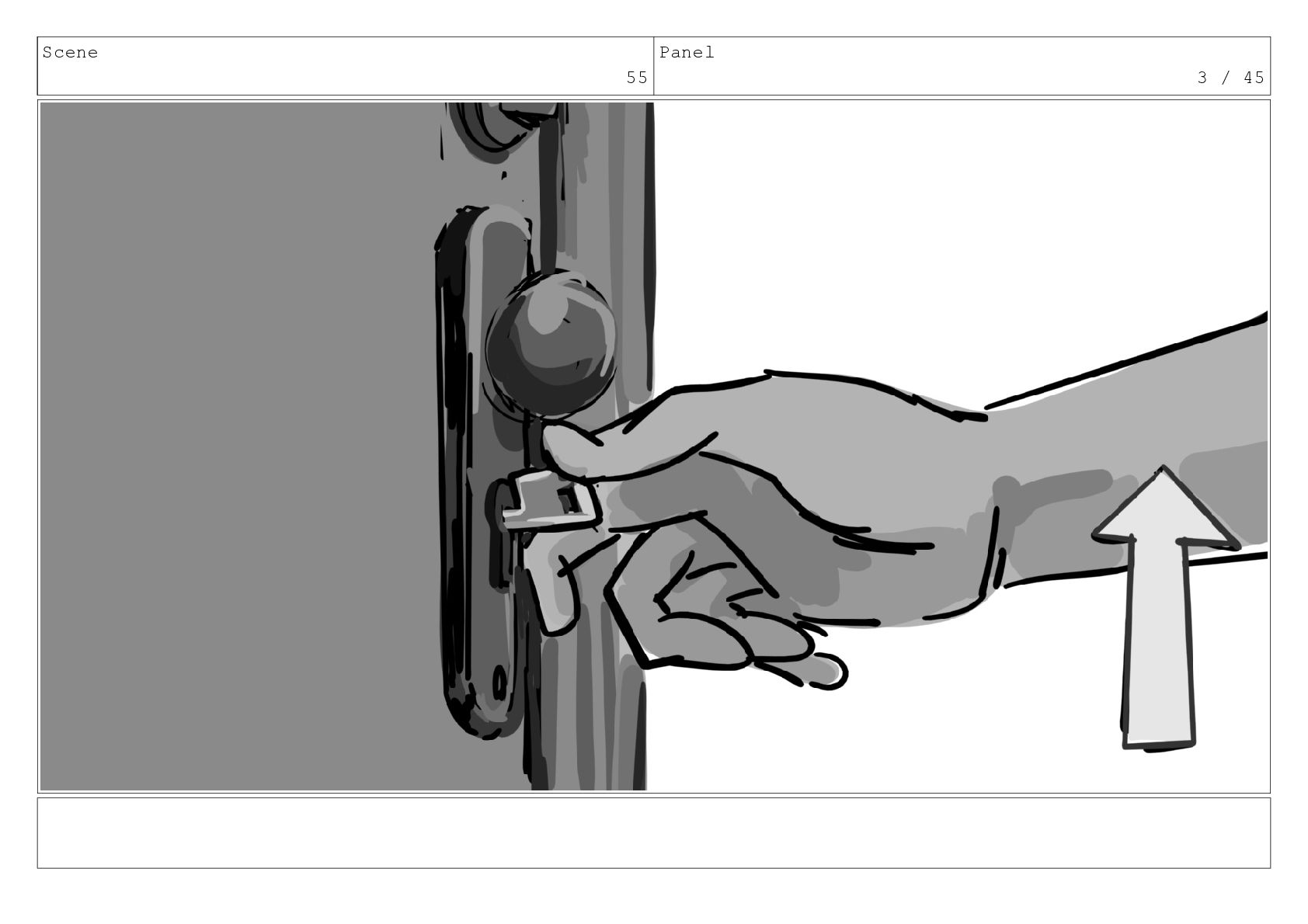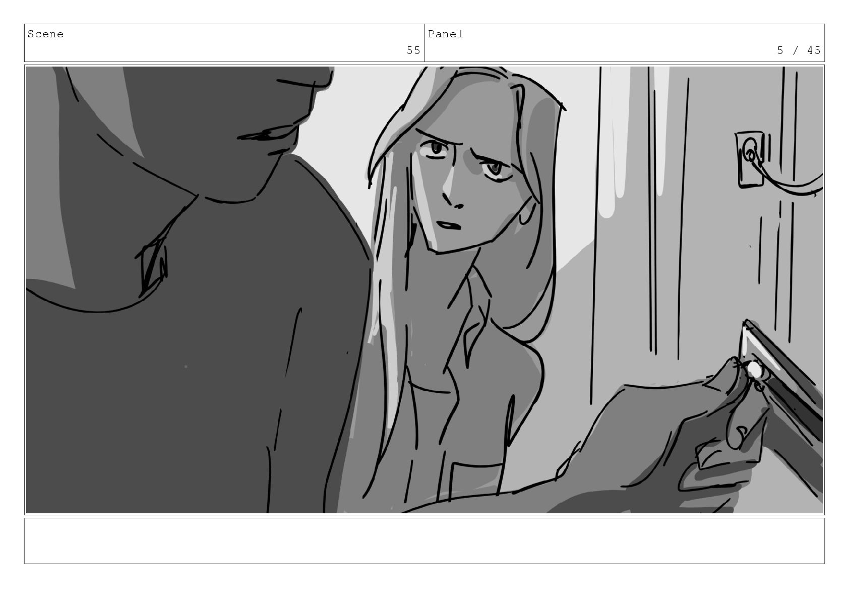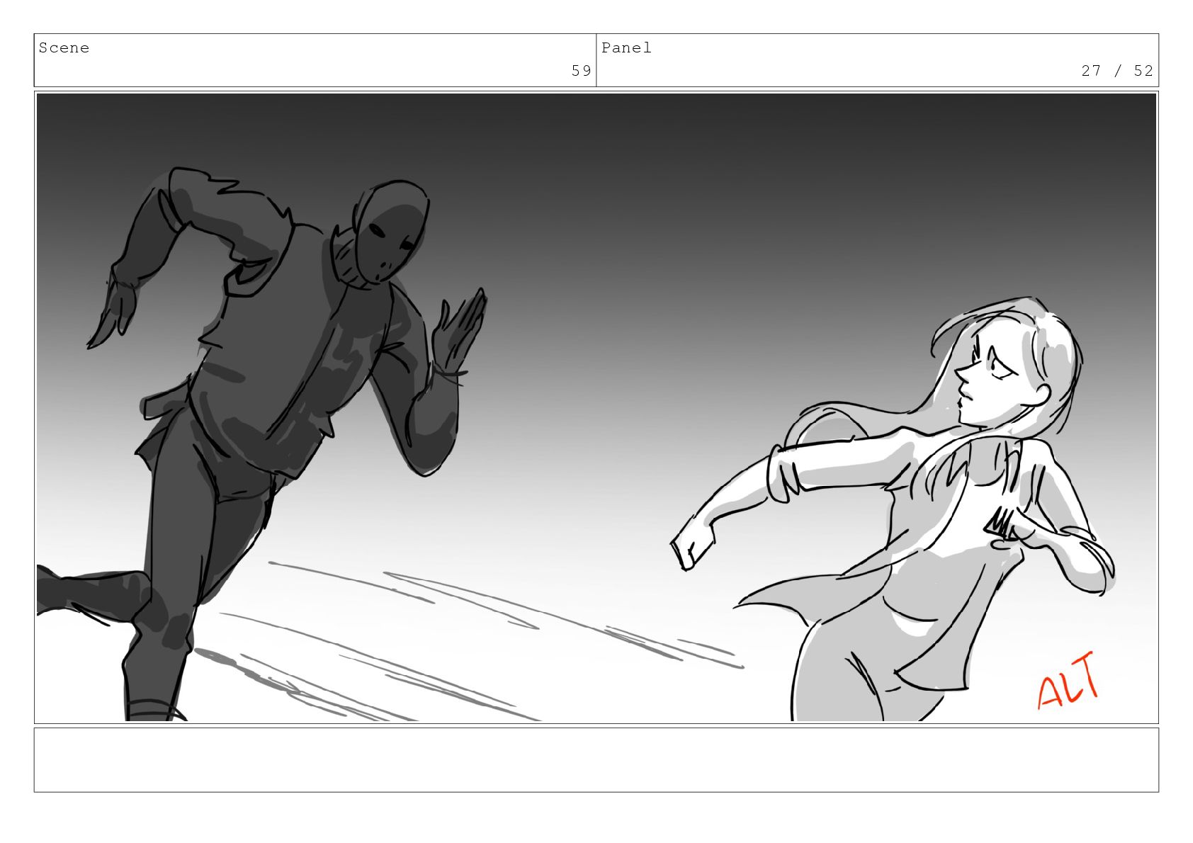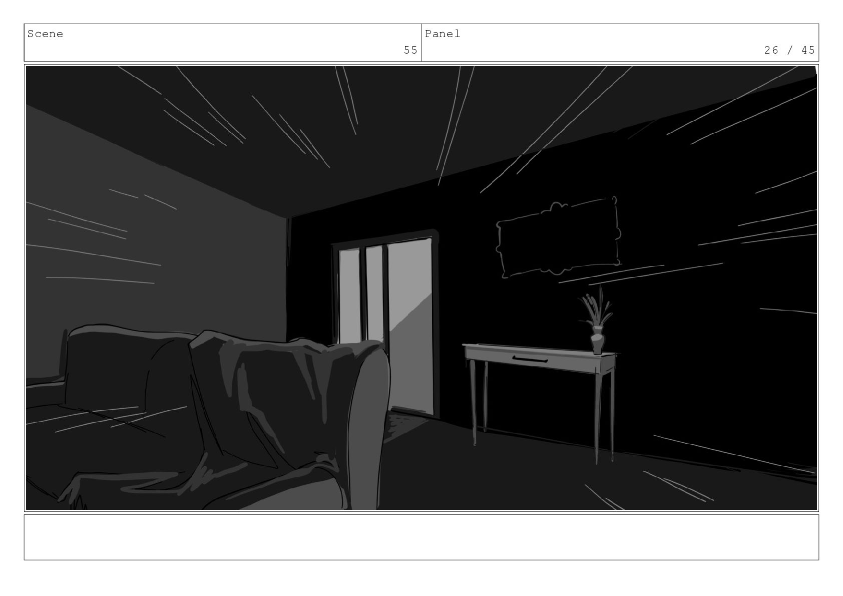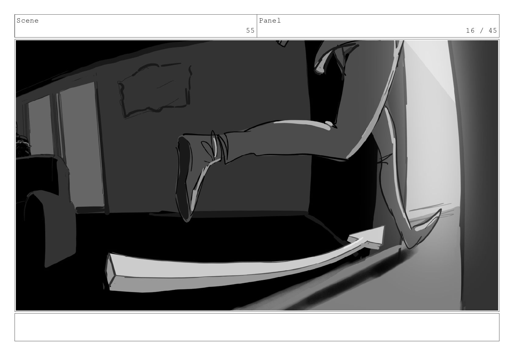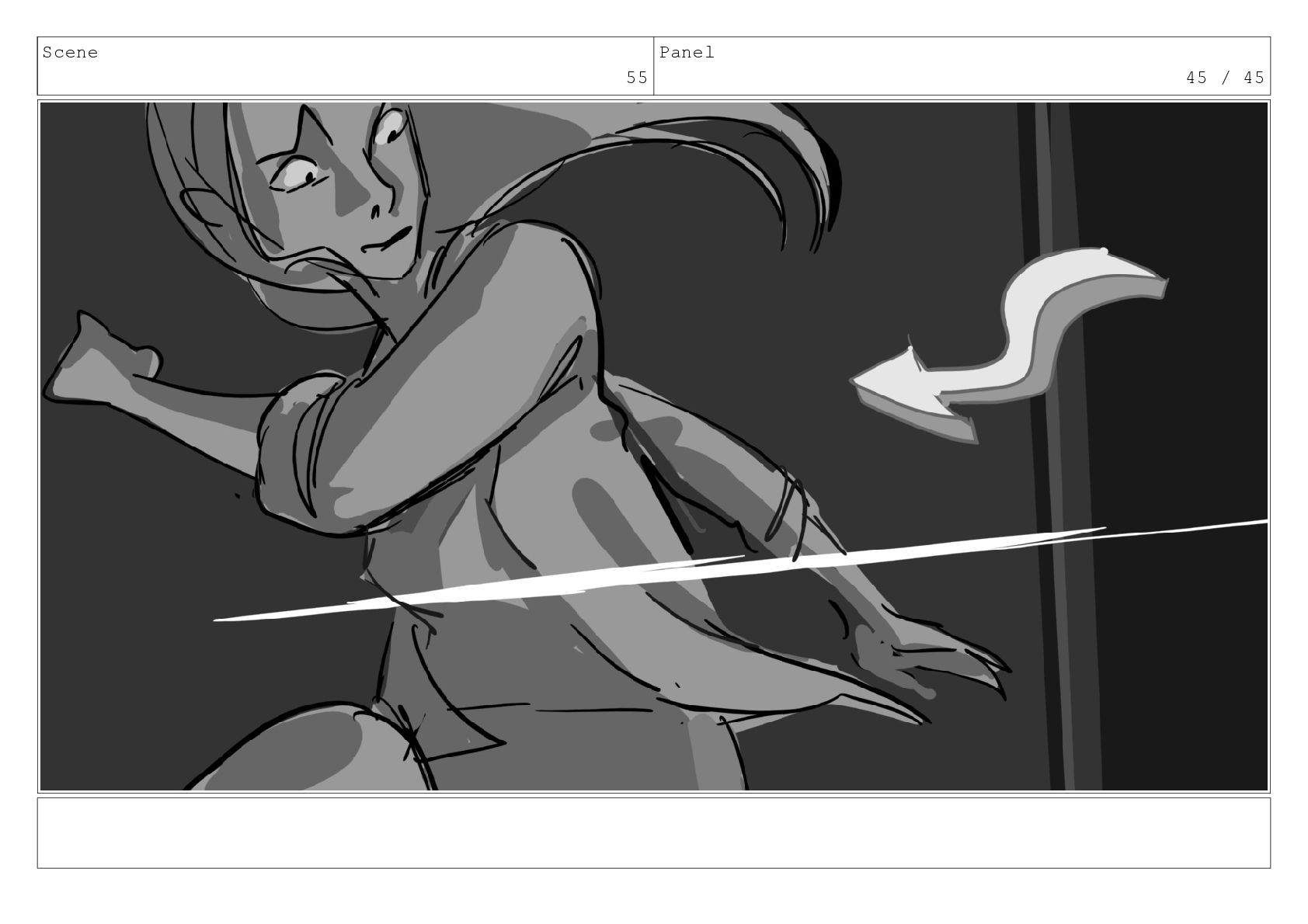 Cat down the hallway. Becomes a side profile of her at the door. The front door is bolted shut. She doesn't have time to undo them. She hears something behind her. Turns. Slugging MS