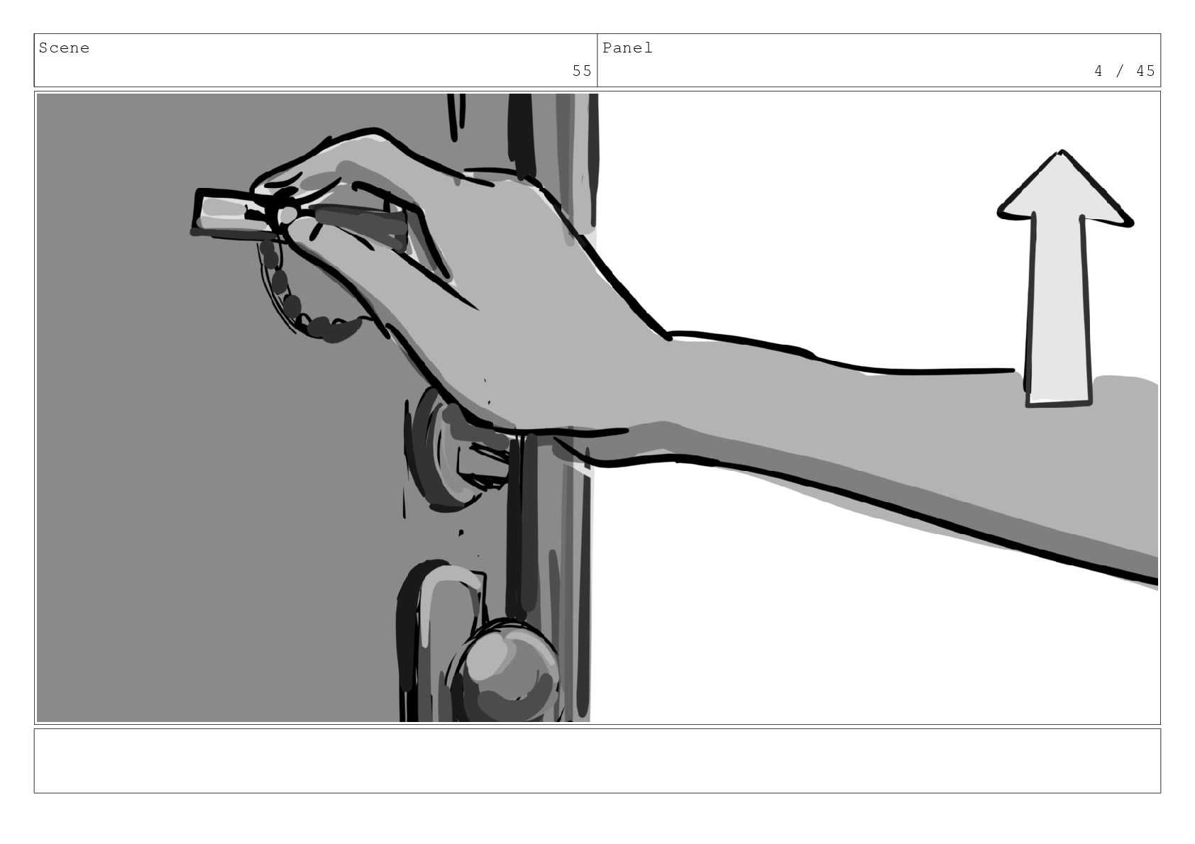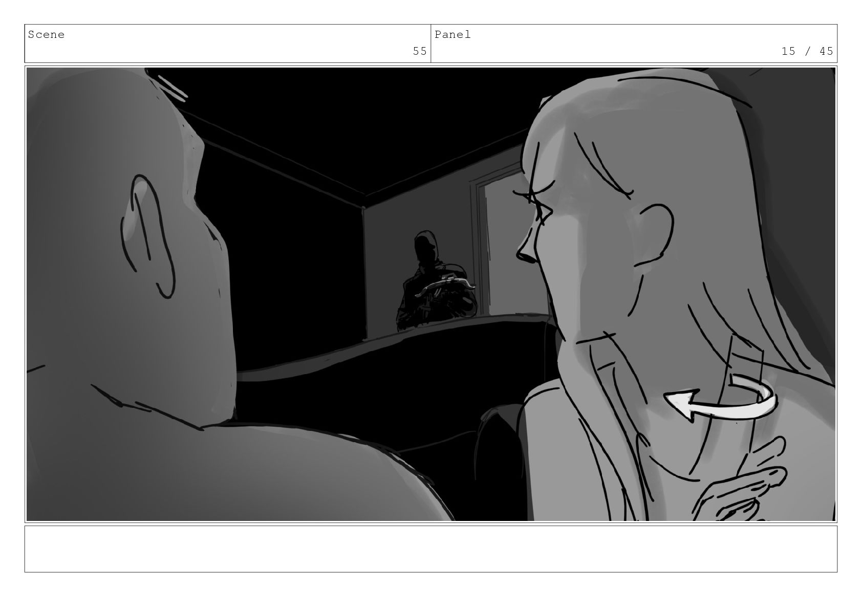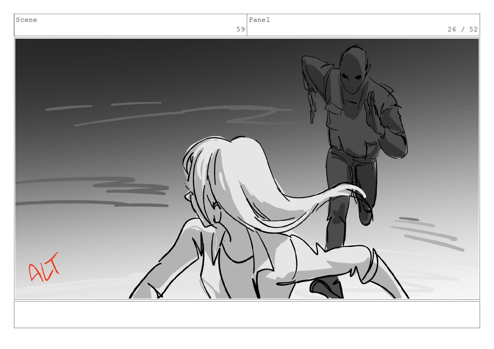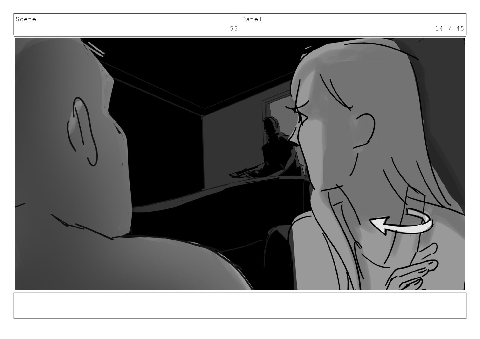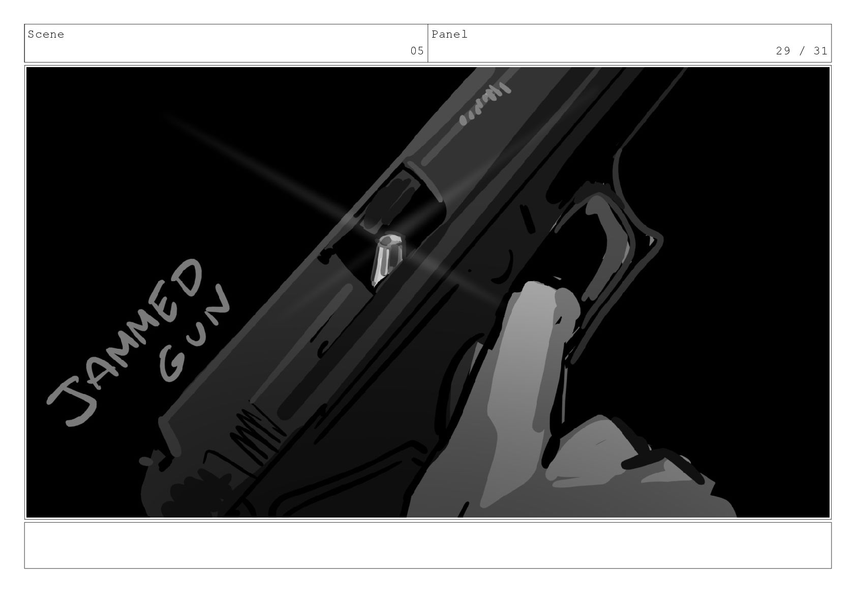 Cat down the hallway. Becomes a side profile of her at the door. The front door is bolted shut. She doesn't have time to undo them. She hears something behind her. Turns. Slugging MS
