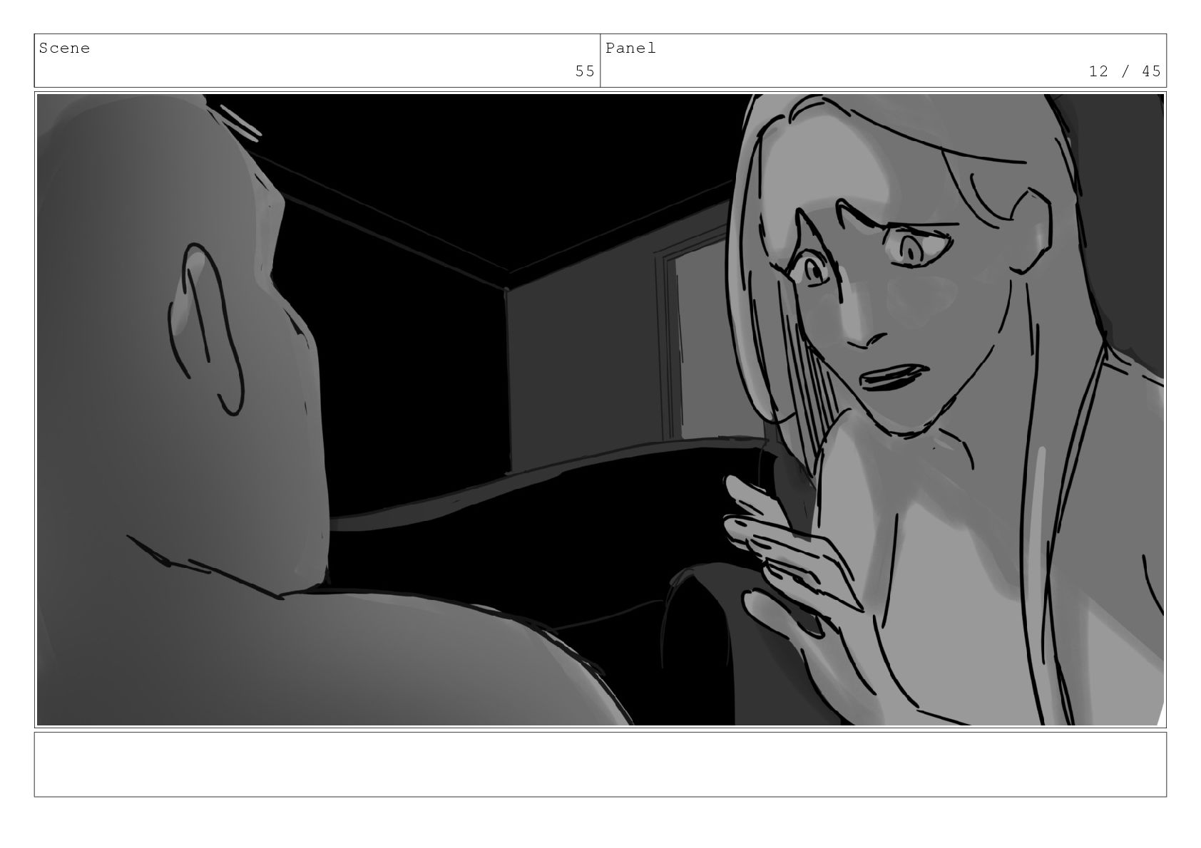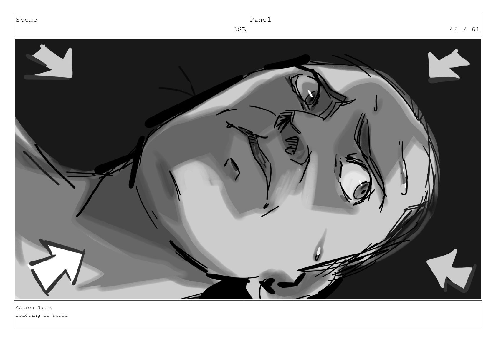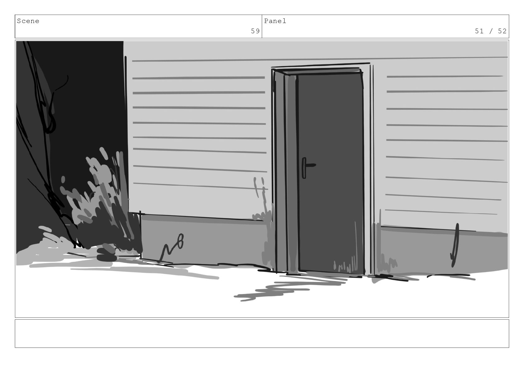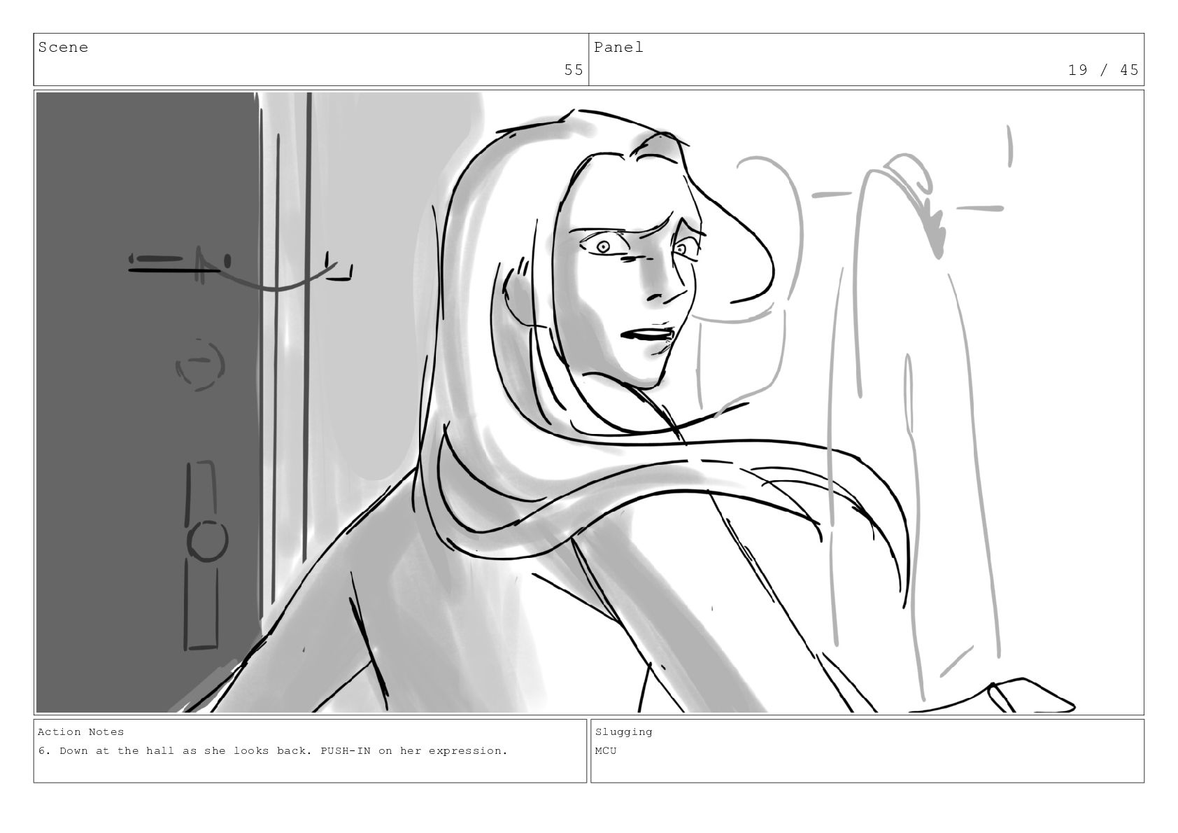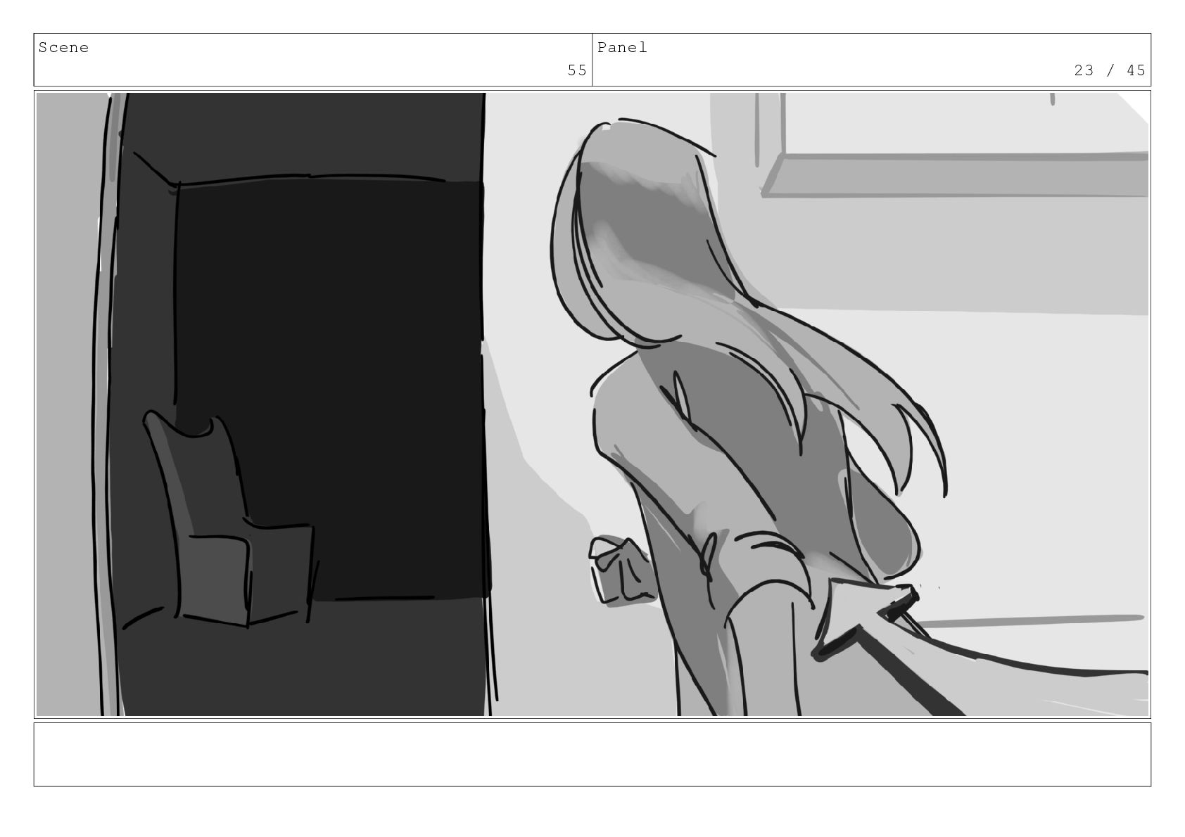 Cat down the hallway. Becomes a side profile of her at the door. The front door is bolted shut. She doesn't have time to undo them. She hears something behind her. Turns. Slugging MS