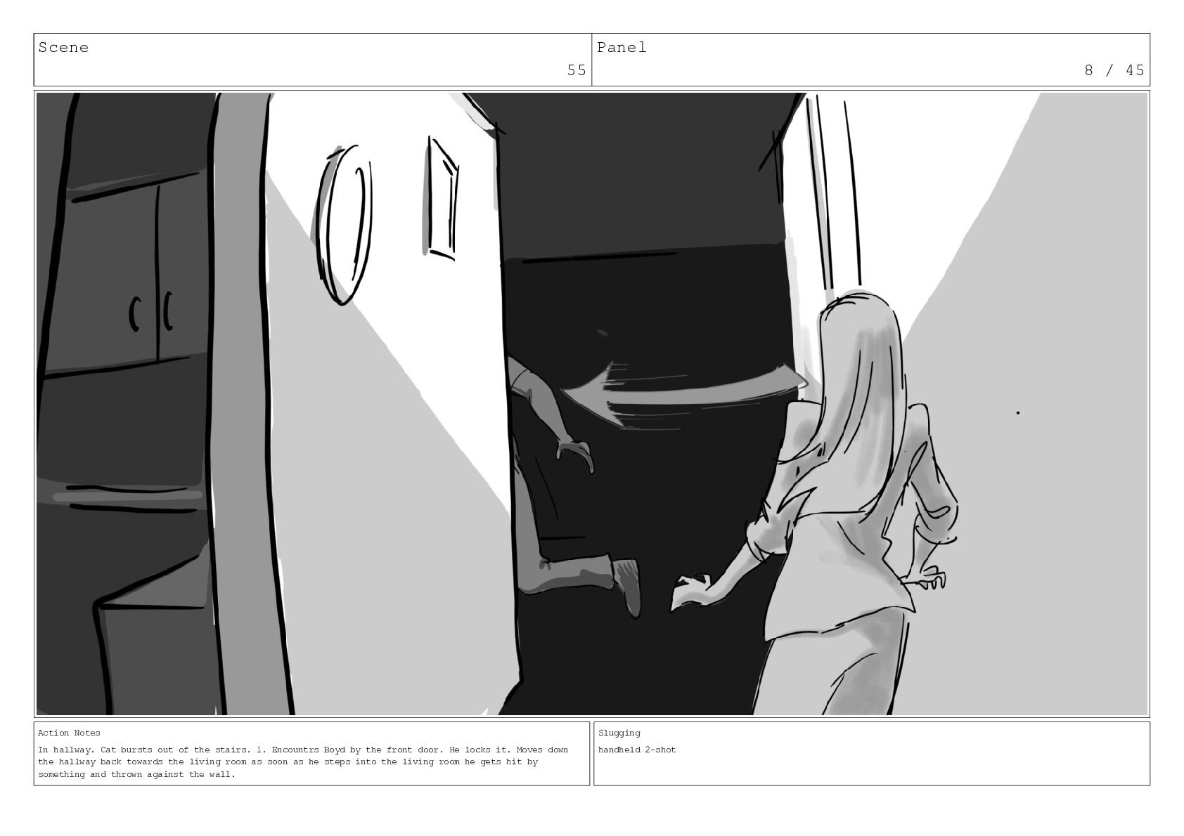 Cat bursts out of the stairs. 1. Encountrs Boyd by the front door. He locks it. Moves down the hallway back towards the living room as soon as he steps into the living room he gets hit by something and thrown against the wall. Slugging handheld 2-shot