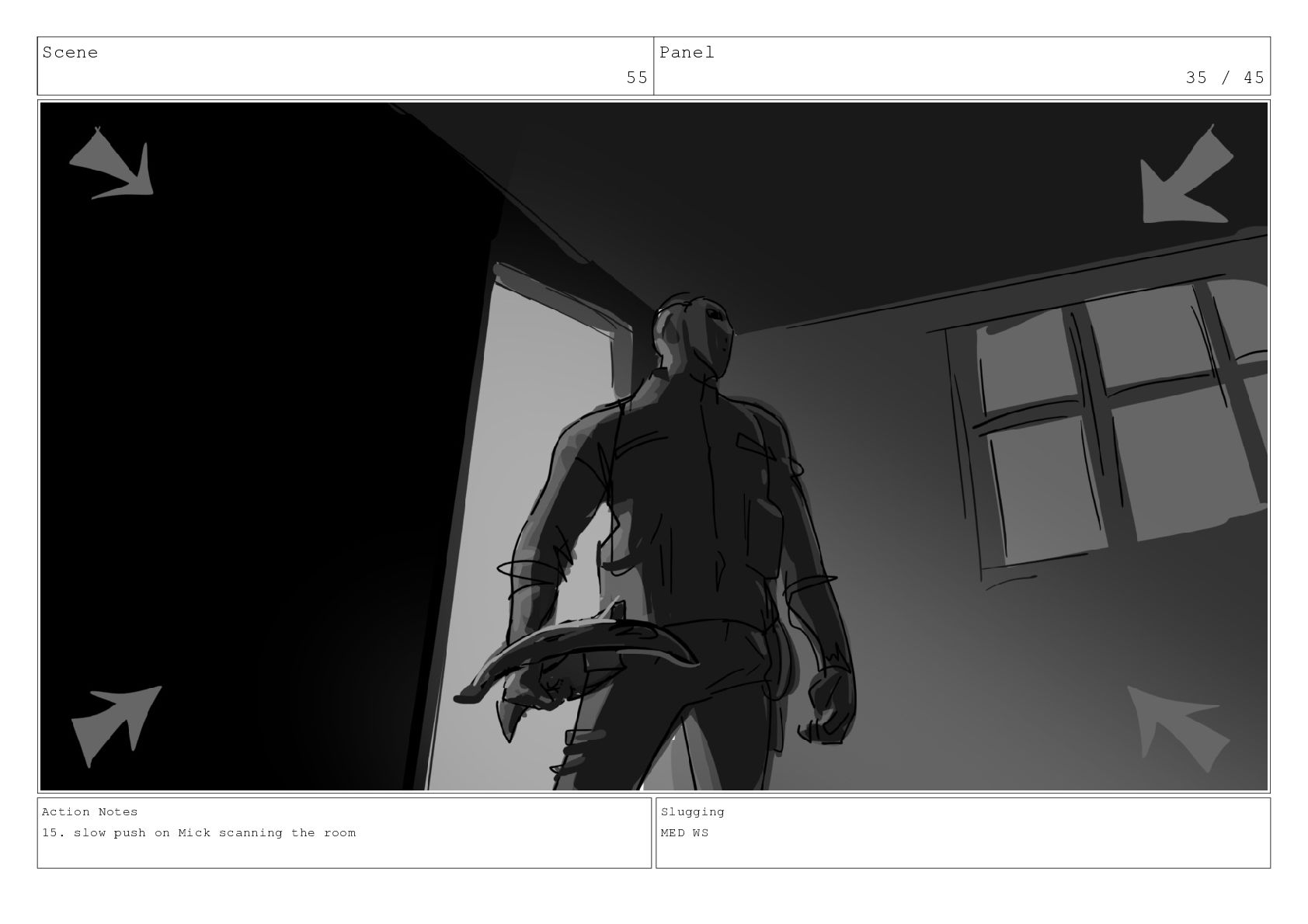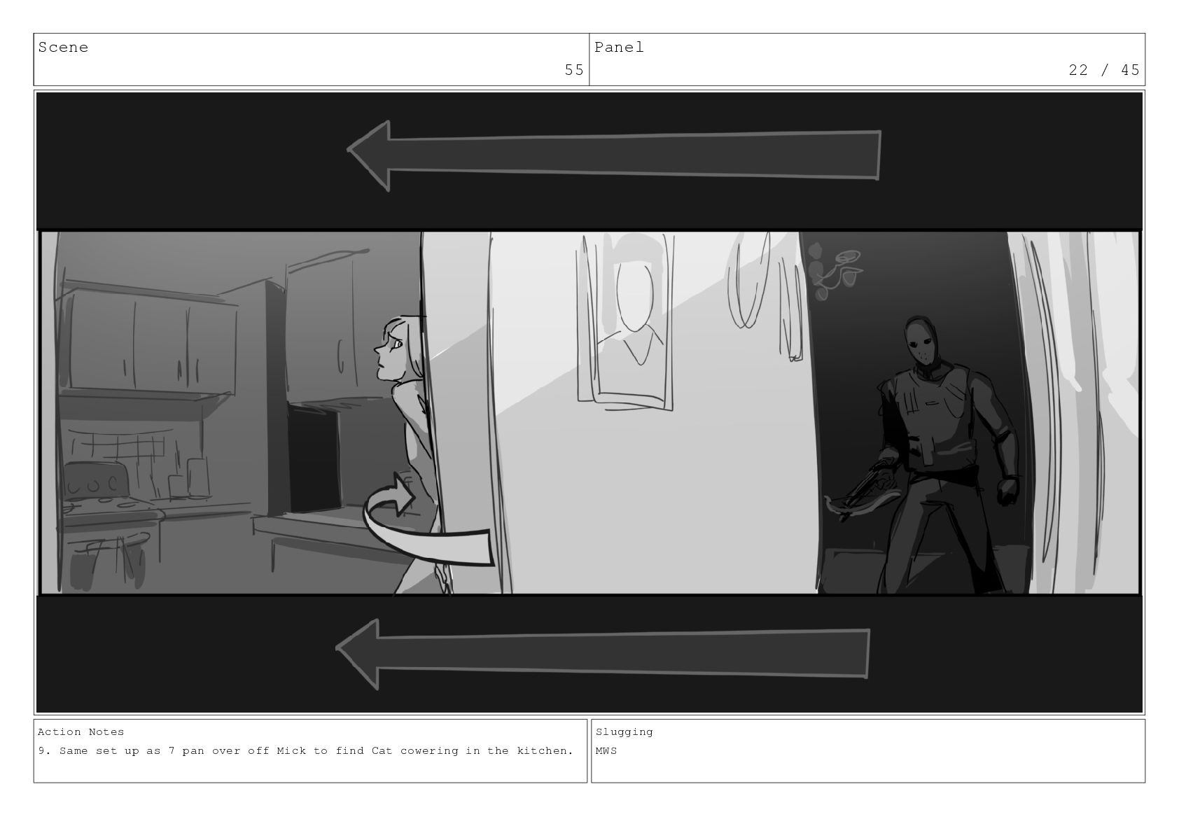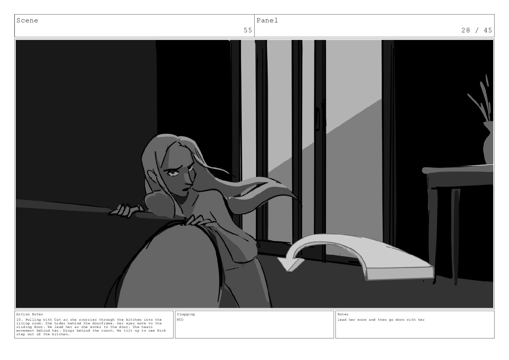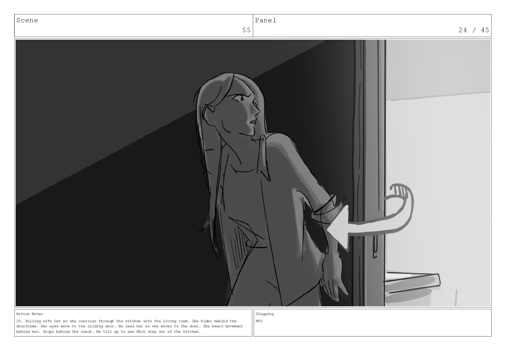 with Cat as she scurries through the kitchen into the living room. She hides behind the doorframe. Her eyes move to the sliding door. We lead her as she moves to the door. She hears movement behind her. Drops behind the couch. We tilt up to see Mick step out of the kitchen. Slugging MCU Notes lead her more and then go down with her