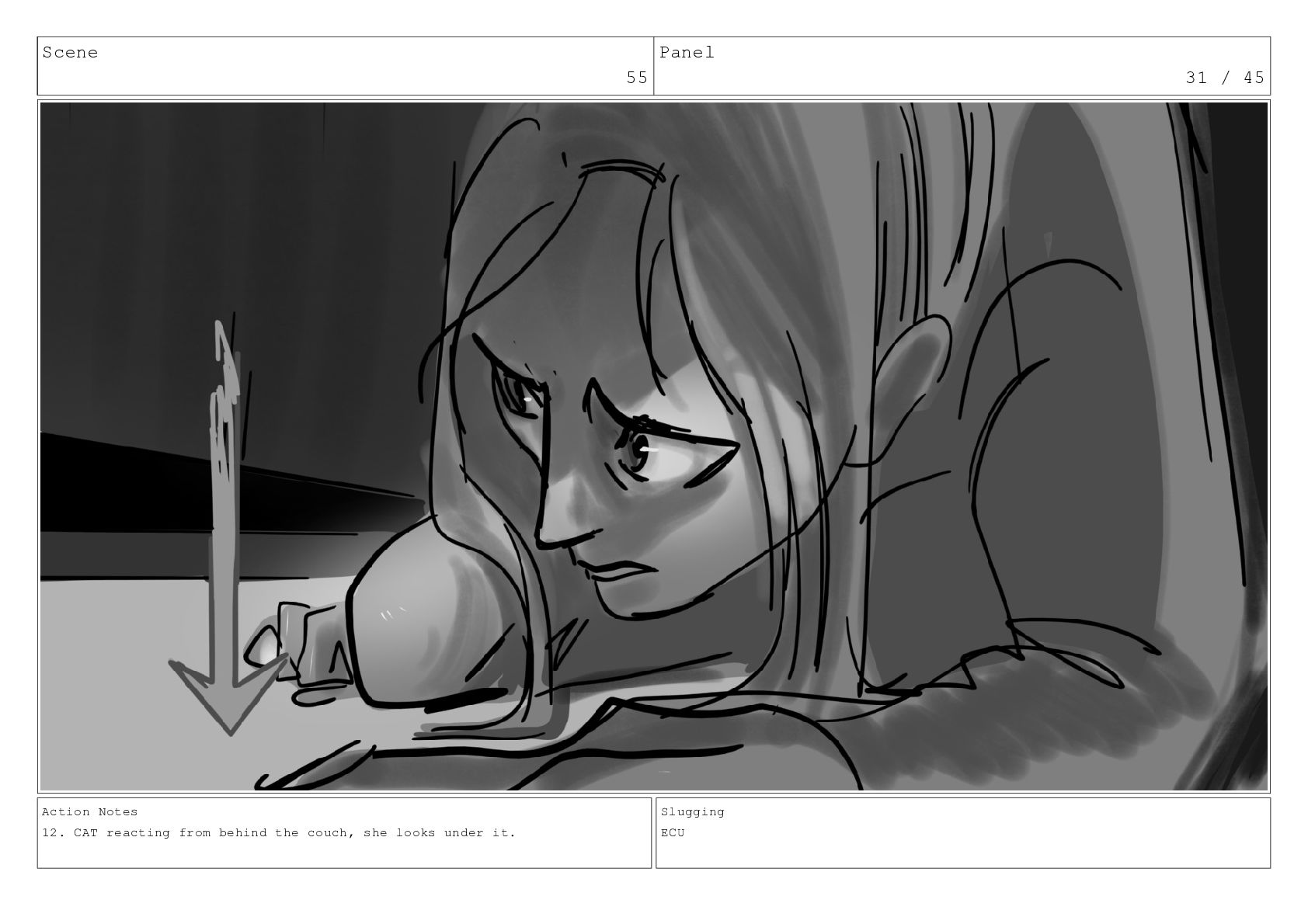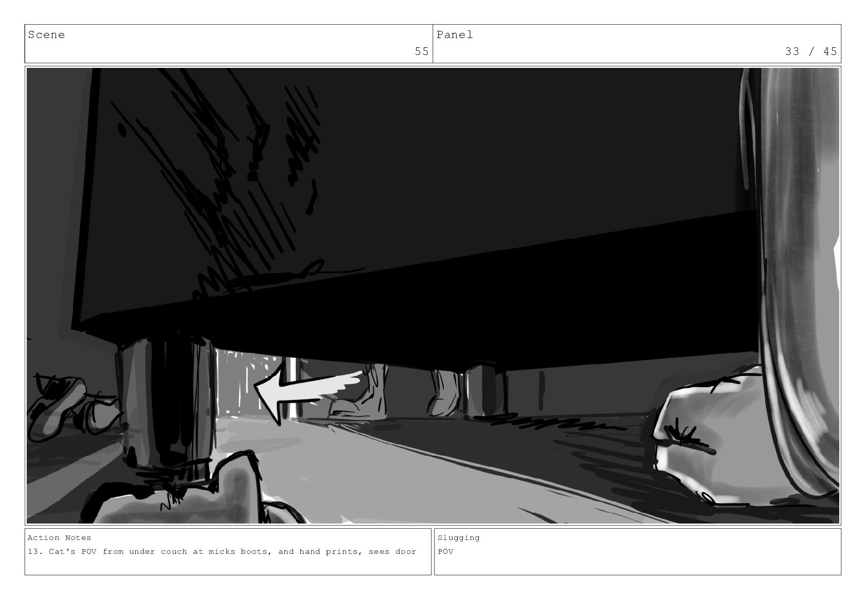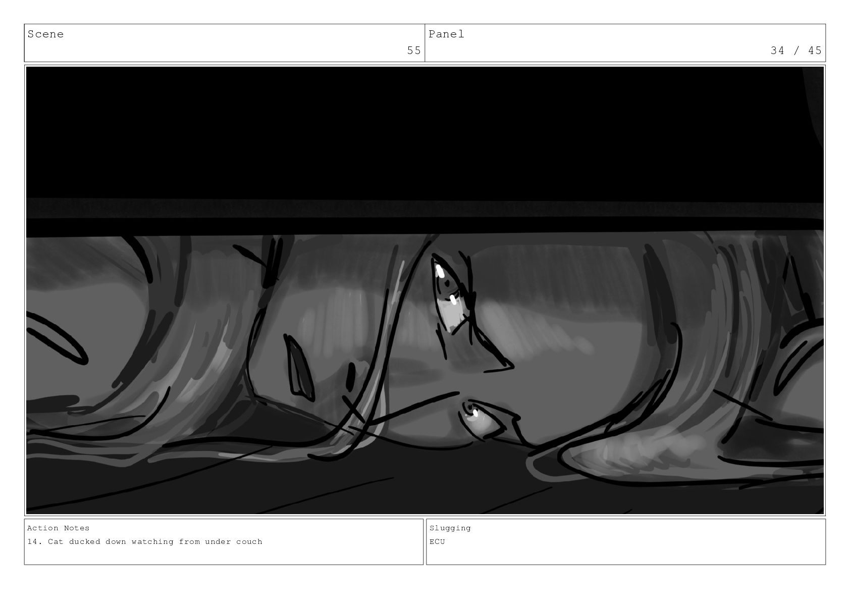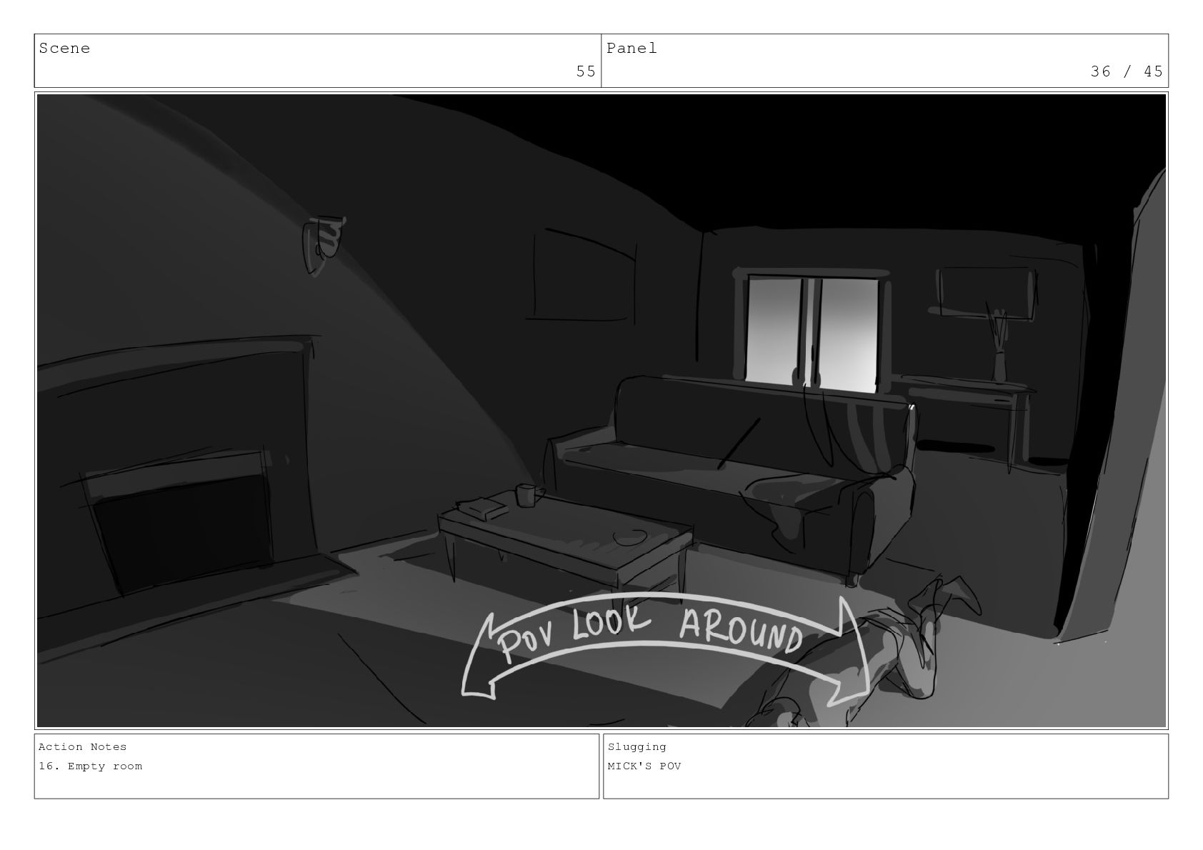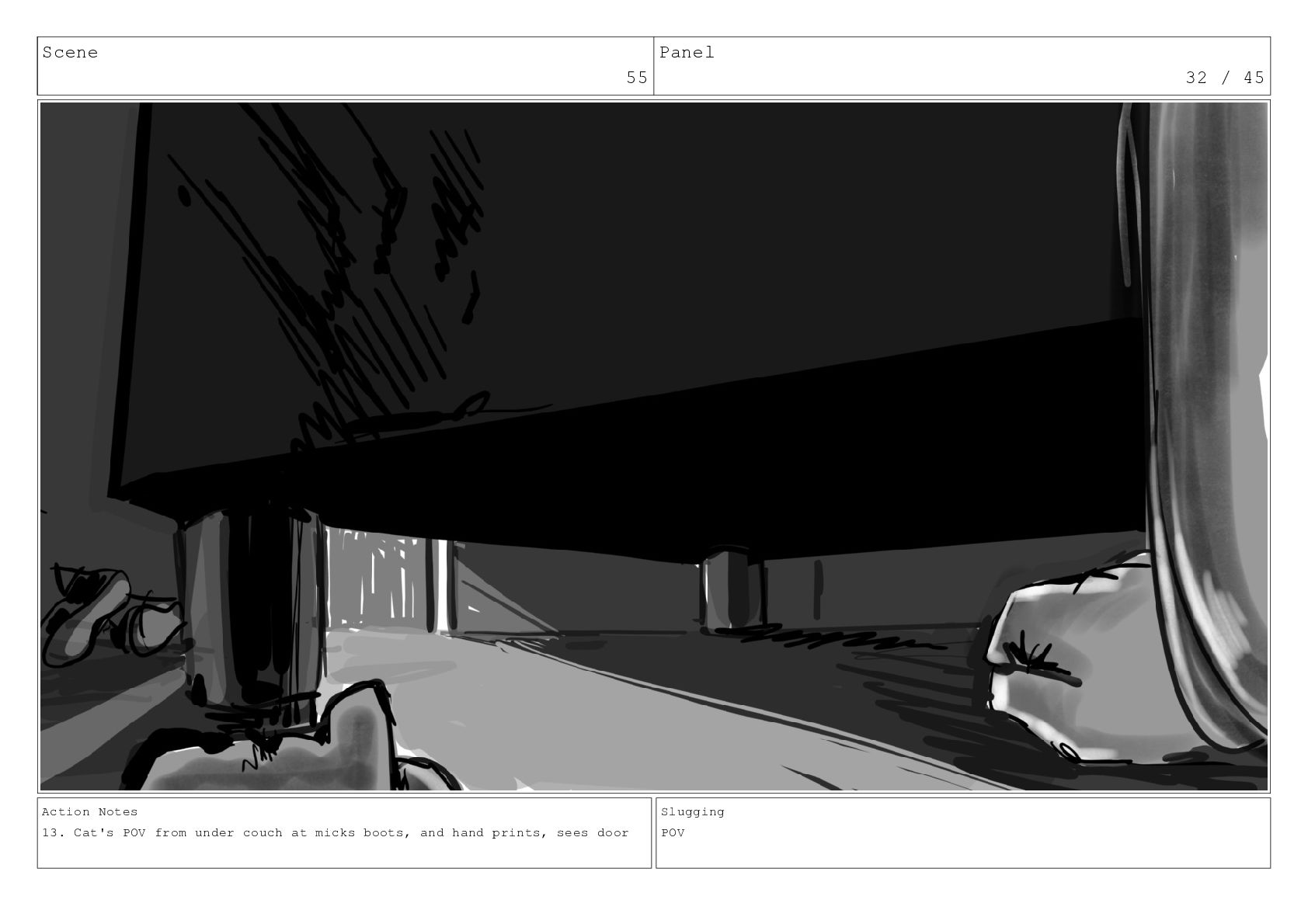 with Cat as she scurries through the kitchen into the living room. She hides behind the doorframe. Her eyes move to the sliding door. We lead her as she moves to the door. She hears movement behind her. Drops behind the couch. We tilt up to see Mick step out of the kitchen. Slugging MCU Notes lead her more and then go down with her
