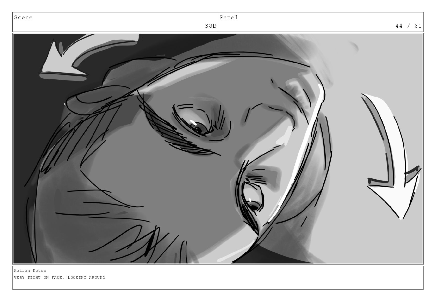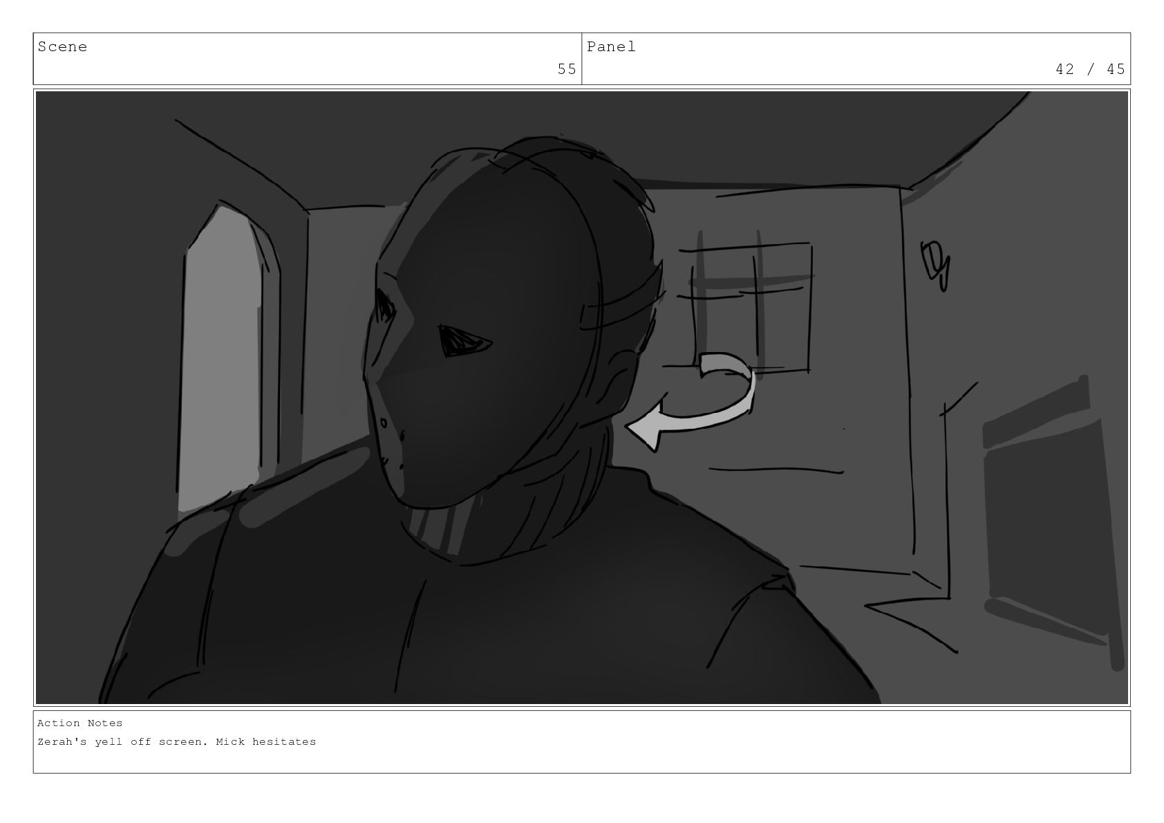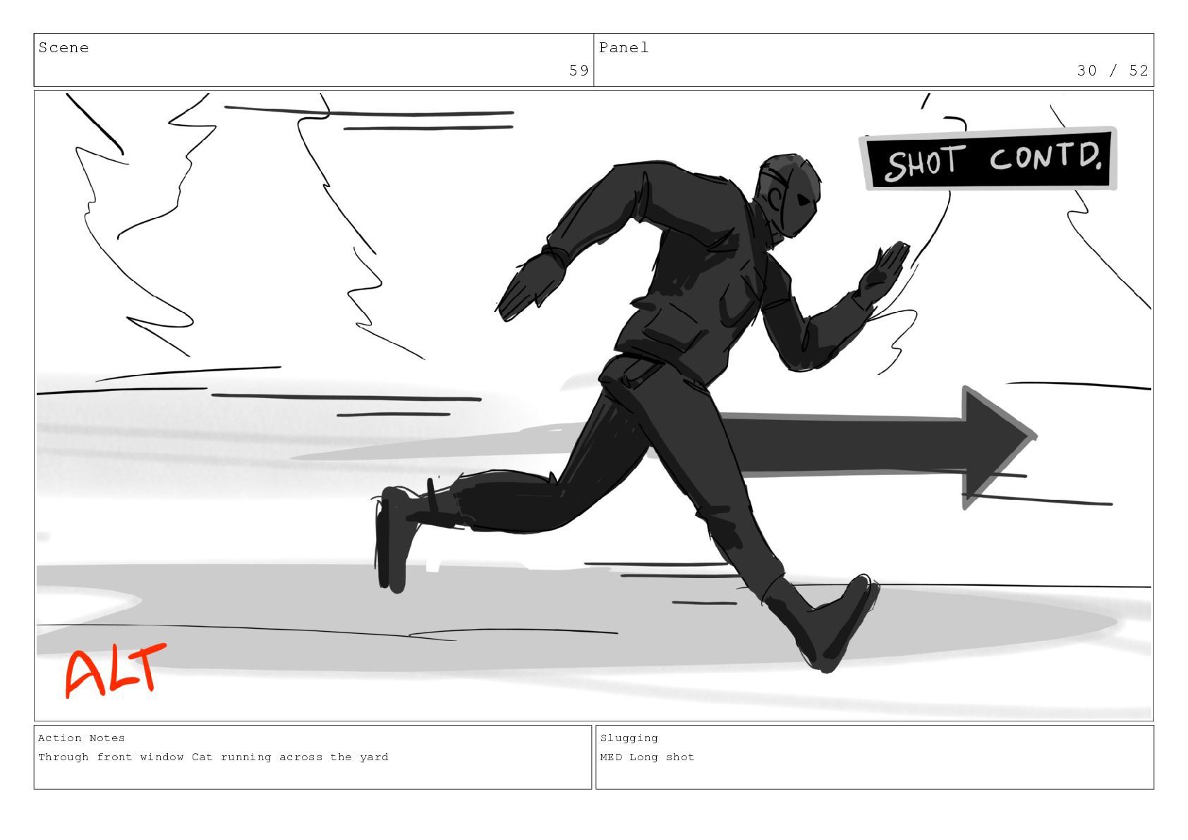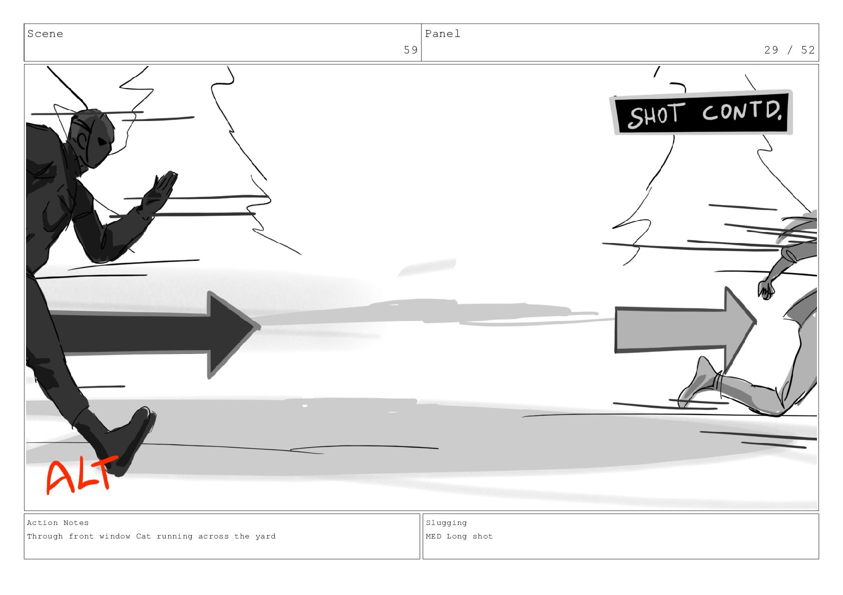 with Cat as she scurries through the kitchen into the living room. She hides behind the doorframe. Her eyes move to the sliding door. We lead her as she moves to the door. She hears movement behind her. Drops behind the couch. We tilt up to see Mick step out of the kitchen. Slugging MCU Notes lead her more and then go down with her