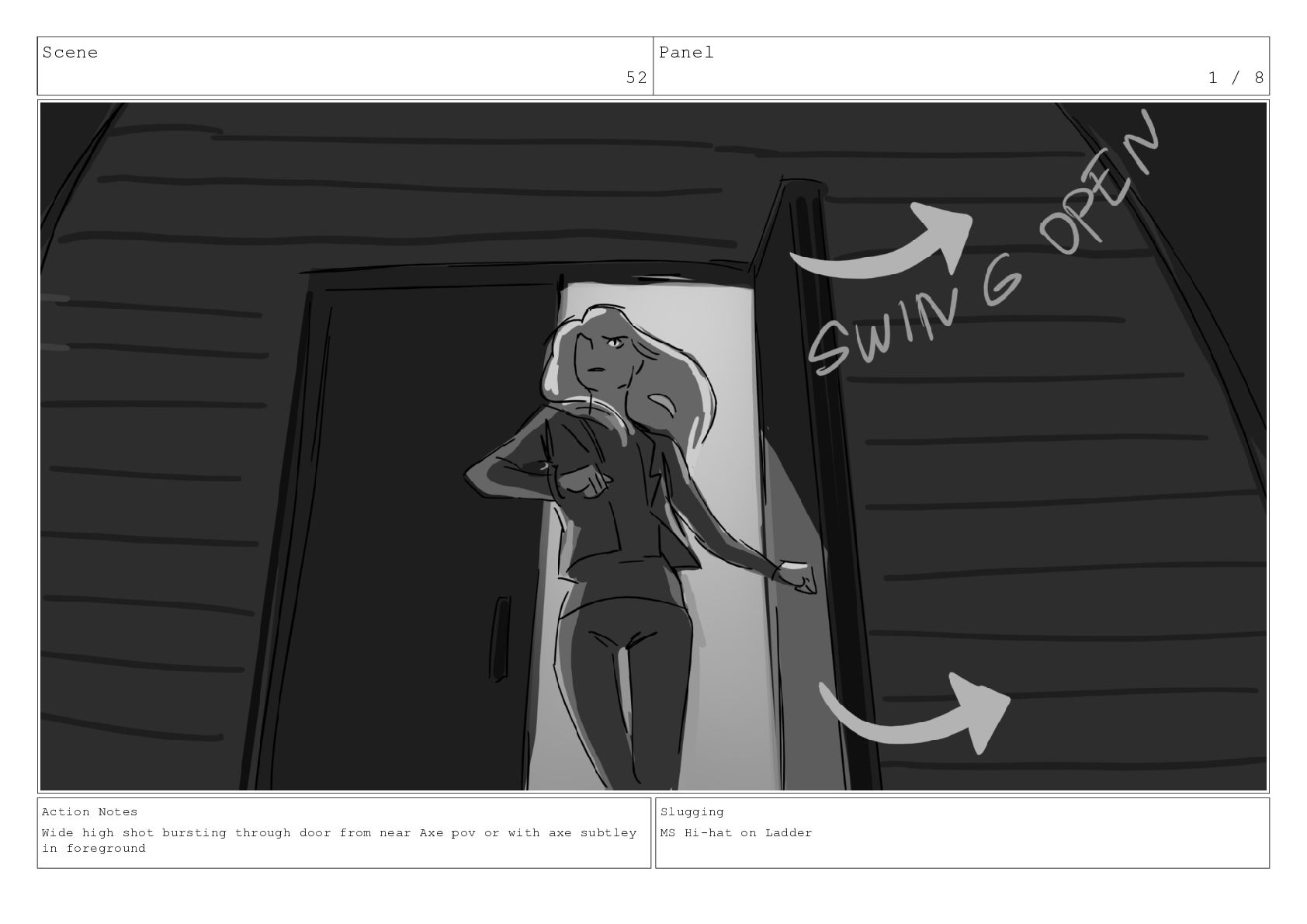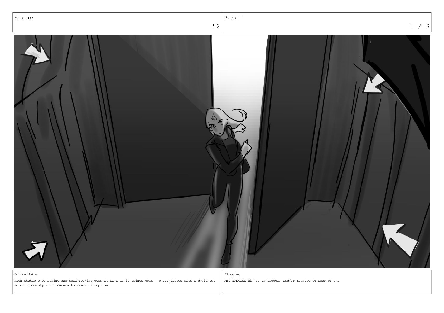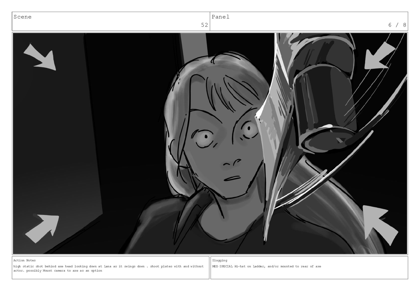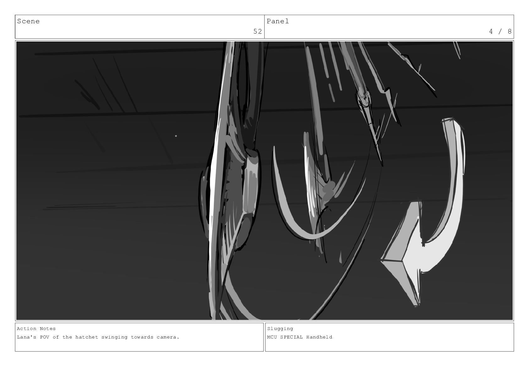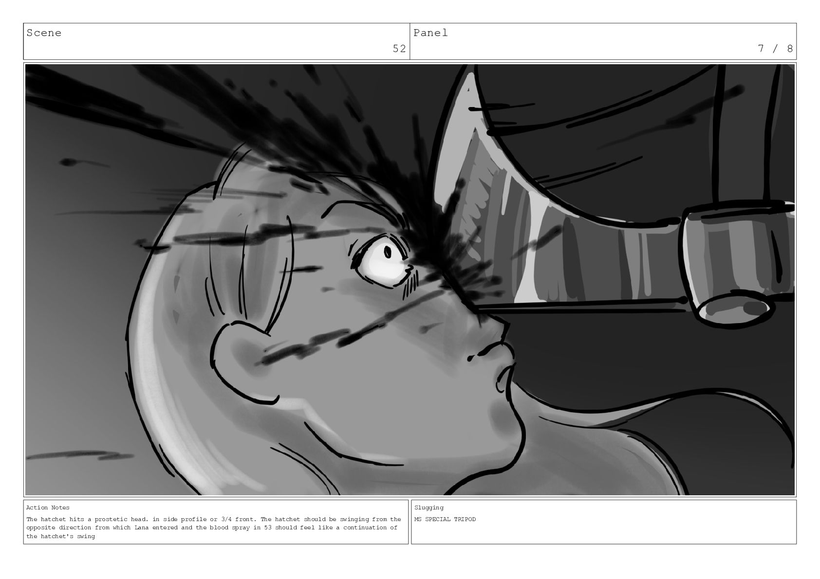 hits a prostetic head. in side profile or 3/4 front. The hatchet should be swinging from the opposite direction from which Lana entered and the blood spray in 53 should feel like a continuation of the hatchet's swing Slugging MS SPECIAL TRIPOD
