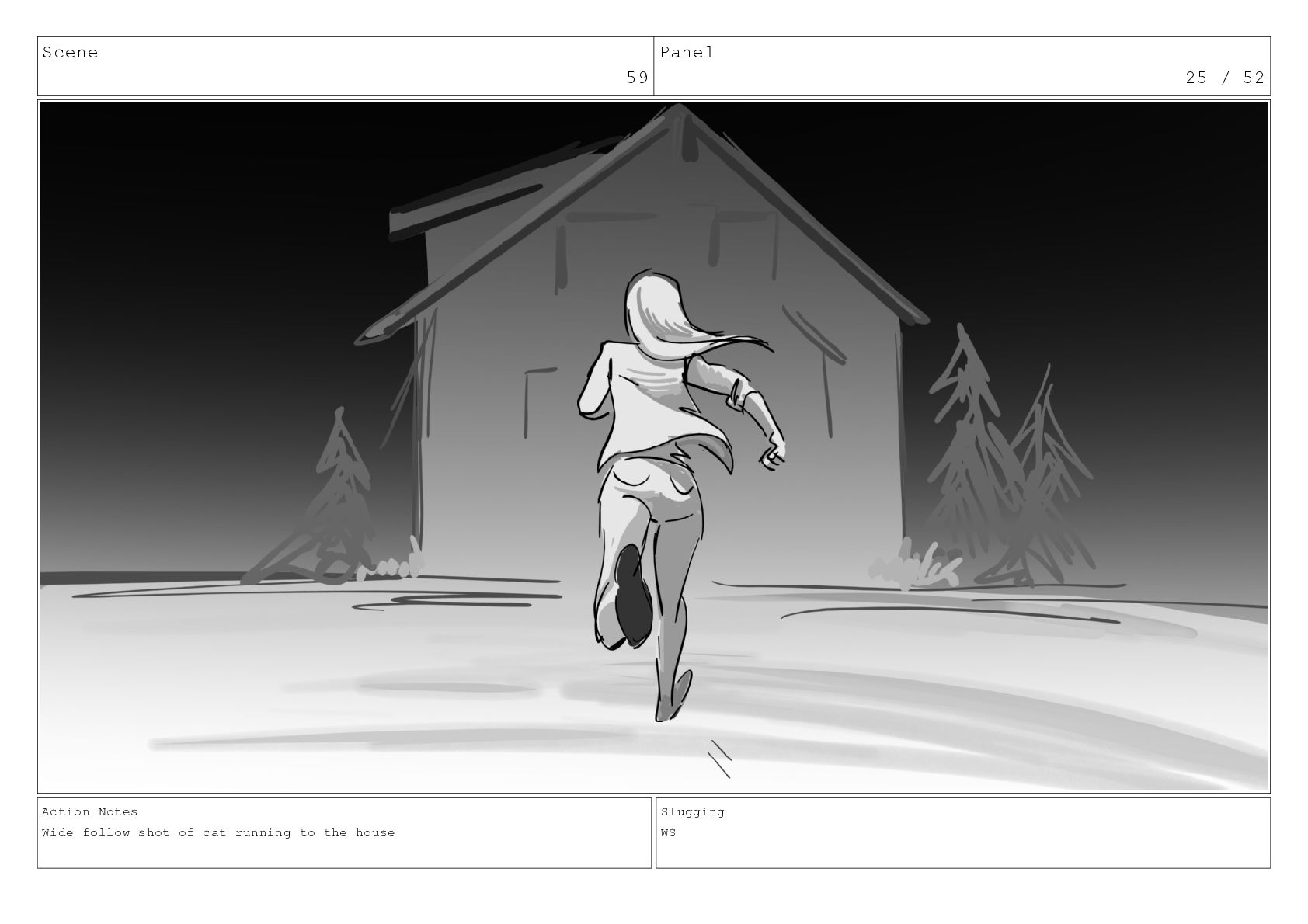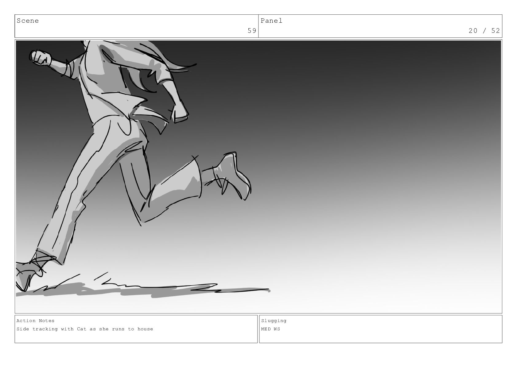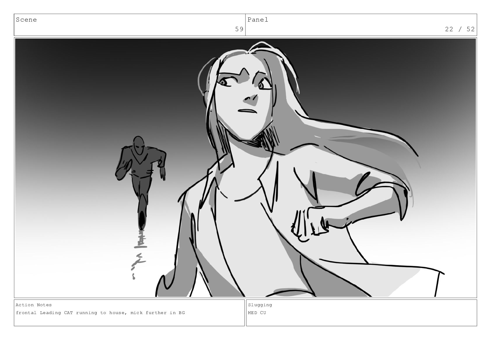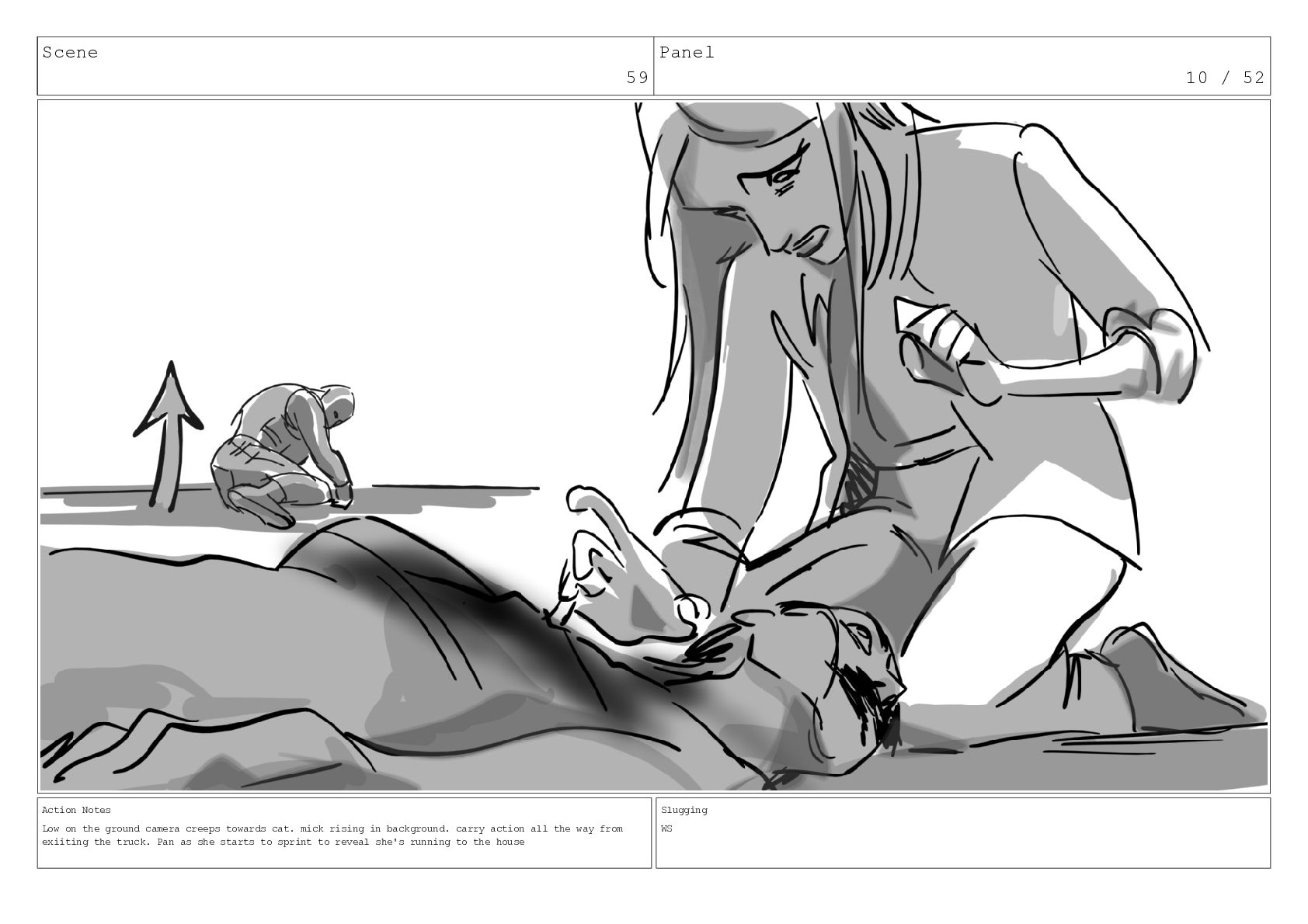 the ground camera creeps towards cat. mick rising in background. carry action all the way from exiiting the truck. Pan as she starts to sprint to reveal she's running to the house Slugging WS