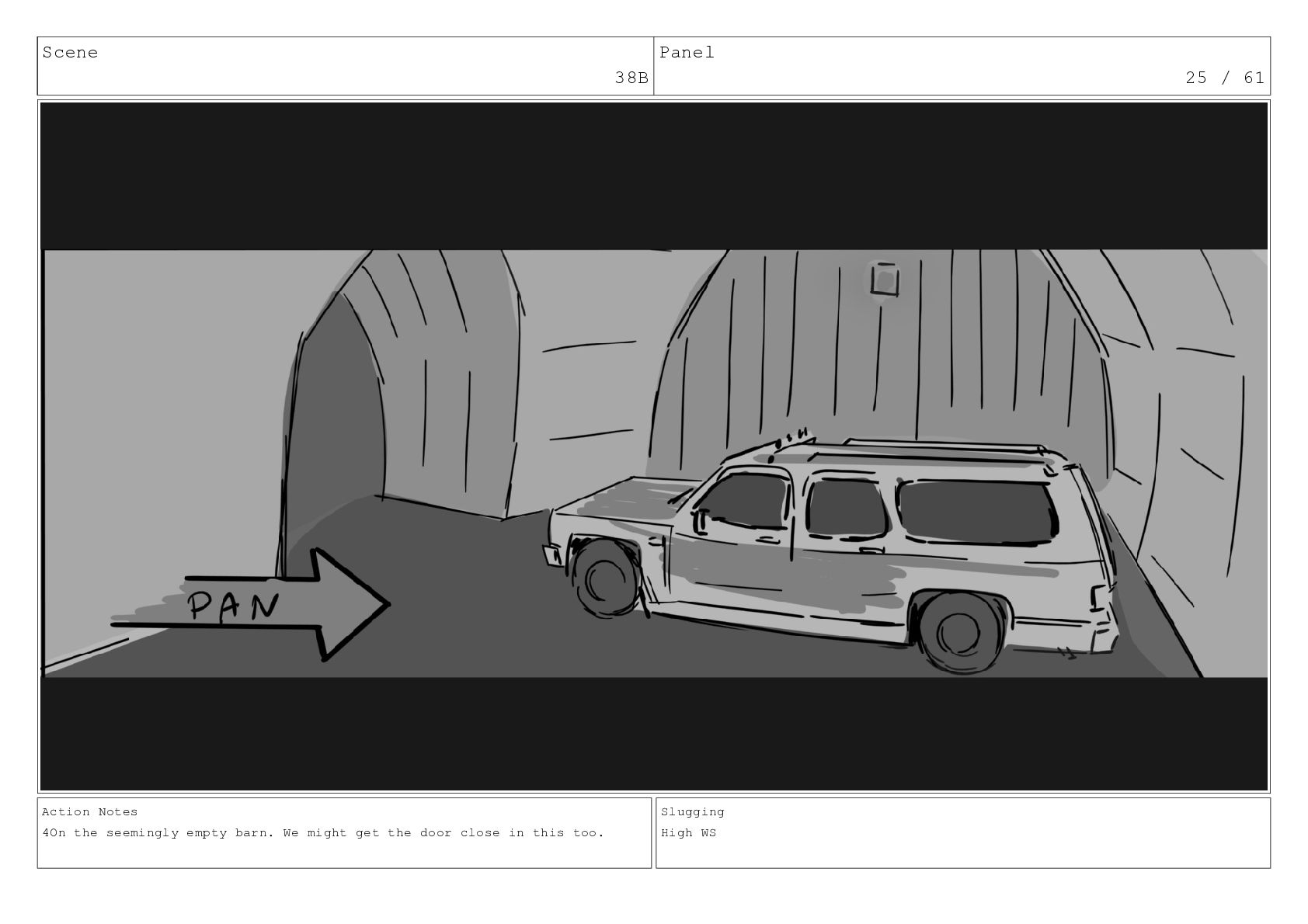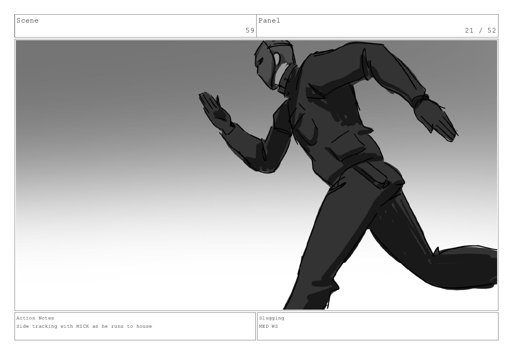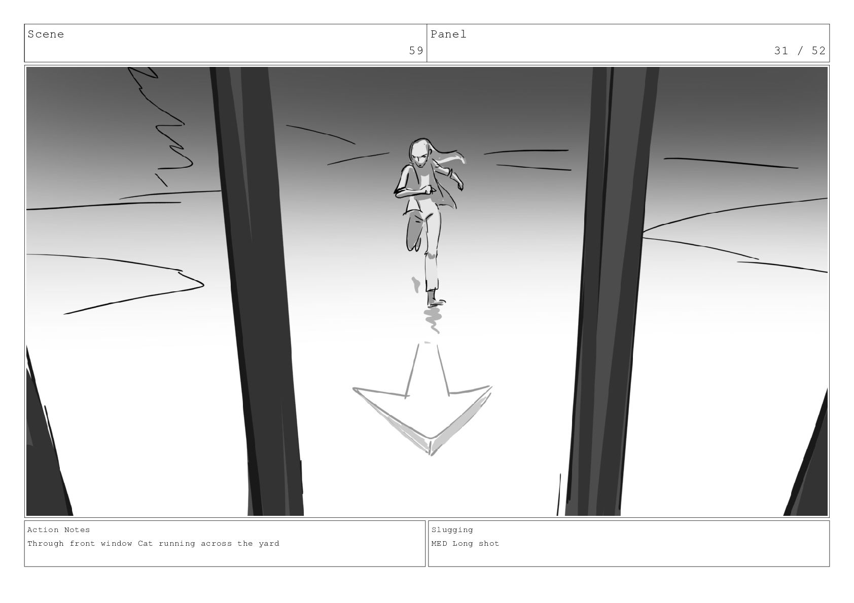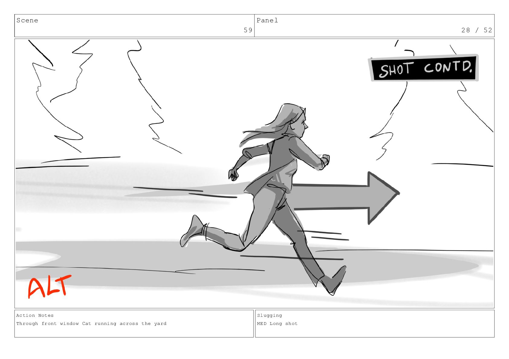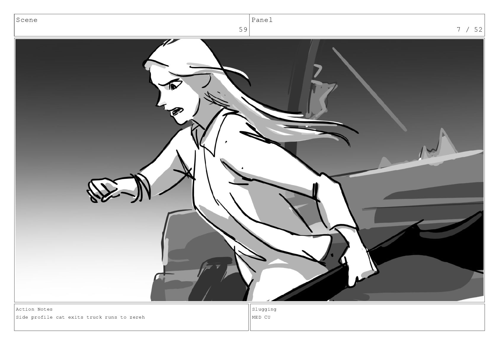 the ground camera creeps towards cat. mick rising in background. carry action all the way from exiiting the truck. Pan as she starts to sprint to reveal she's running to the house Slugging WS