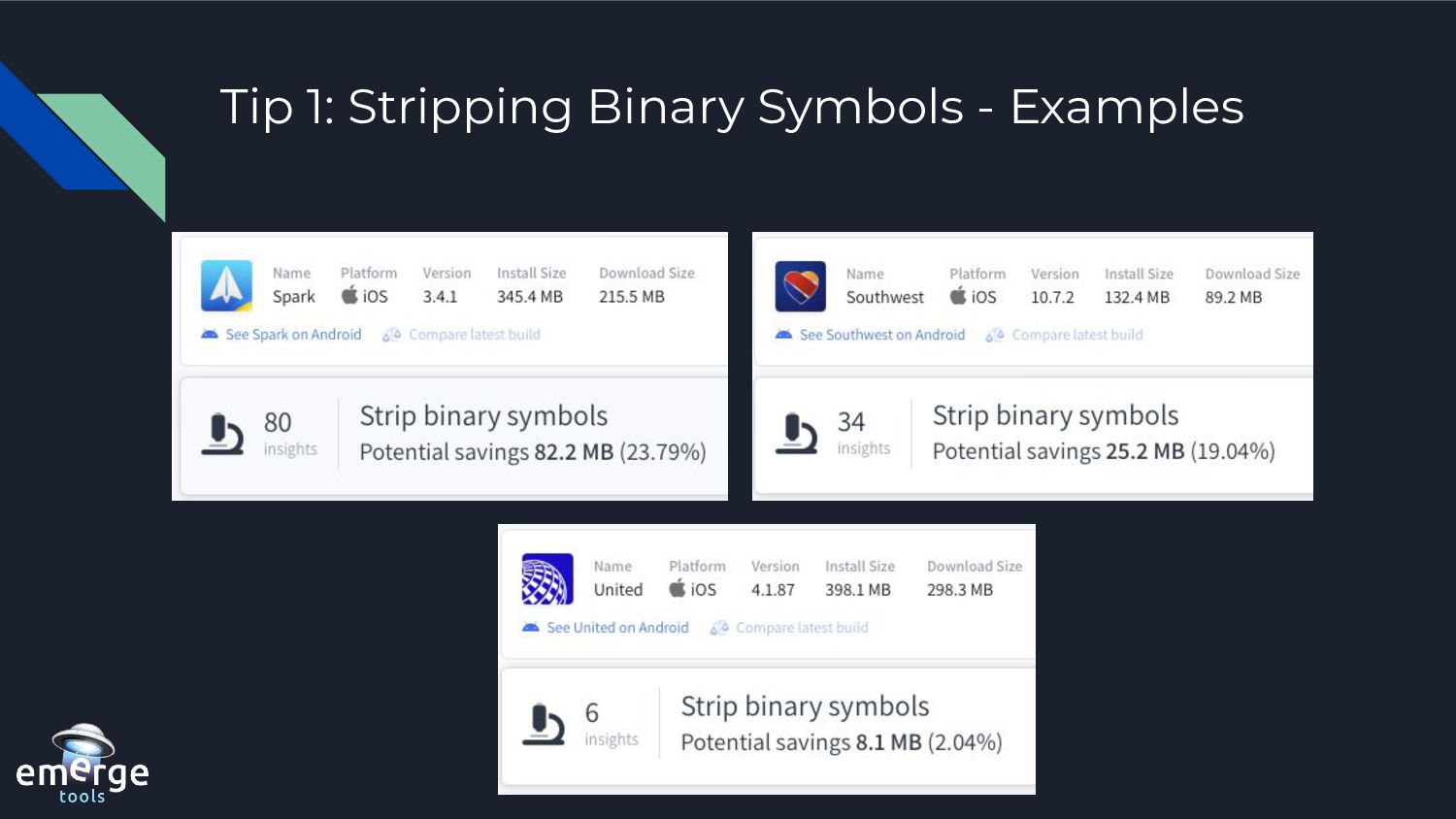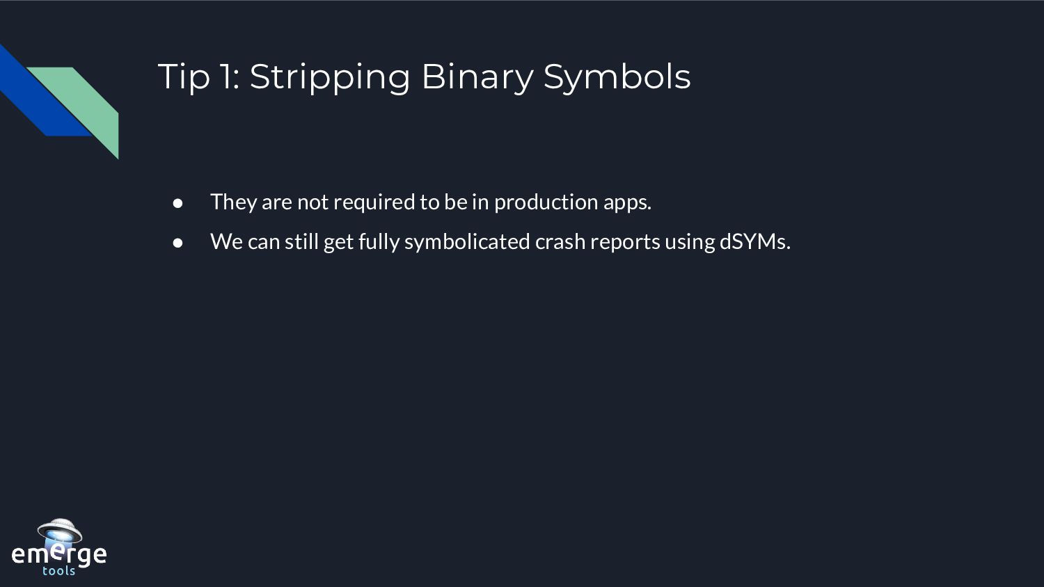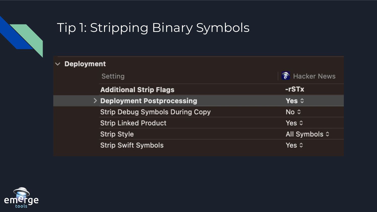 [ "Release" = "${CONFIGURATION}" ]; then # Only do this for release builds # Path to the app directory APP_DIR_PATH="${BUILT_PRODUCTS_DIR}/${EXECUTABLE_FOLDER_PATH}" # Strip main binary strip -rSTx "${APP_DIR_PATH}/${EXECUTABLE_NAME}" # Path to the Frameworks directory APP_FRAMEWORKS_DIR="${APP_DIR_PATH}/Frameworks" # Strip symbols from frameworks, if Frameworks/ exists at all # ... as long as the framework is NOT signed by Apple if [ -d "${APP_FRAMEWORKS_DIR}" ] then find "${APP_FRAMEWORKS_DIR}" -type f -perm +111 -maxdepth 2 -mindepth 2 -exec bash -c 'codesign -v -R="anchor apple" "{}" &> /dev/null || (echo "{}" && strip -rSTx "{}")' \\; fi # fi