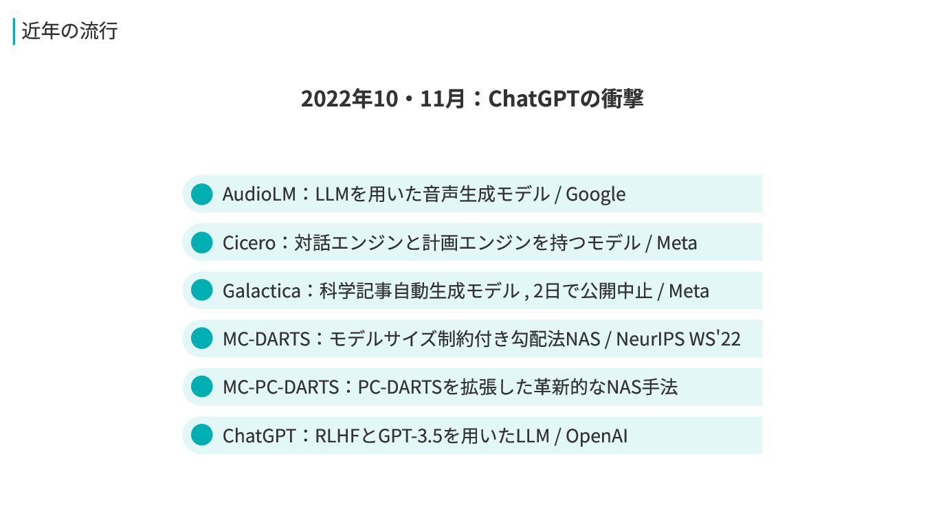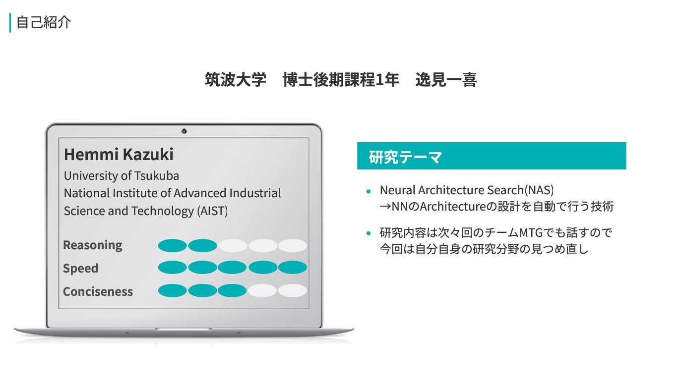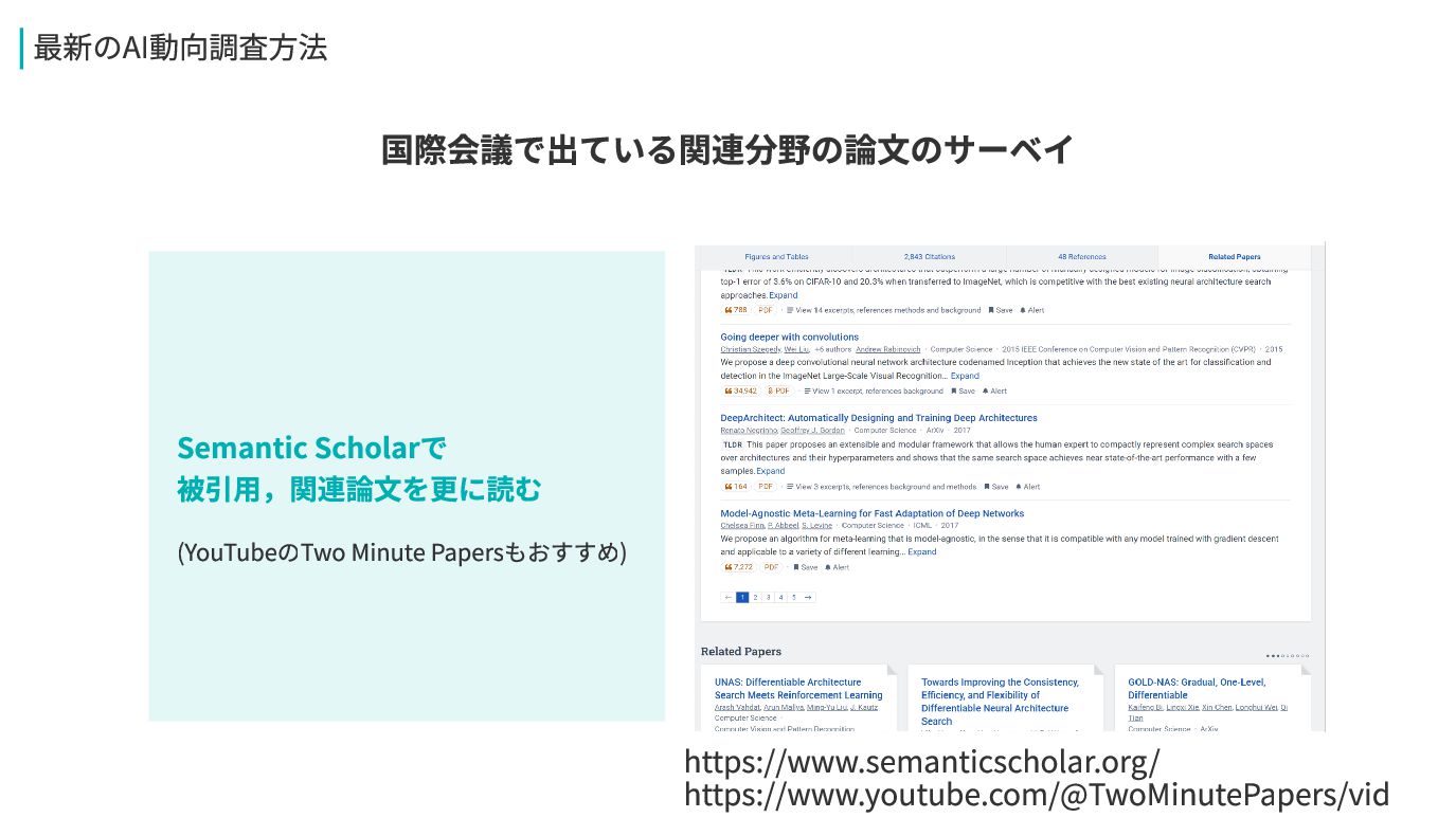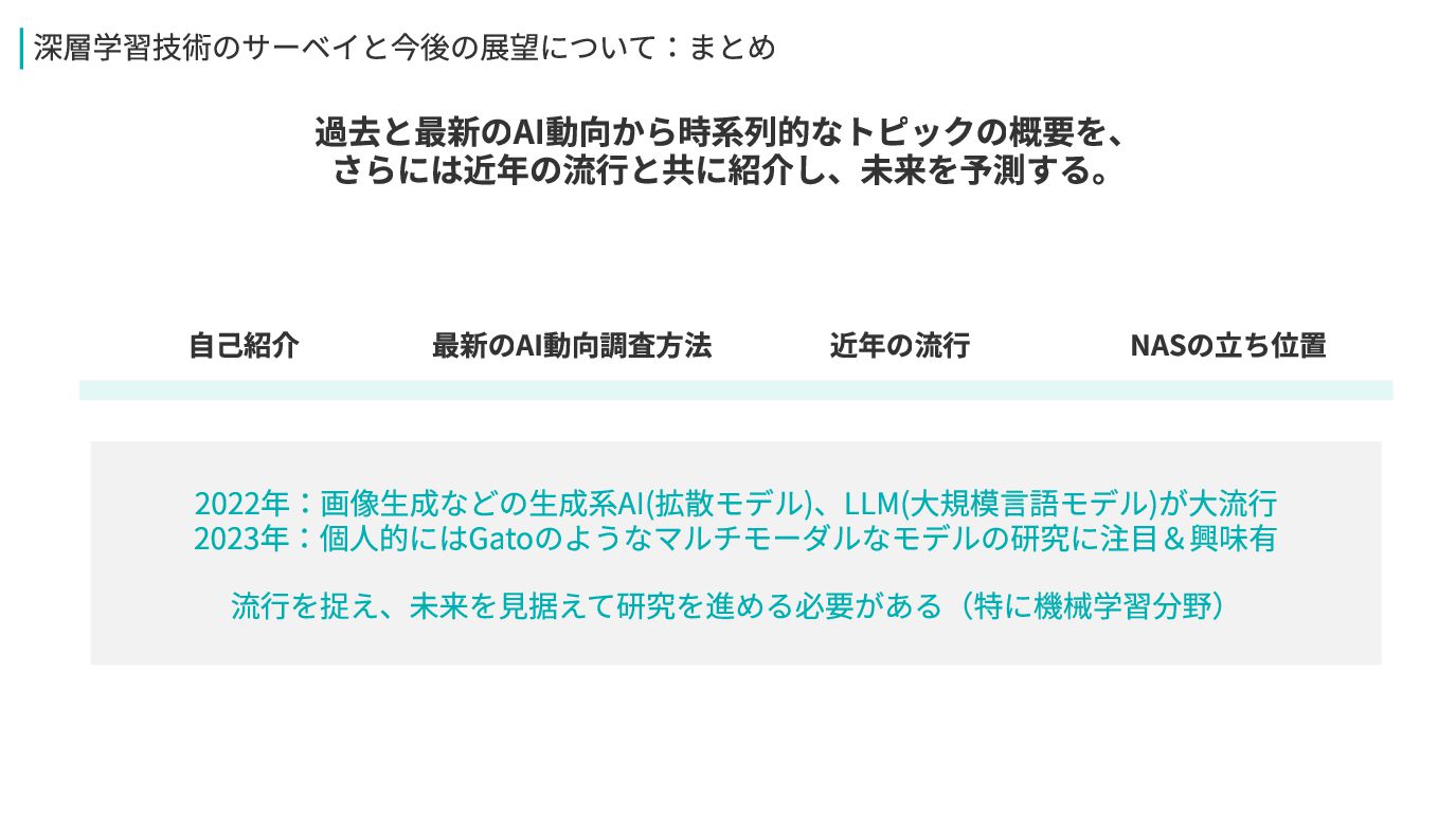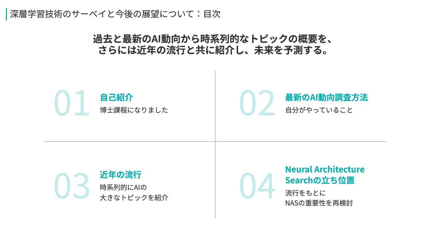 チーム内で使用した発表資料を公開します。 深層学習技術に関する情報のキャッチアップ方法や自分の研究分野のNeural Architecture Search(NAS)の立ち位置について再考しています。 参考文献ArXiv多めです(時間あれば正式な論文の方に変えときます)