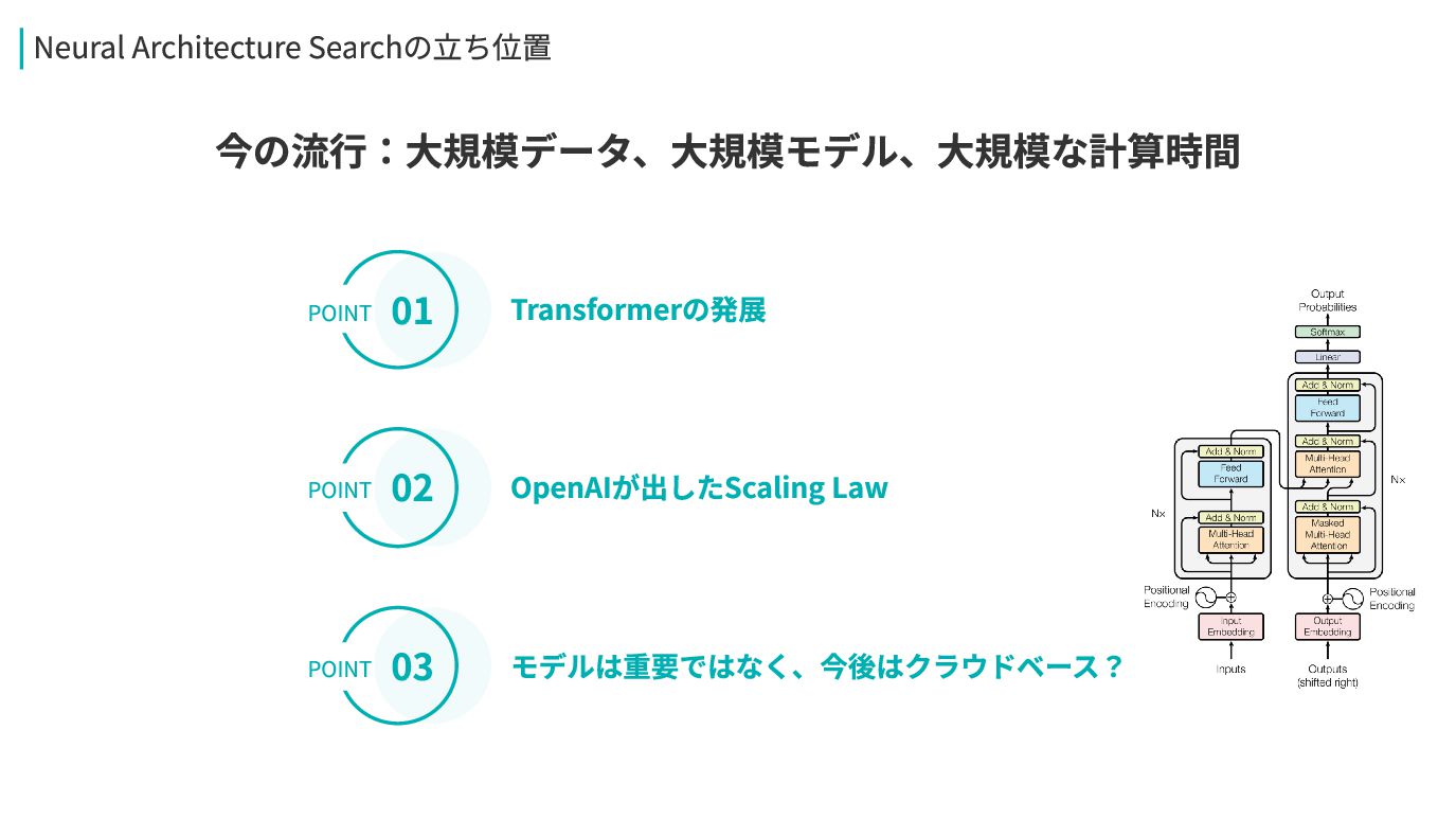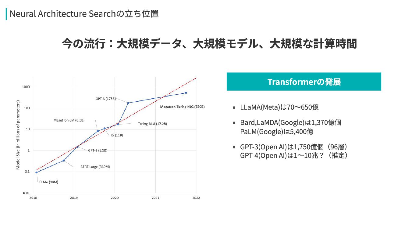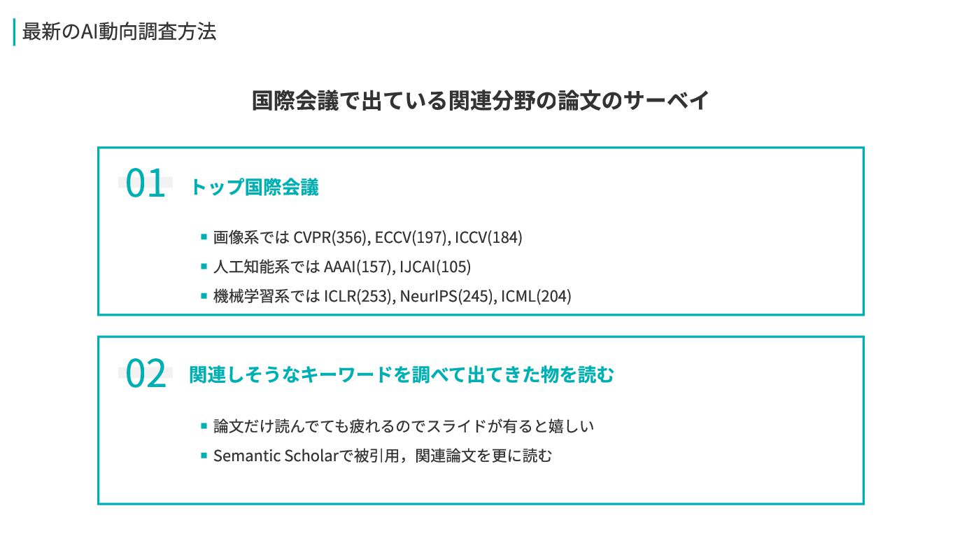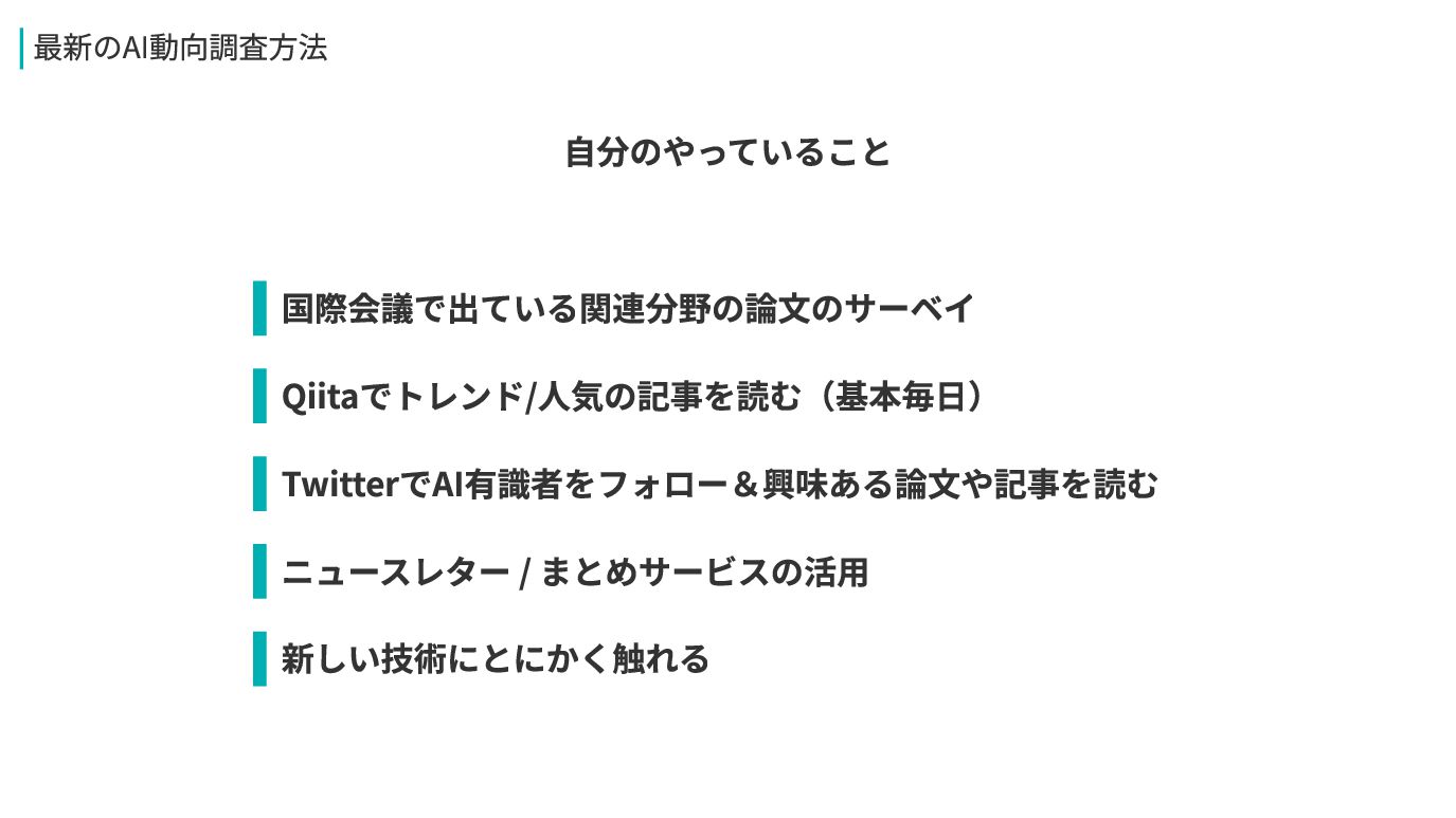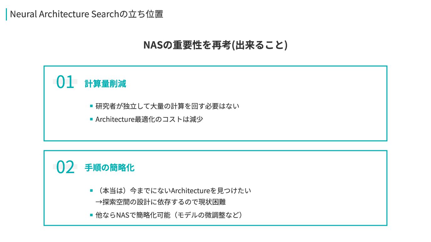 チーム内で使用した発表資料を公開します。 深層学習技術に関する情報のキャッチアップ方法や自分の研究分野のNeural Architecture Search(NAS)の立ち位置について再考しています。 参考文献ArXiv多めです(時間あれば正式な論文の方に変えときます)