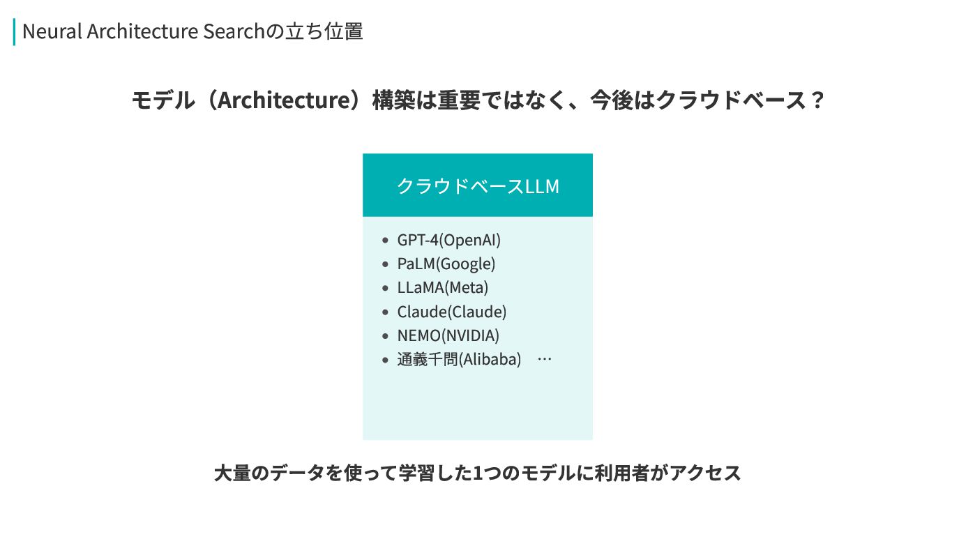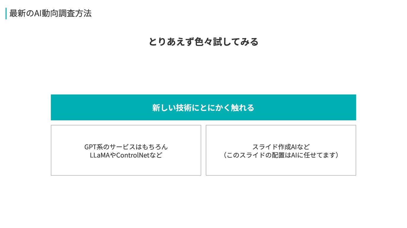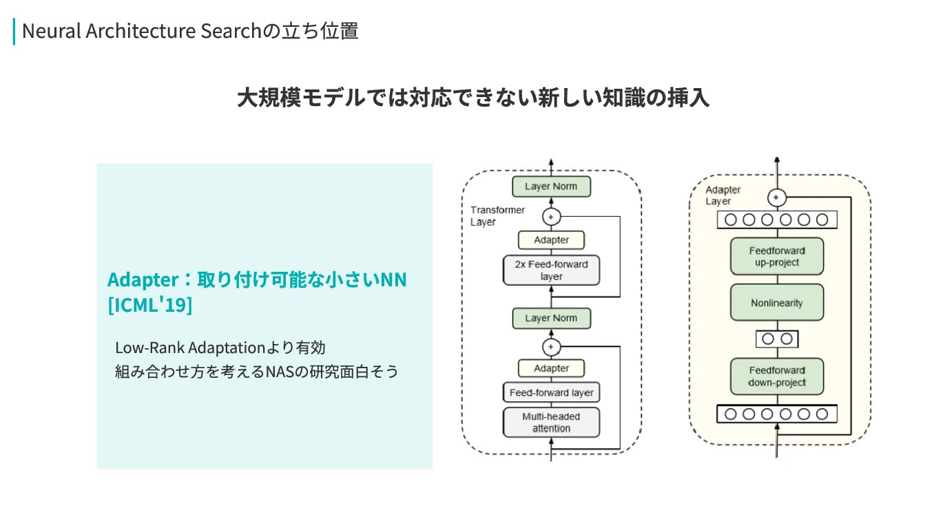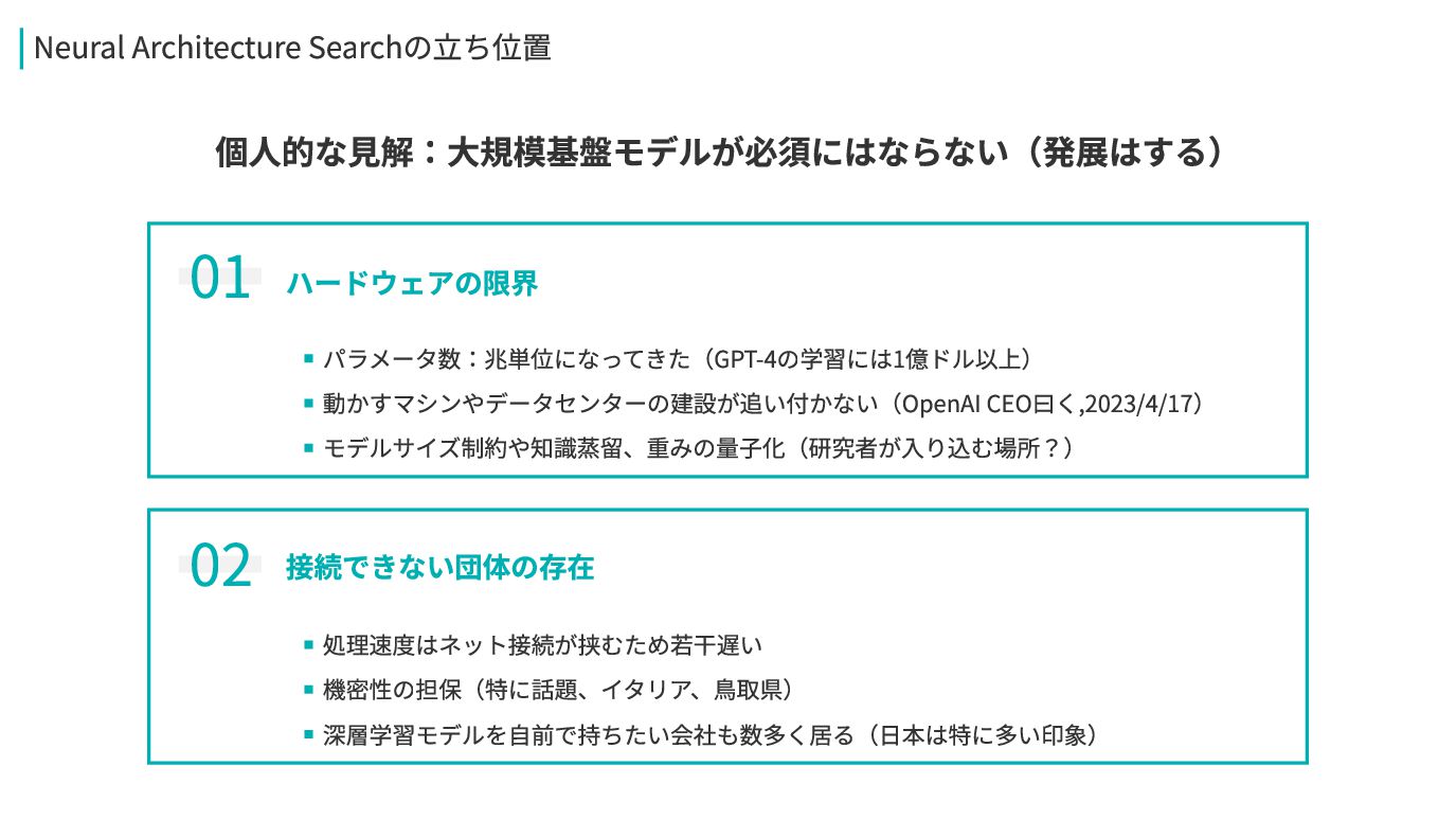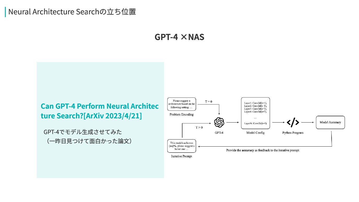 チーム内で使用した発表資料を公開します。 深層学習技術に関する情報のキャッチアップ方法や自分の研究分野のNeural Architecture Search(NAS)の立ち位置について再考しています。 参考文献ArXiv多めです(時間あれば正式な論文の方に変えときます)