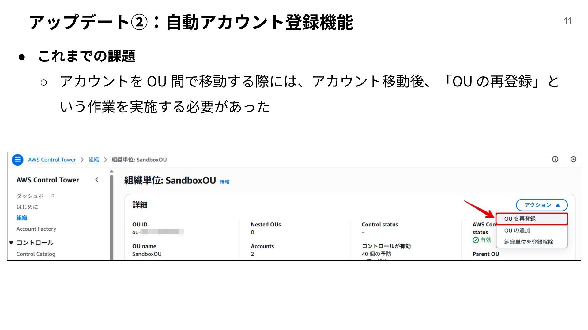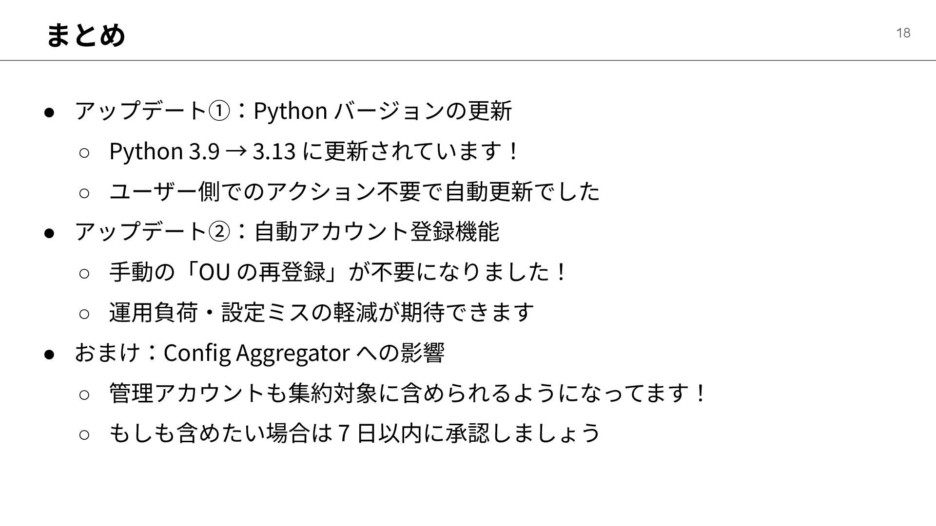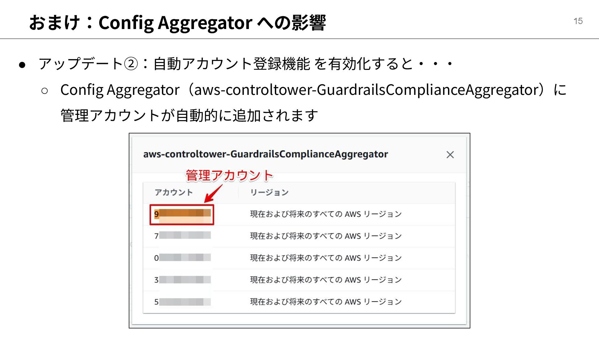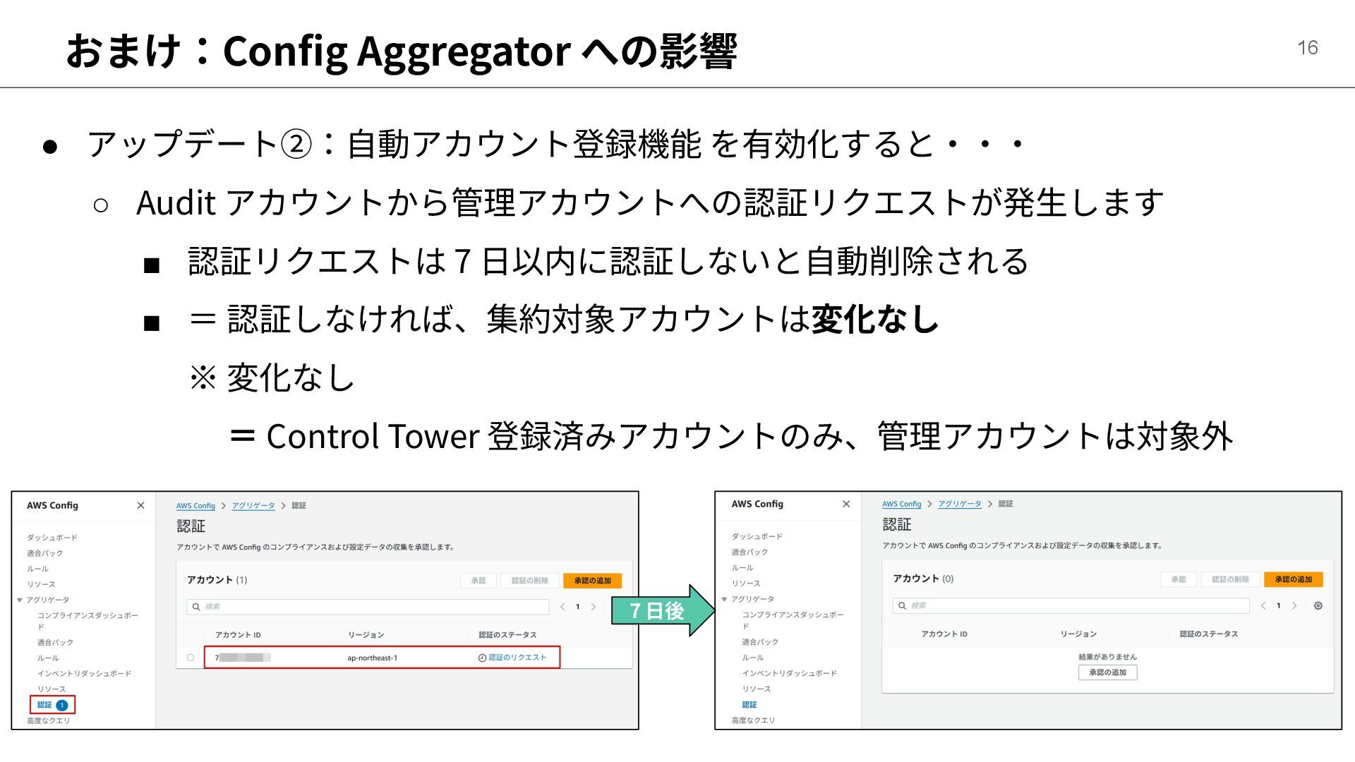に更新されています! ◦ ユーザー側でのアクション不要で⾃動更新でした • アップデート②:⾃動アカウント登録機能 ◦ ⼿動の「OU の再登録」が不要になりました! ◦ 運⽤負荷‧設定ミスの軽減が期待できます • おまけ:Config Aggregator への影響 ◦ 管理アカウントも集約対象に含められるようになってます! ◦ もしも含めたい場合は 7 ⽇以内に承認しましょう