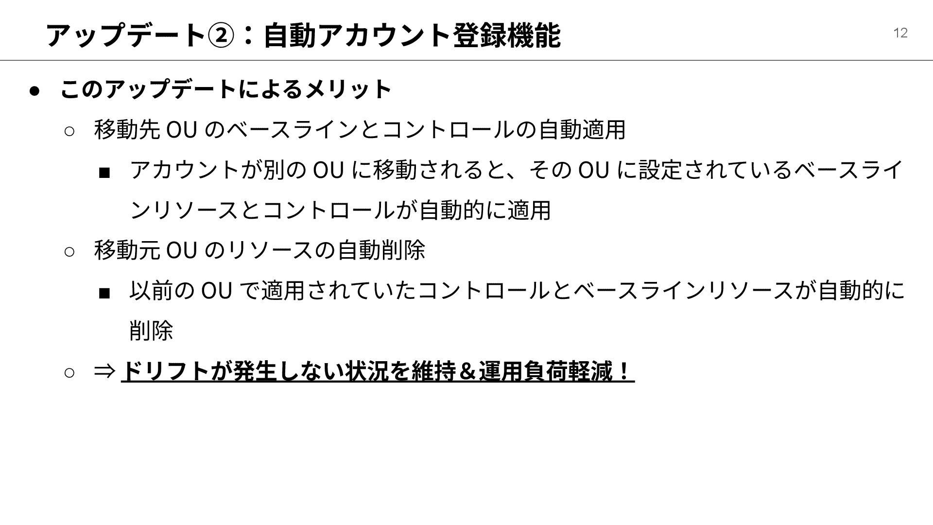 アップデート②:⾃動アカウント登録機能 12 • このアップデートによるメリット ◦ 移動先 OU のベースラインとコントロールの⾃動適⽤ ▪ アカウントが別の