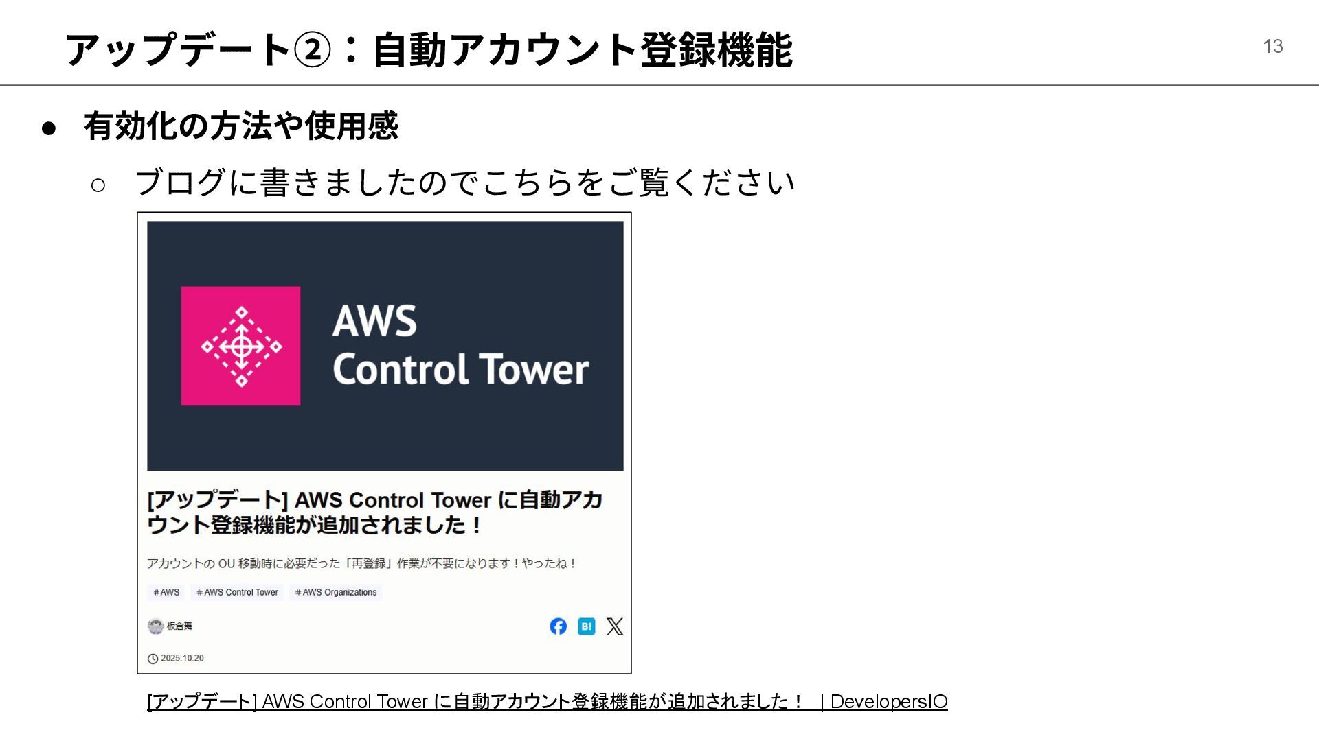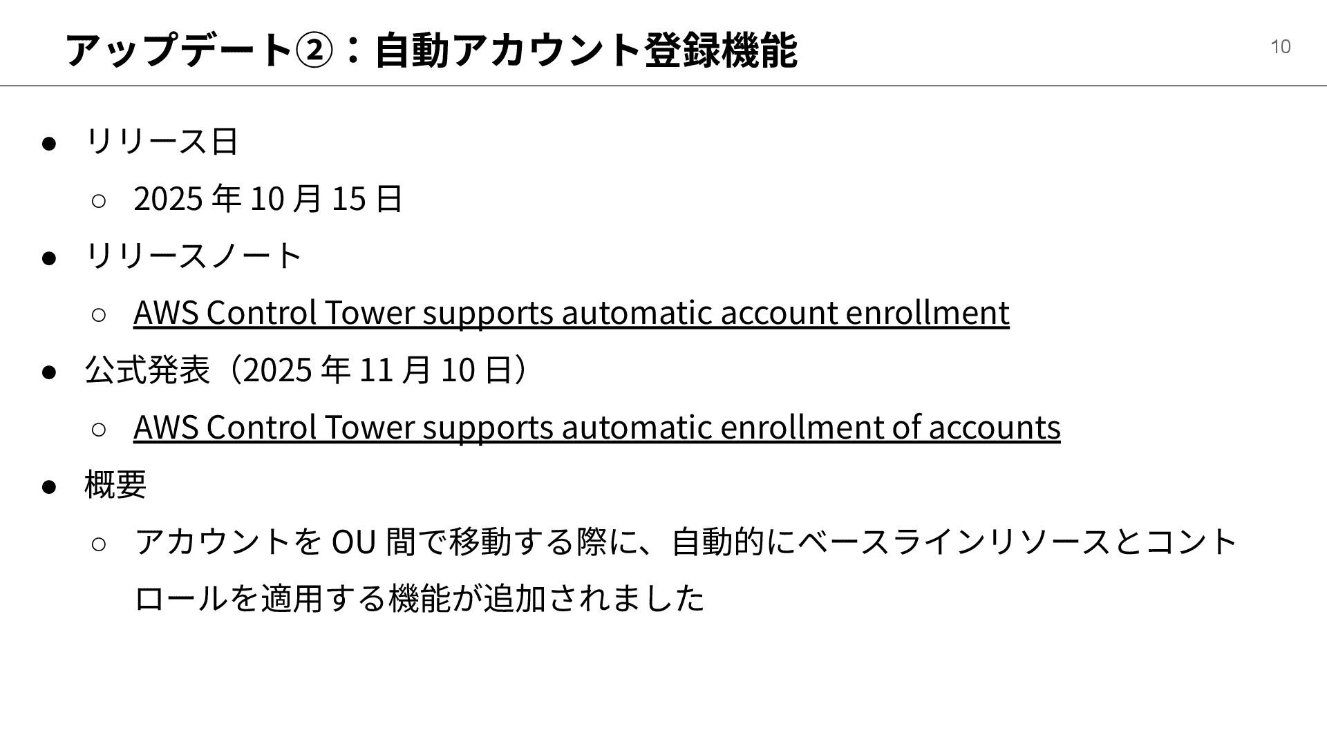 ⽇ • リリースノート ◦ AWS Control Tower supports automatic account enrollment • 公式発表(2025 年 11 ⽉ 10 ⽇) ◦ AWS Control Tower supports automatic enrollment of accounts • 概要 ◦ アカウントを OU 間で移動する際に、⾃動的にベースラインリソースとコント ロールを適⽤する機能が追加されました