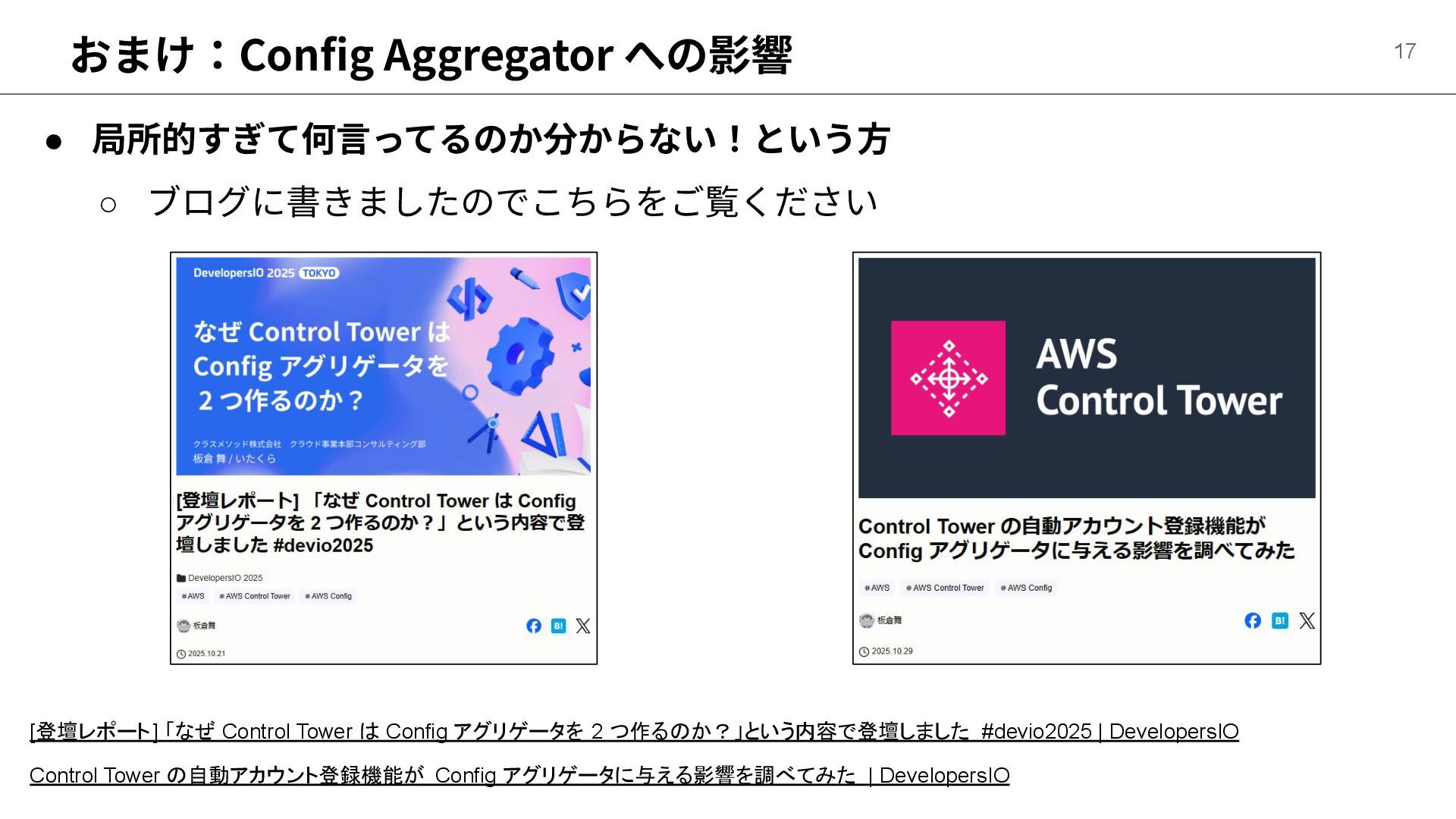の自動アカウント登録機能が Config アグリゲータに与える影響を調べてみた | DevelopersIO [登壇レポート] 「なぜ Control Tower は Config アグリゲータを 2 つ作るのか?」という内容で登壇しました #devio2025 | DevelopersIO