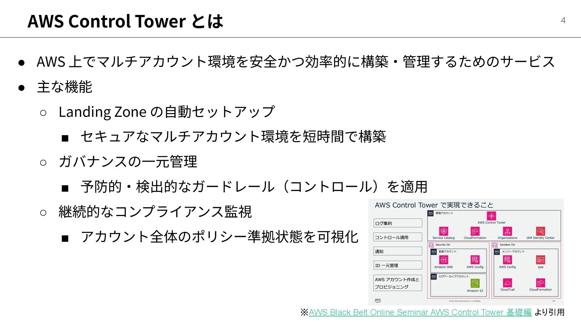 ◦ Landing Zone の⾃動セットアップ ▪ セキュアなマルチアカウント環境を短時間で構築 ◦ ガバナンスの⼀元管理 ▪ 予防的‧検出的なガードレール(コントロール)を適⽤ ◦ 継続的なコンプライアンス監視 ▪ アカウント全体のポリシー準拠状態を可視化 ※AWS Black Belt Online Seminar AWS Control Tower 基礎編 より引用