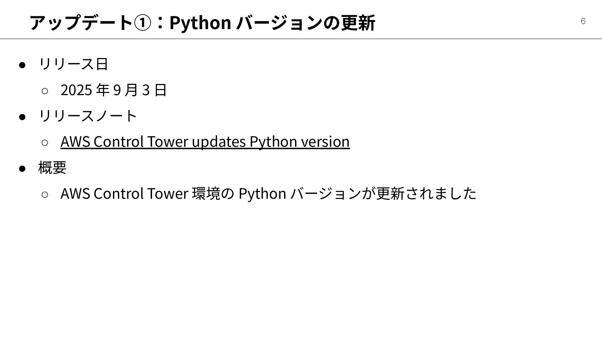 3 ⽇ • リリースノート ◦ AWS Control Tower updates Python version • 概要 ◦ AWS Control Tower 環境の Python バージョンが更新されました