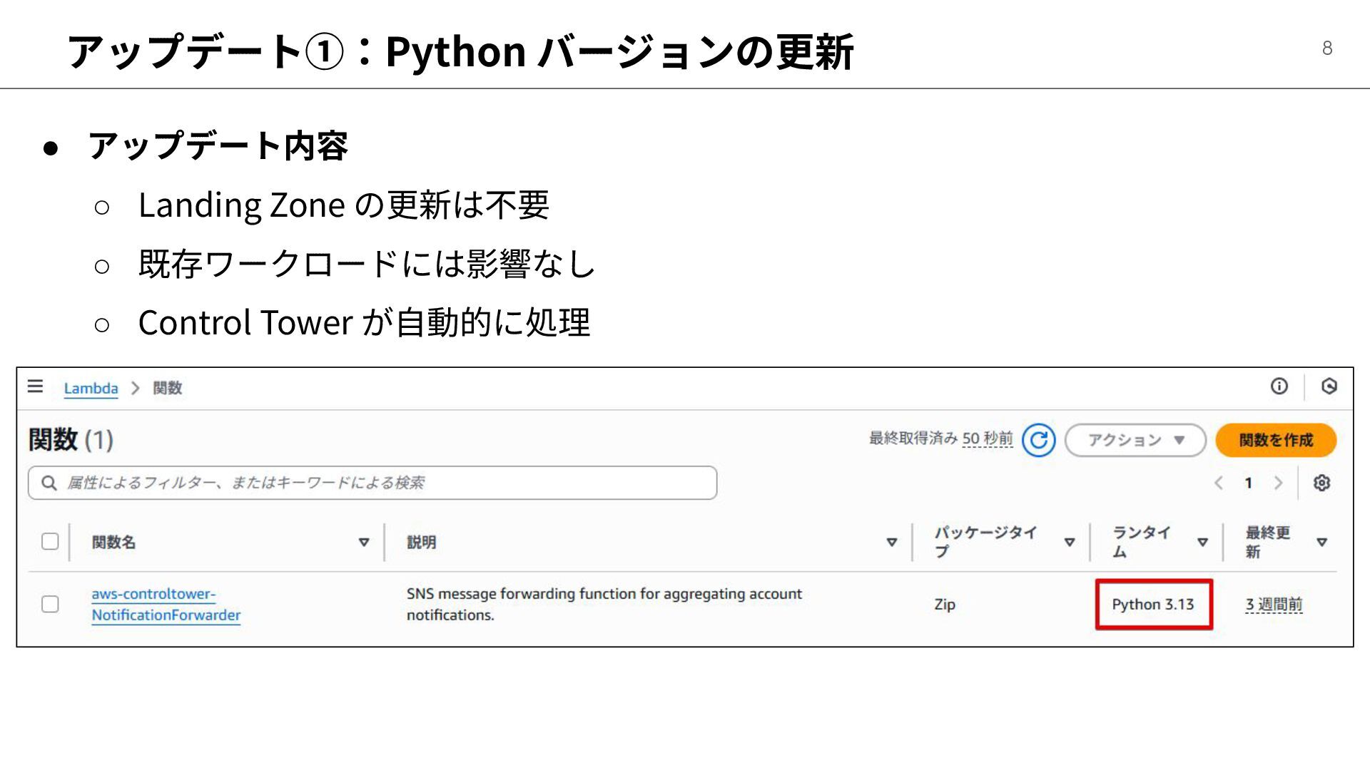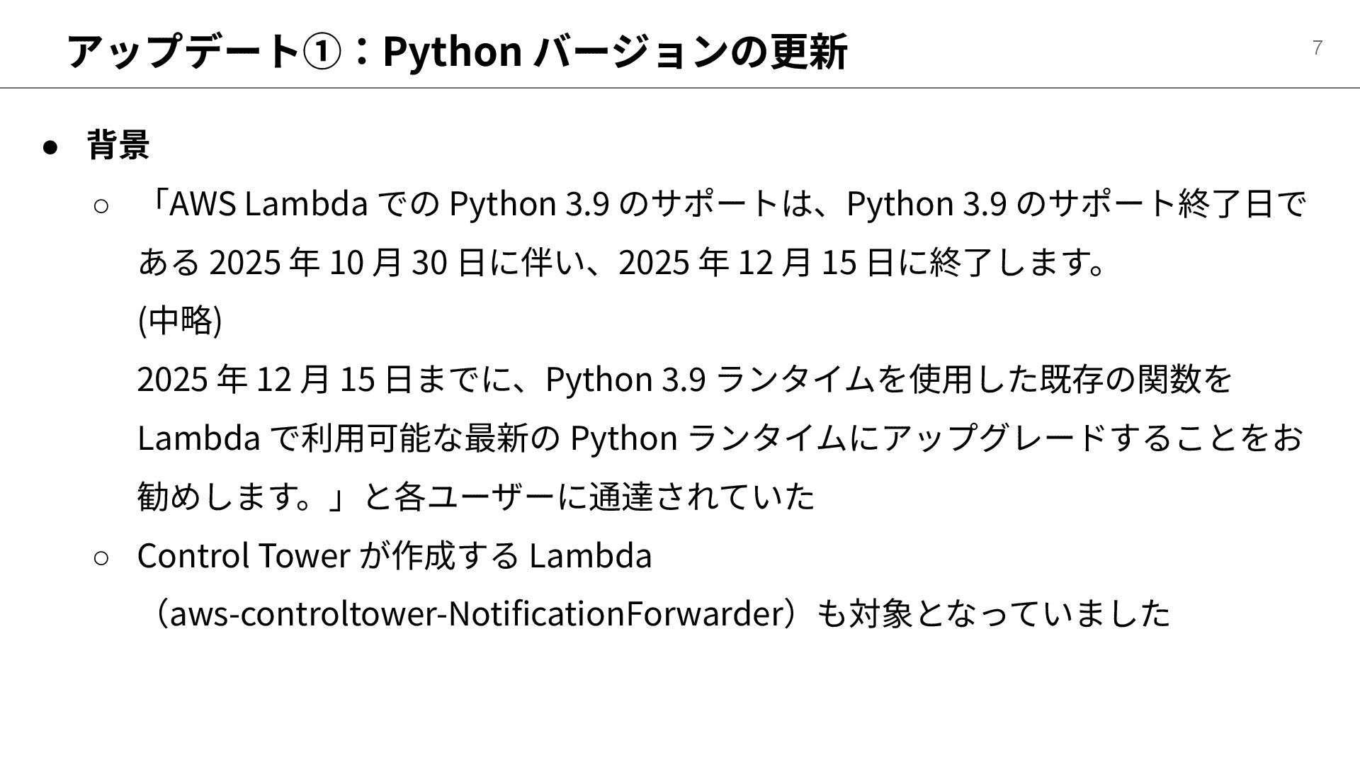 3.9 のサポートは、Python 3.9 のサポート終了⽇で ある 2025 年 10 ⽉ 30 ⽇に伴い、2025 年 12 ⽉ 15 ⽇に終了します。 (中略) 2025 年 12 ⽉ 15 ⽇までに、Python 3.9 ランタイムを使⽤した既存の関数を Lambda で利⽤可能な最新の Python ランタイムにアップグレードすることをお 勧めします。」と各ユーザーに通達されていた ◦ Control Tower が作成する Lambda (aws-controltower-NotificationForwarder)も対象となっていました