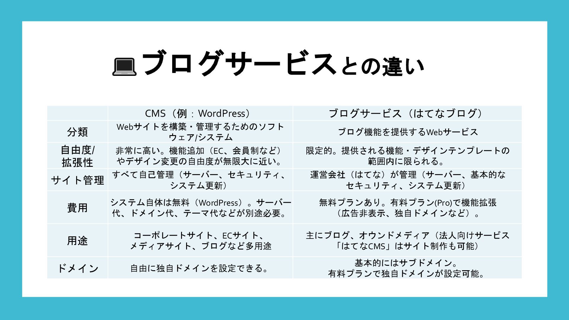 やデザイン変更の自由度が無限大に近い。 限定的。提供される機能・デザインテンプレートの 範囲内に限られる。 サイト管理 すべて自己管理(サーバー、セキュリティ、 システム更新) 運営会社(はてな)が管理(サーバー、基本的な セキュリティ、システム更新) 費用 システム自体は無料(WordPress)。サーバー 代、ドメイン代、テーマ代などが別途必要。 無料プランあり。有料プラン(Pro)で機能拡張 (広告非表示、独自ドメインなど)。 用途 コーポレートサイト、ECサイト、 メディアサイト、ブログなど多用途 主にブログ、オウンドメディア(法人向けサービス 「はてなCMS」はサイト制作も可能) ドメイン 自由に独自ドメインを設定できる。 基本的にはサブドメイン。 有料プランで独自ドメインが設定可能。